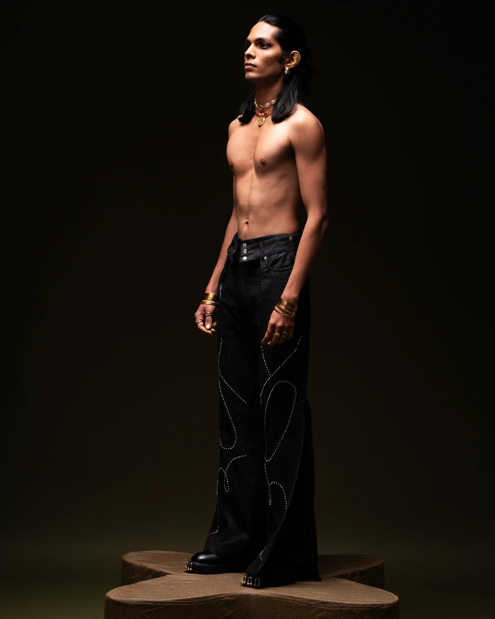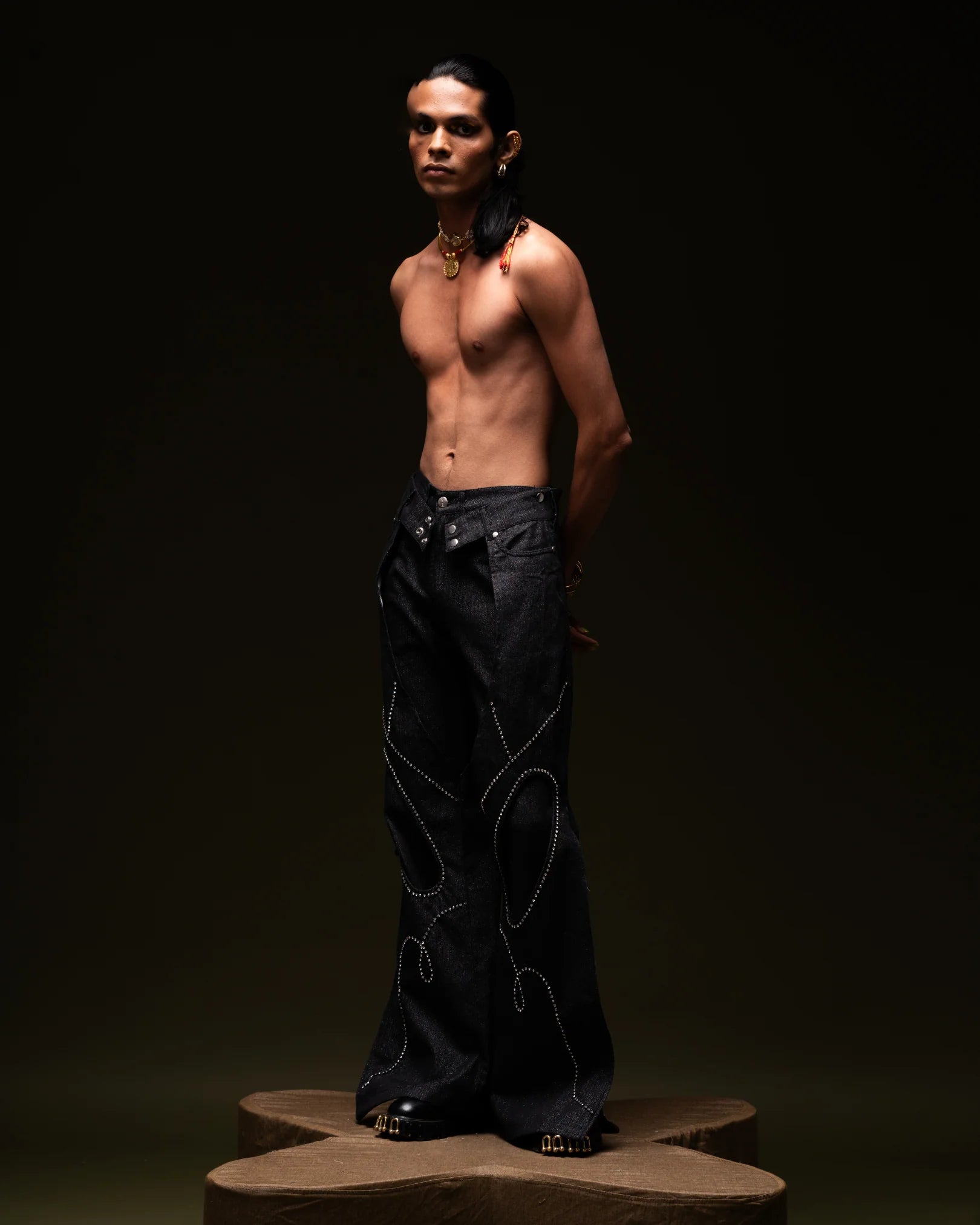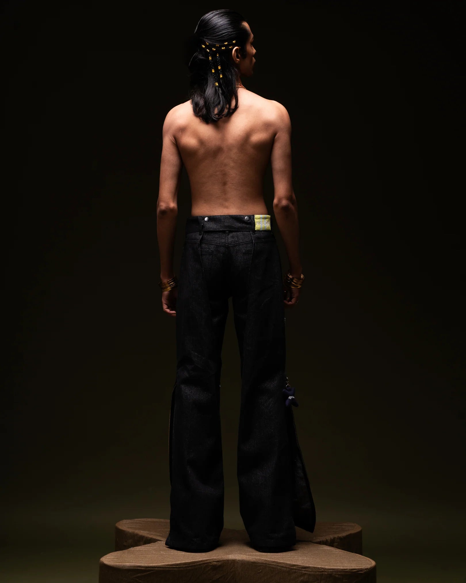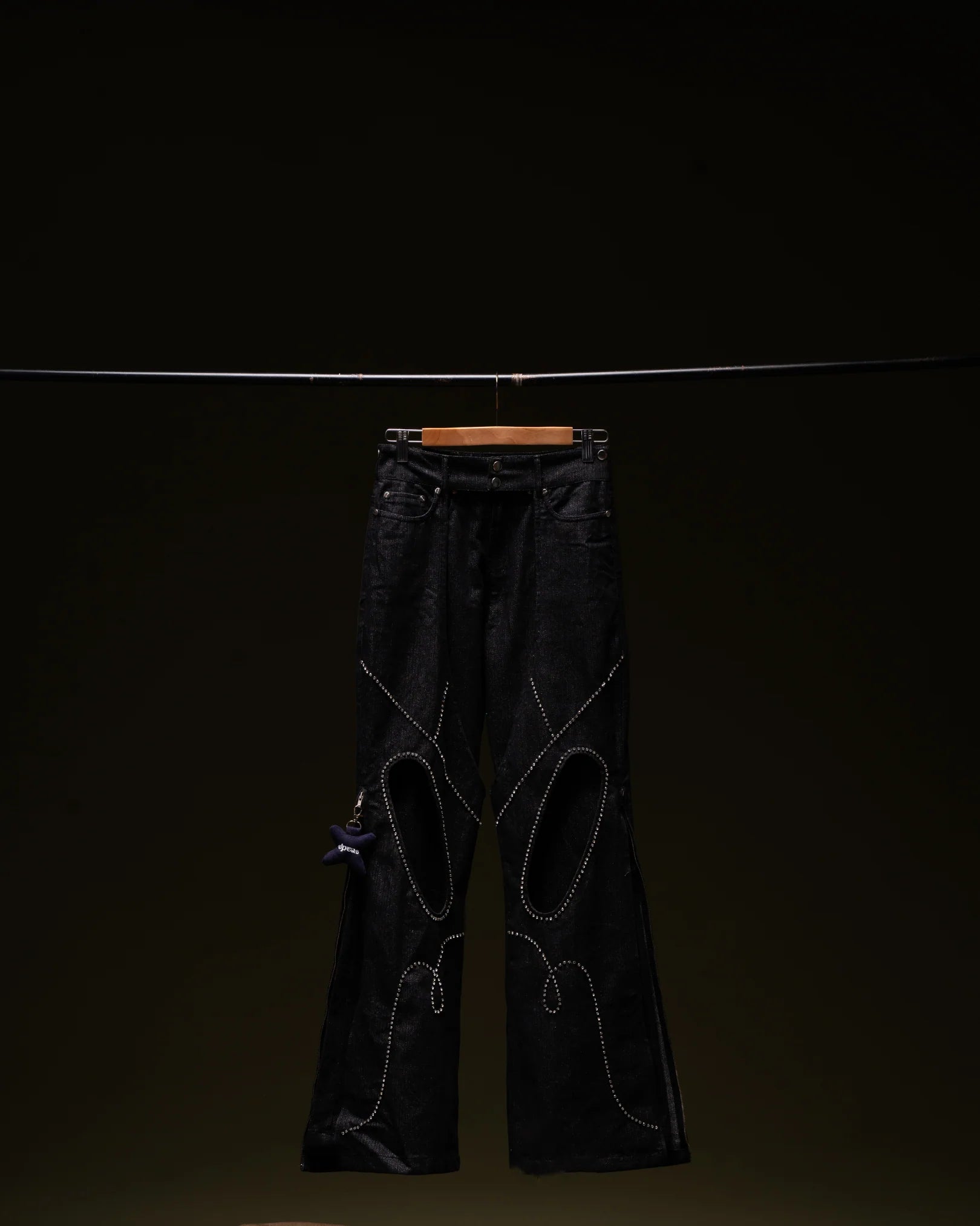 Cover Me Up are black zari denim layering pants crafted from varying shades of denim. The outer layer features knee cutouts for a cowboy-inspired look and side zippers at the bottom. With detailed beaded embroidery across the front, these pants offer versatile styling options—you can wear the outer layer with any other denim for multiple looks.