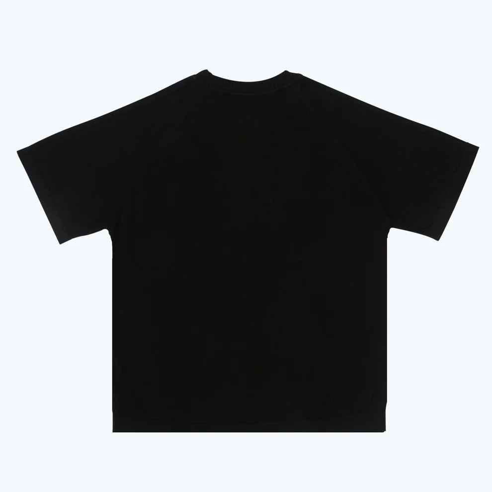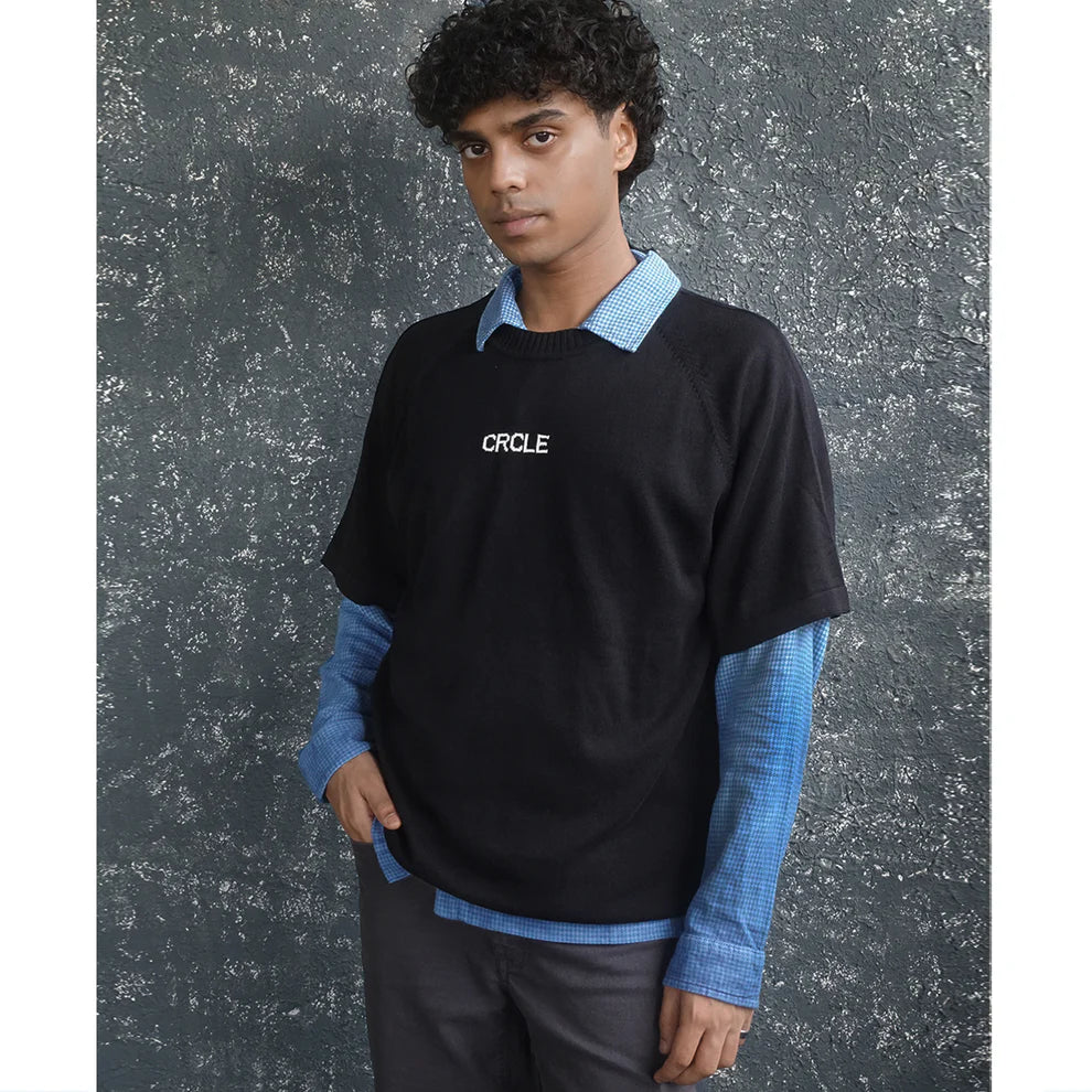 Black T-shirt with raglan sleeve and Intarsia knitted CRCLE logo in off-white on the front.
