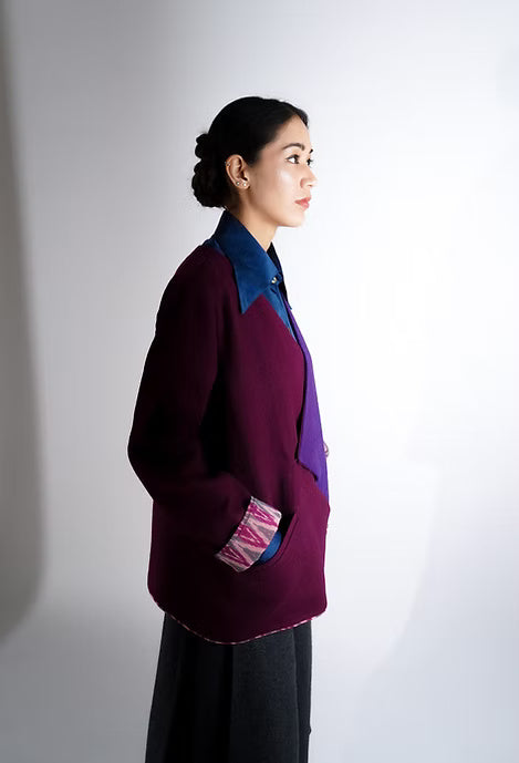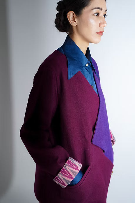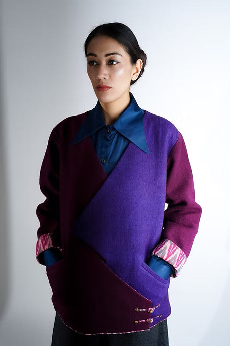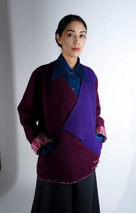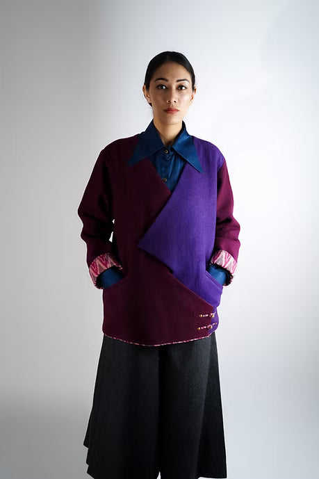 A pure handspun and handwoven sheep wool , embodying a seamless union of heritage craftsmanship and contemporary elegance. This luxurious piece is a distinguished addition to any wardrobe, offering a rich interplay of texture, structure, and embellishment.