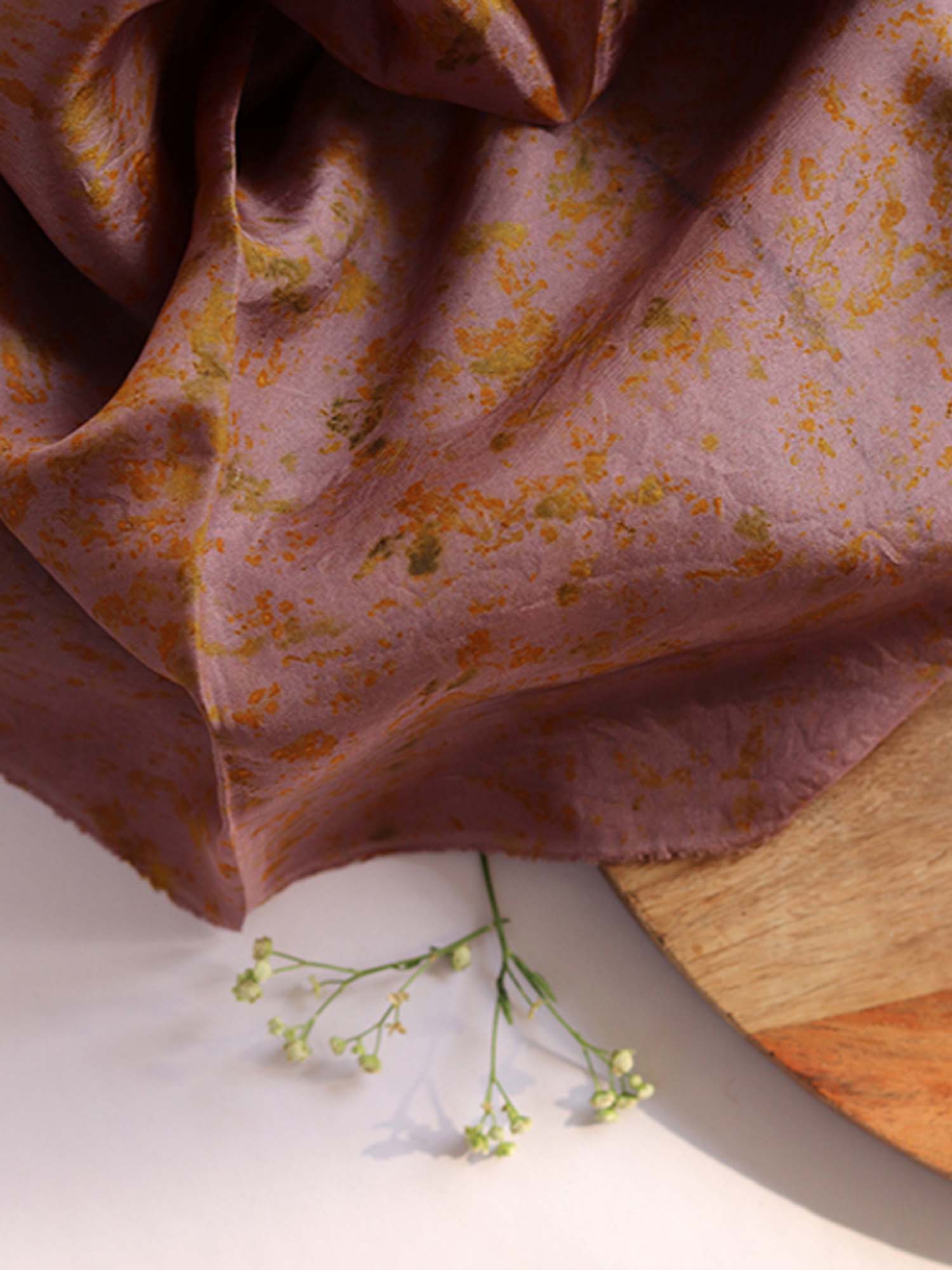 Elevate your textile experience with our exclusive fabric collection. Each piece is meticulously eco-printed with temple flowers, capturing the essence of nature and the sophistication of HABUTAI SILK. Mulya fabric, 44 inches wide, boasts unparalleled beauty and comfort, crafted entirely from luxurious silk. Handmade by skilled artisans from the Himalayan region, each piece is a unique masterpiece