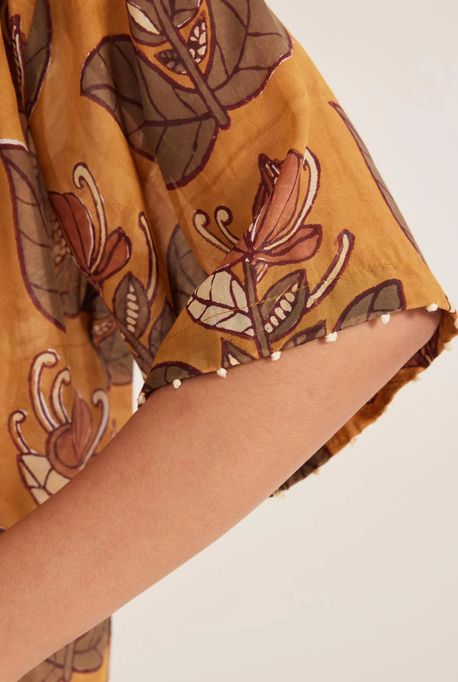 A tshirt so nice, you’ll want to wear it twice. Handblock printed woven t-shirt with a ribbed neck and hand embroidery.