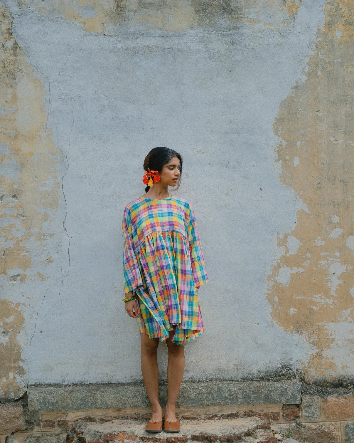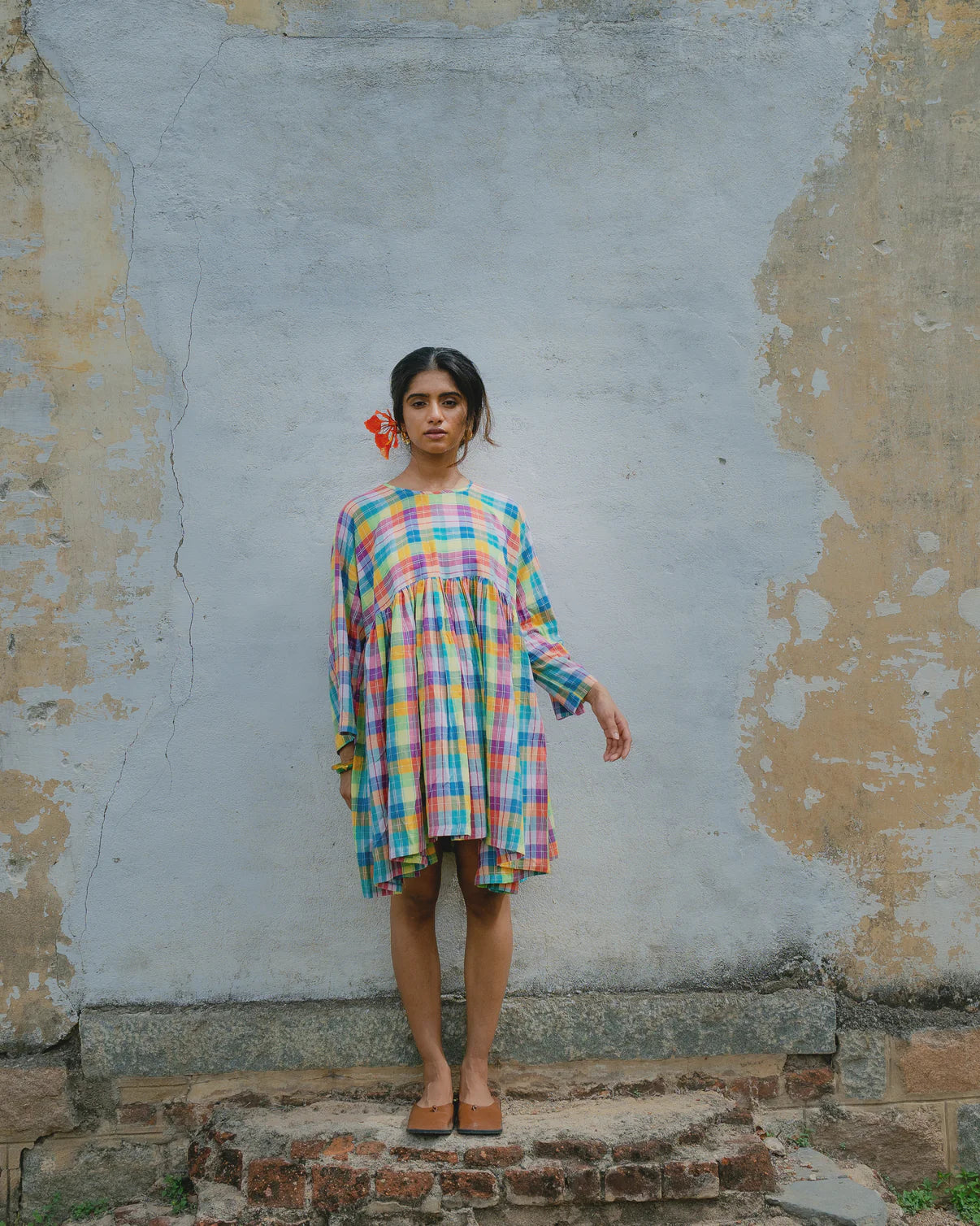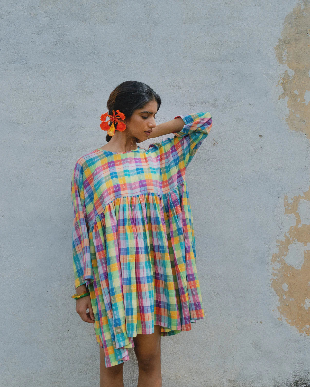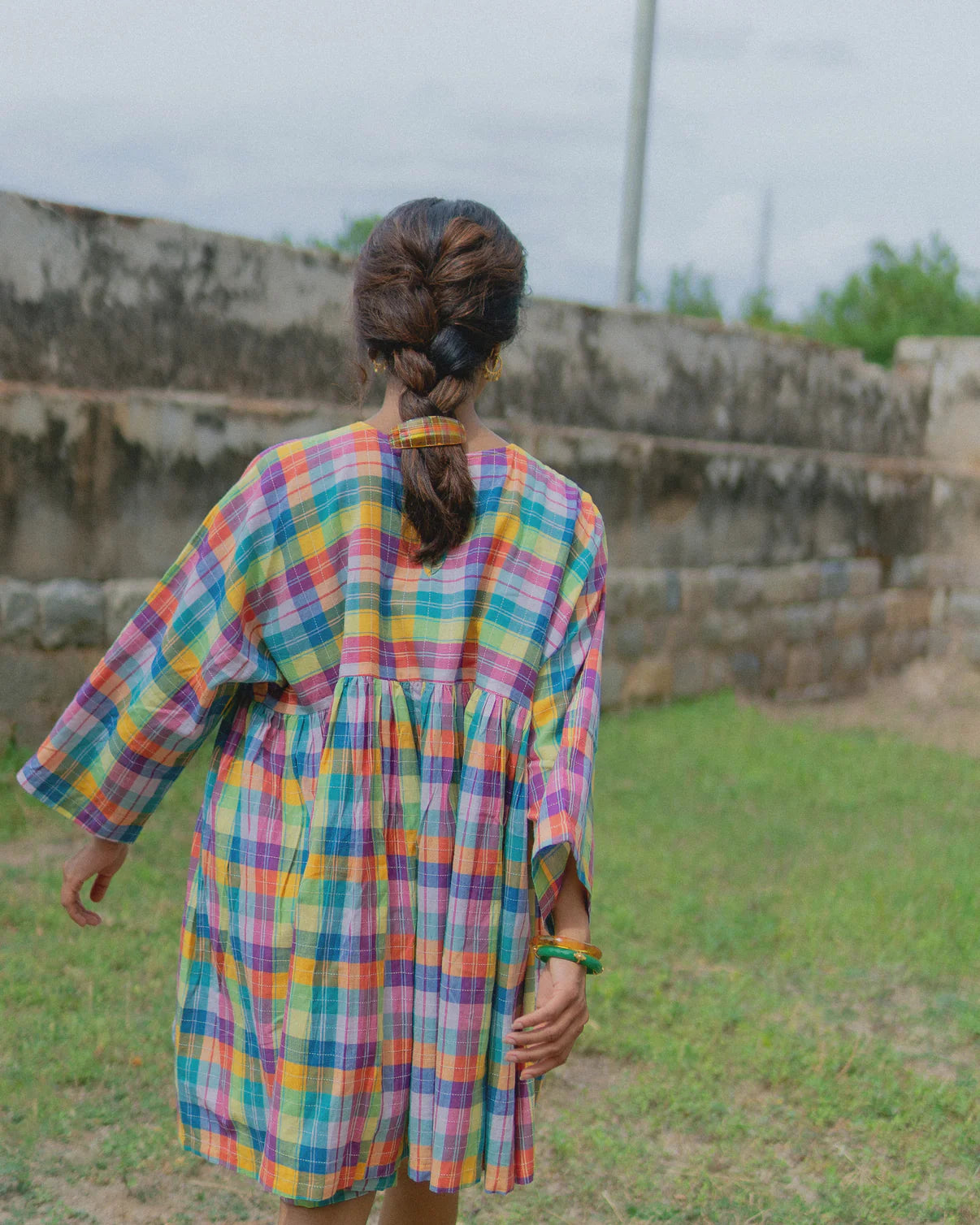 An oversized gathered dress with quarter length sleeves in madras checks with an embellished stitch of Kantha.