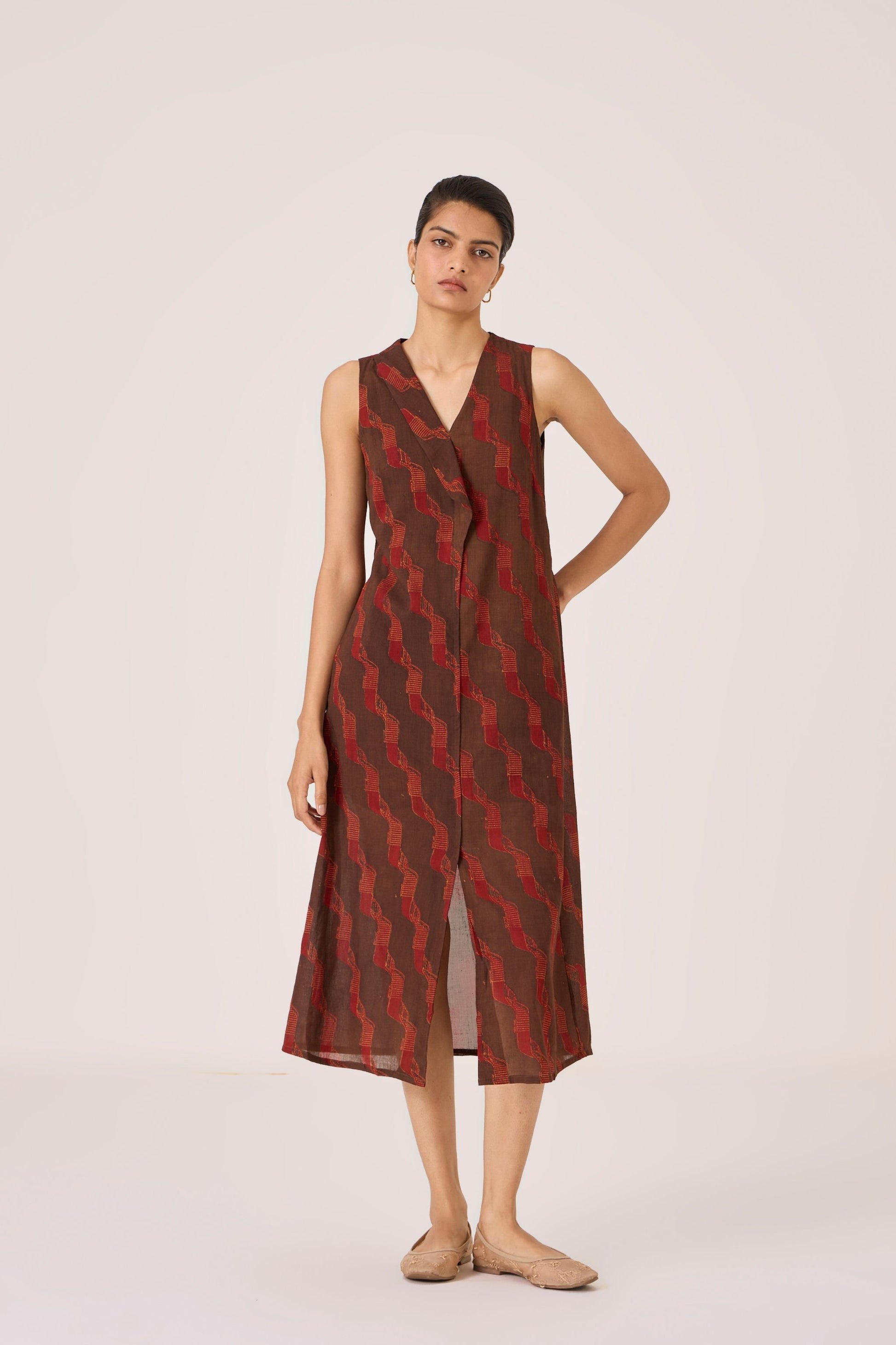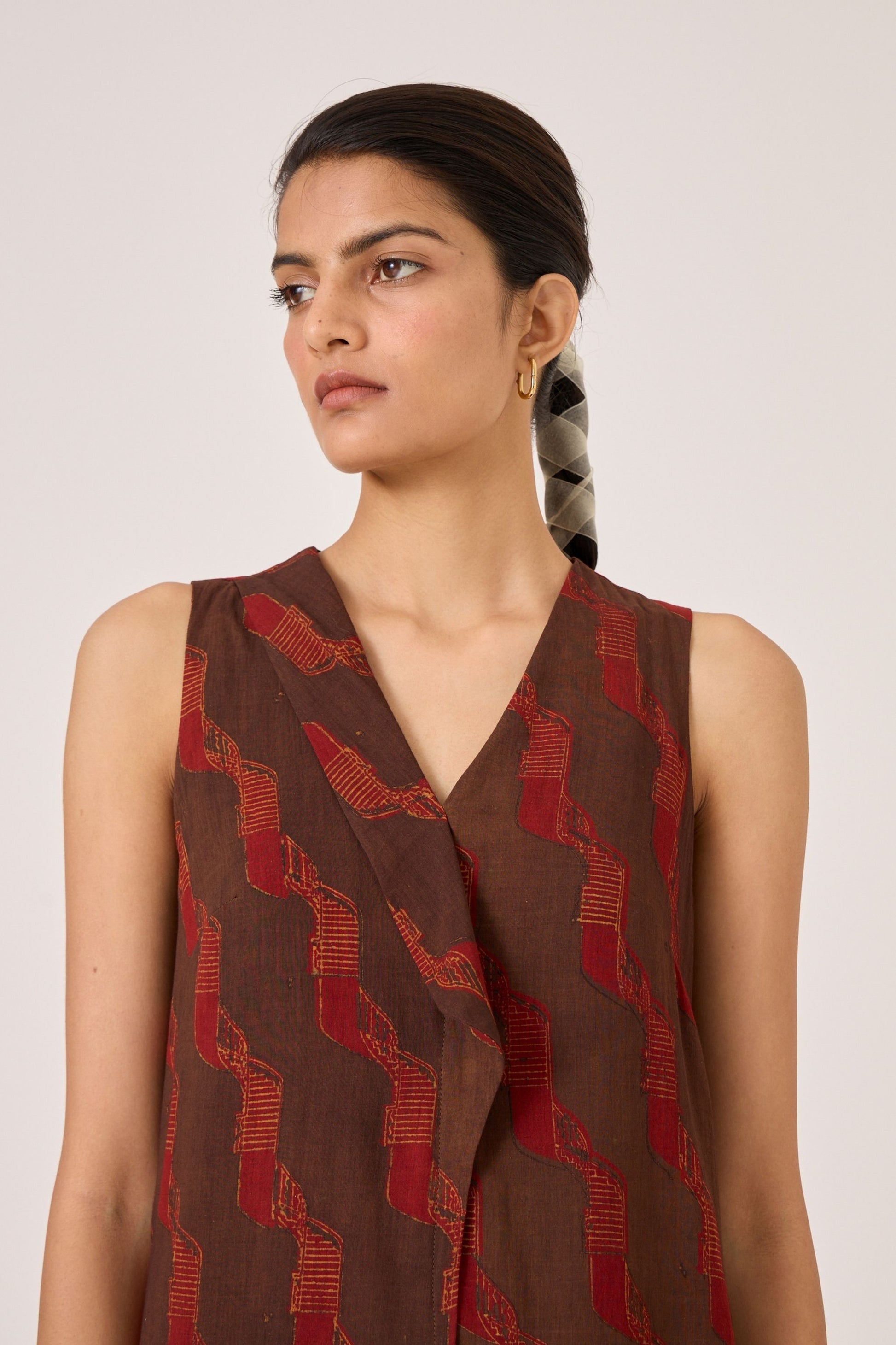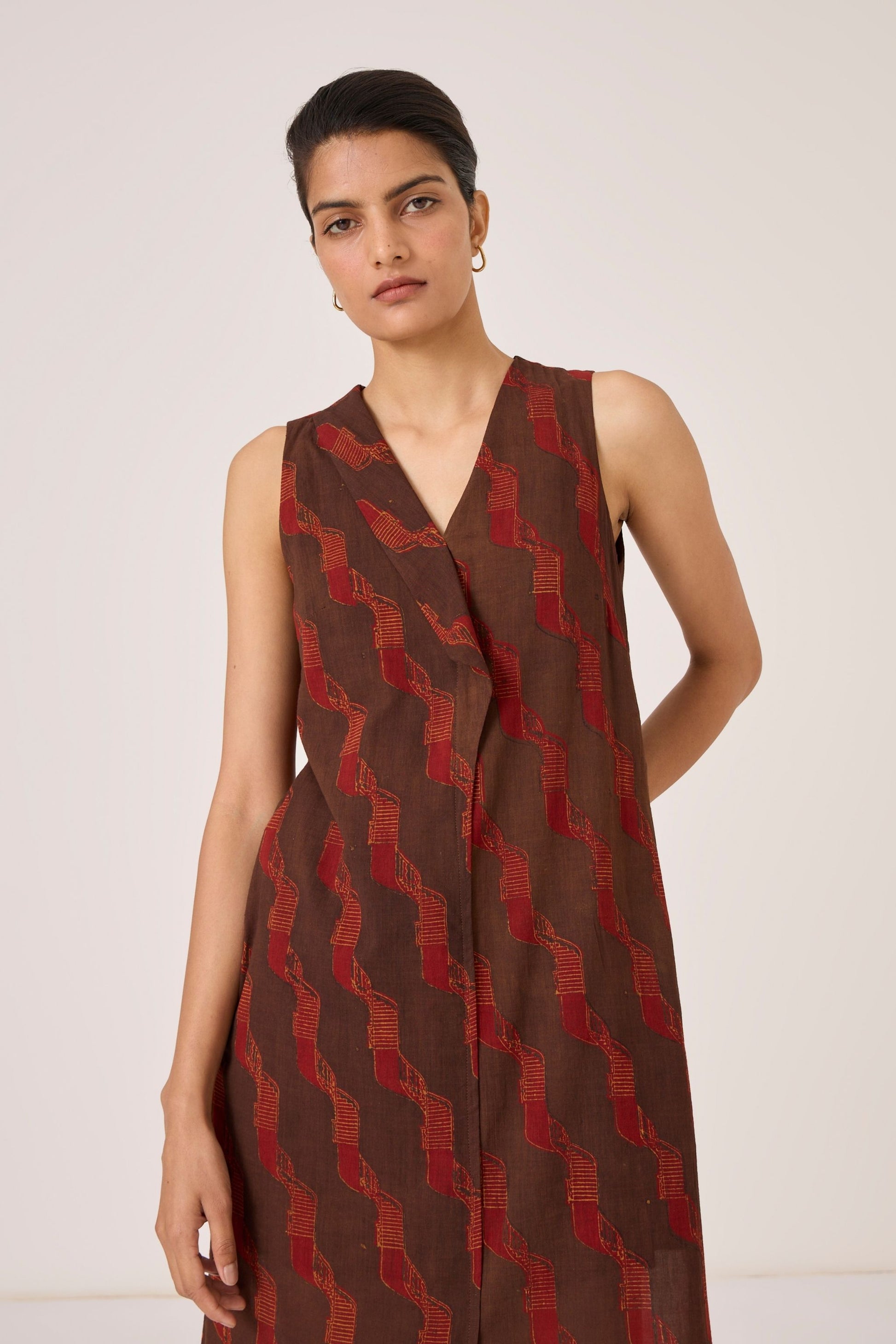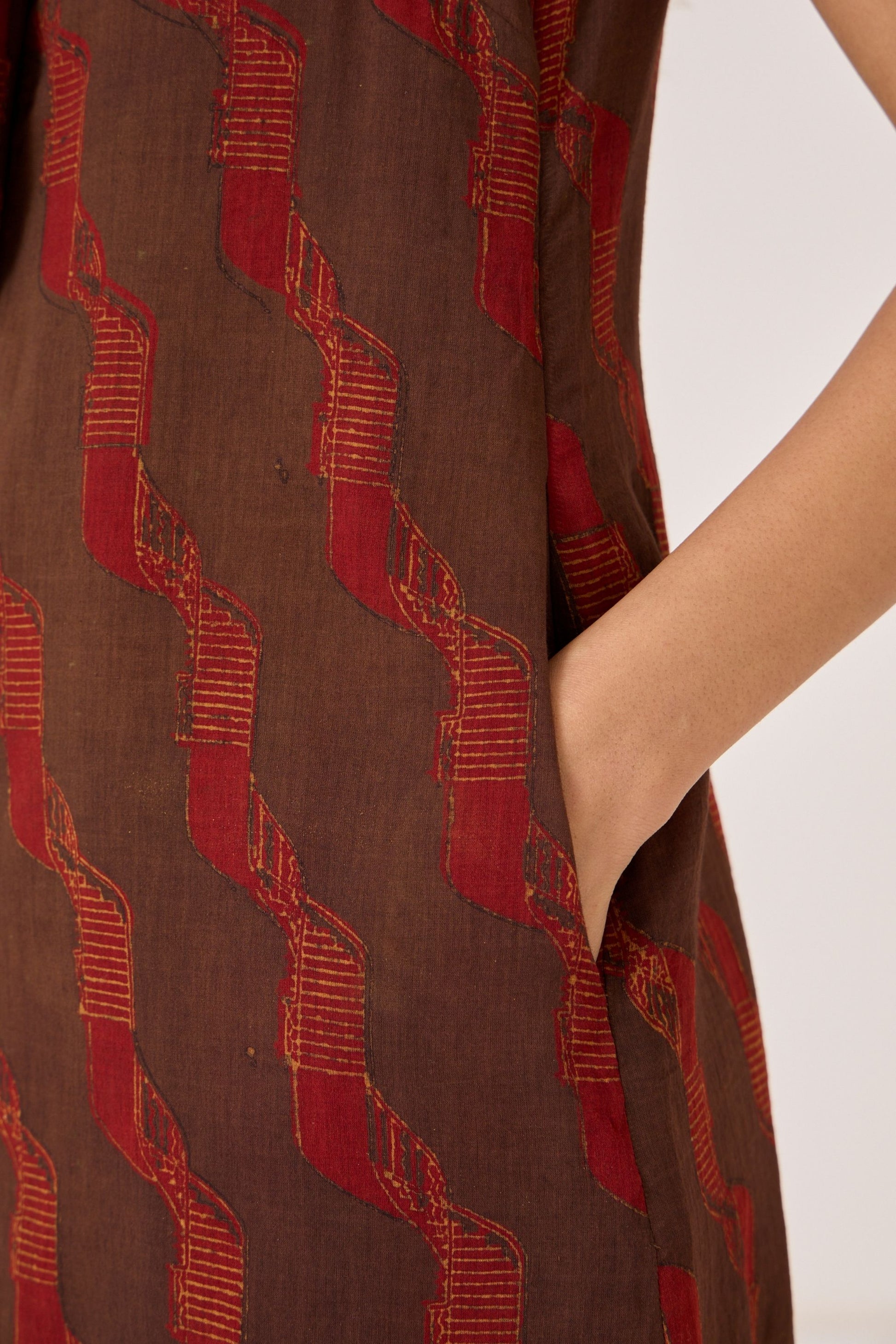 This signature ajrakh block print is designed in our studio and hand block printed by traditional artisans in Gujarat. Print placement may vary from garment to garment. Slight irregularities in print are common and speak to the hand processes involved.