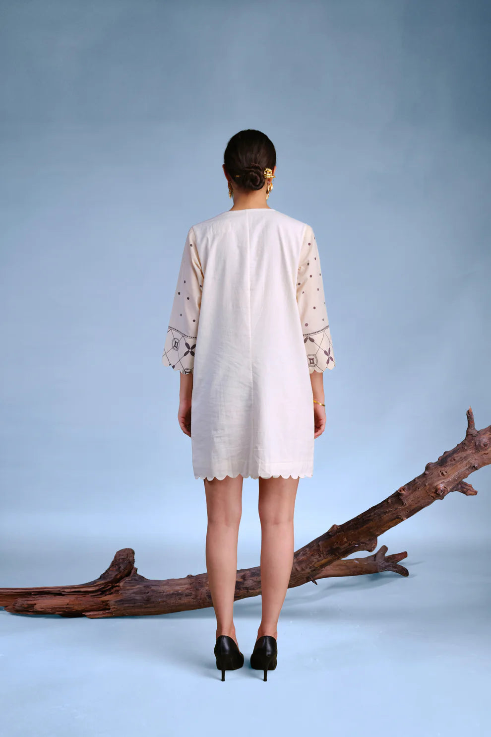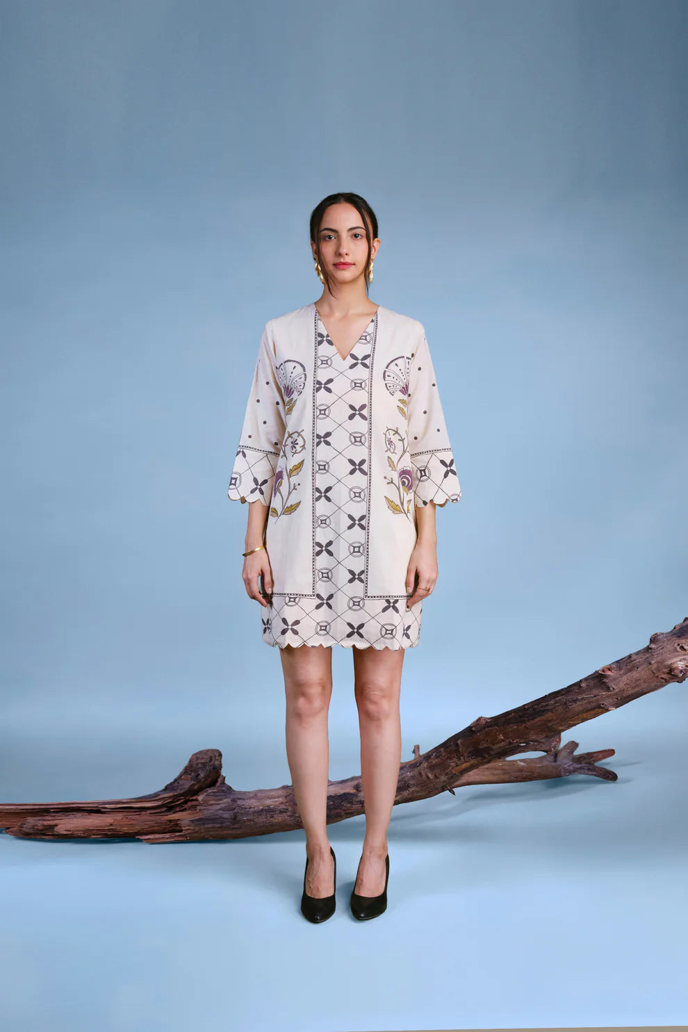 A mini regular fitted A‑line dress with a V neck. The hem of the dress and sleeves feature scallop ends. Mixed-prints painted in kassim, lac, alum, and myrobalan.