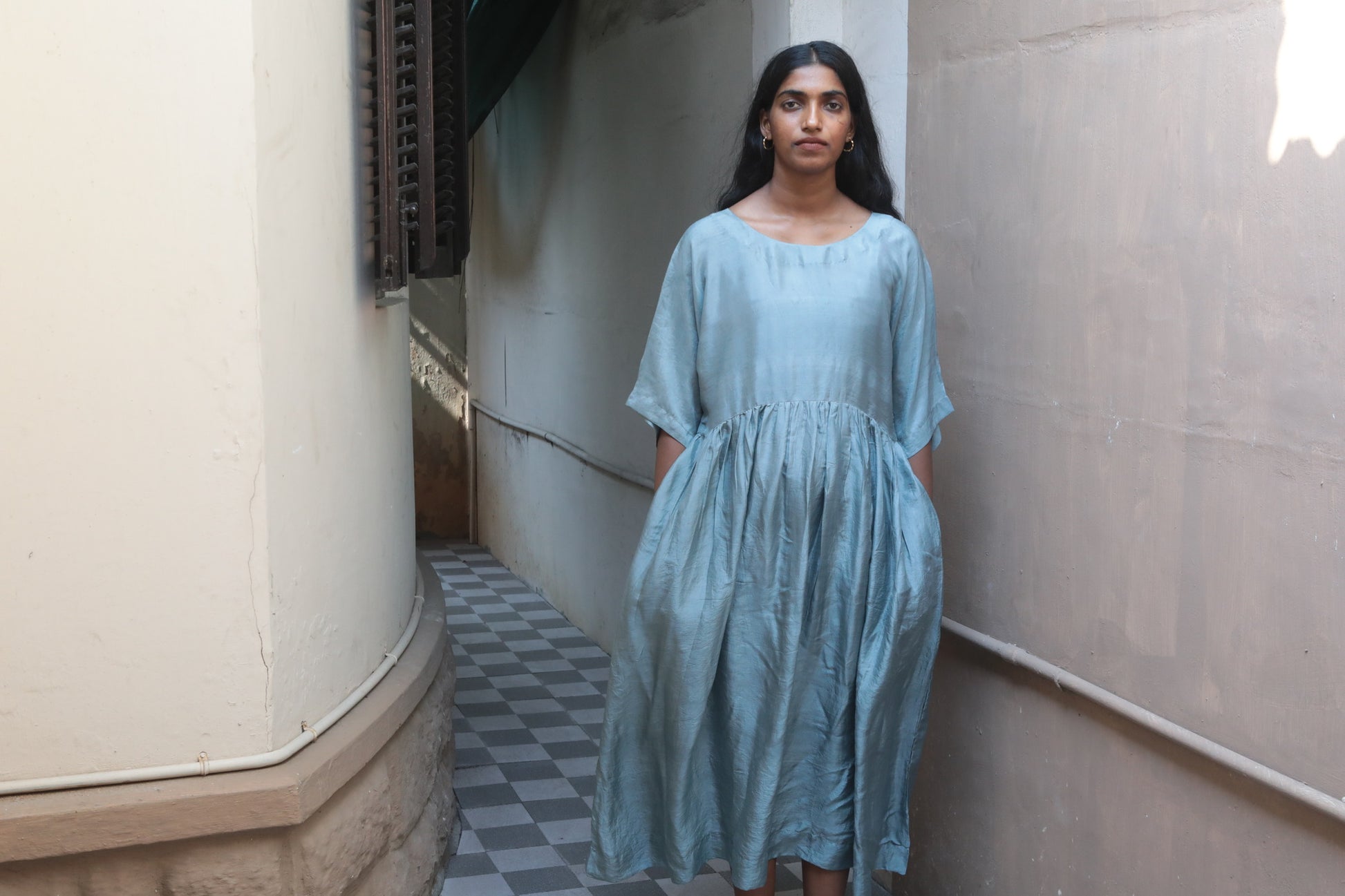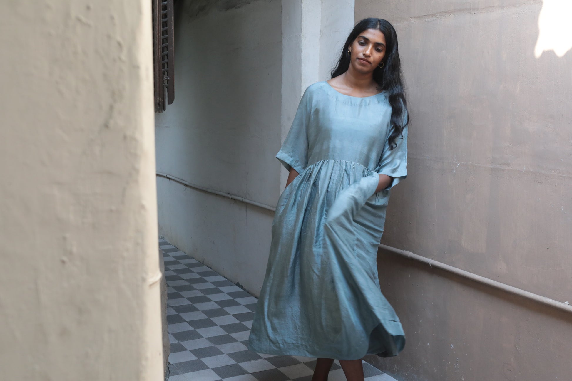 Gathered dress with baggy sleeves and a generous fall in a blue you will come to love! Pockets on either sides, button closure at the back.