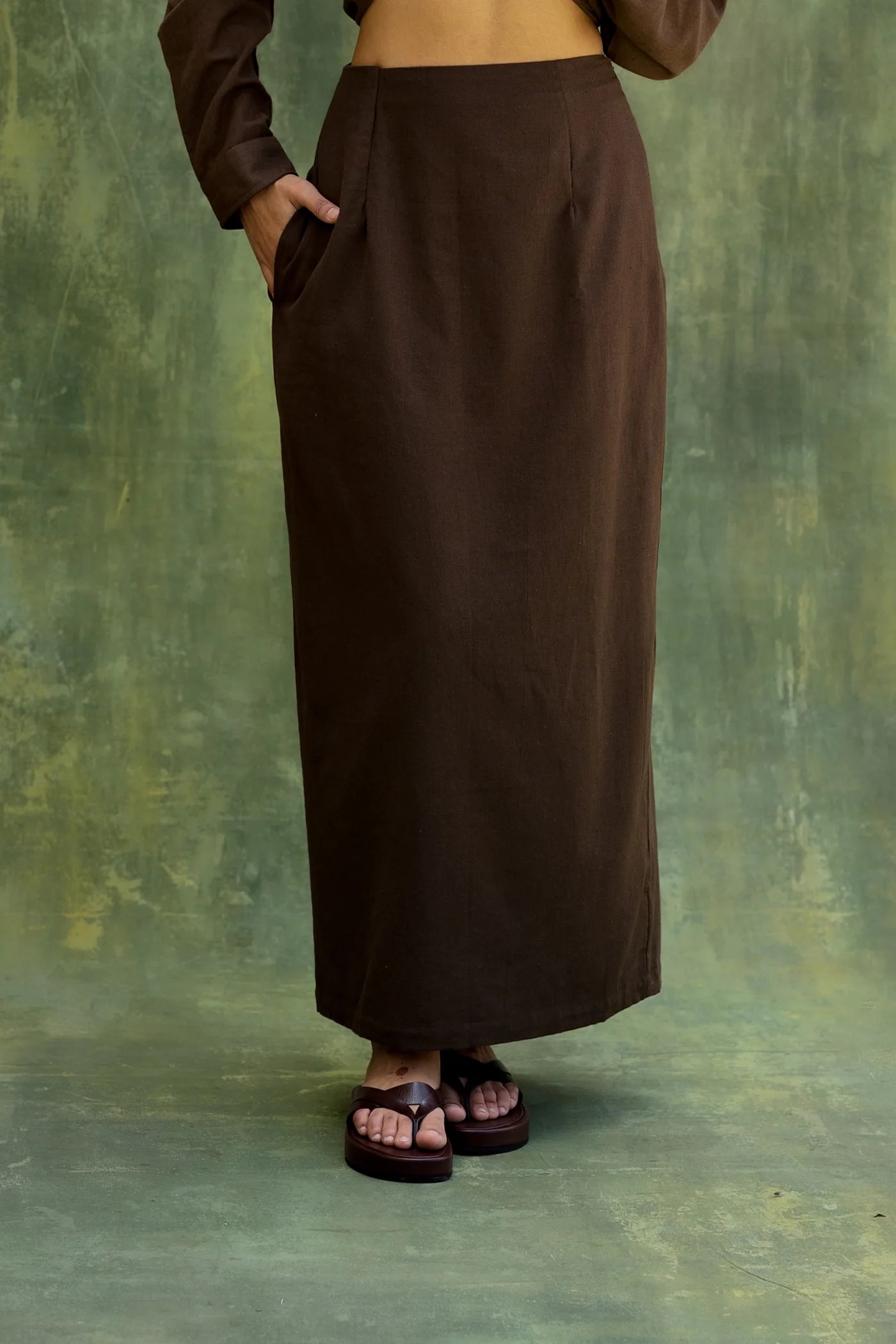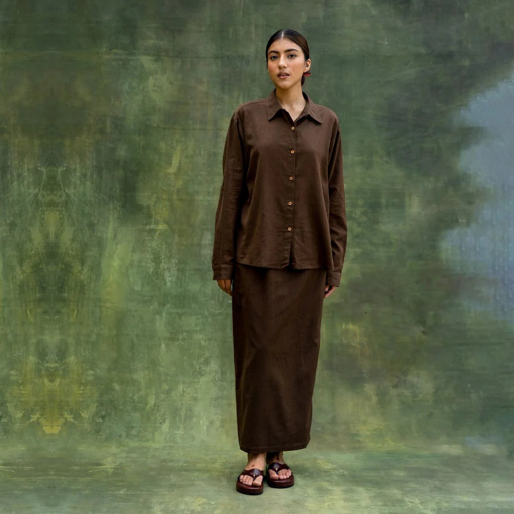 This ensemble features a button-down full-sleeve shirt paired with a straight skirt that has a back slit for ease of movement. The skirt includes a side zipper closure and a side pocket for added functionality. Made from upcycled cotton slub, flex, and blended cotton in a rich brown hue, it's both stylish and sustainable.