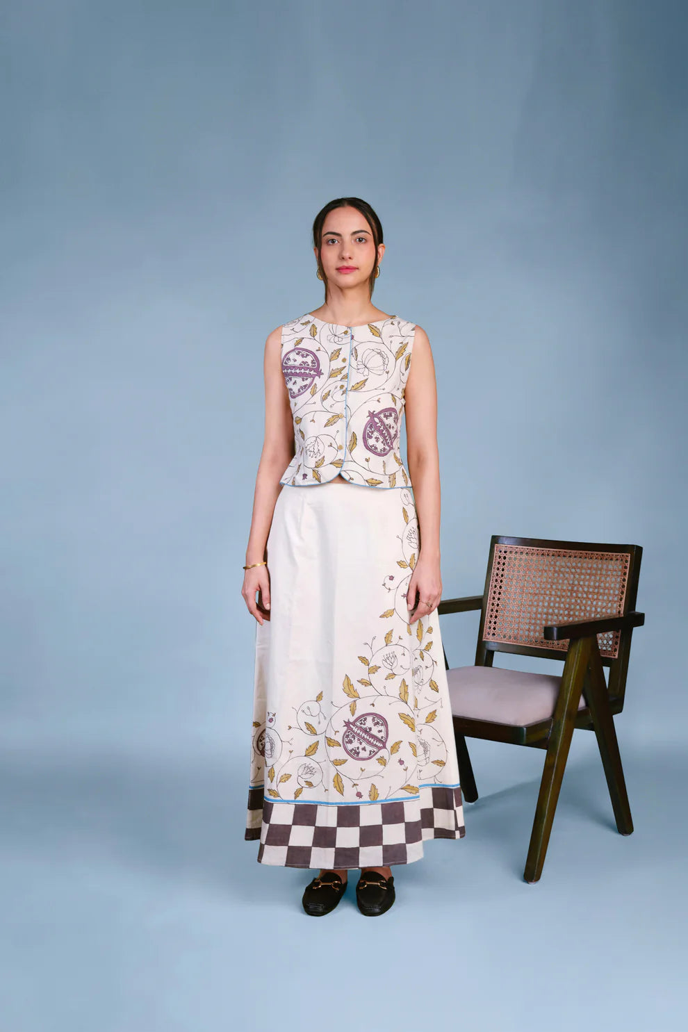 This short vest features a structured silhouette and a semi‑boat neck, with indigo blue fabric. The front is painted with myrobalan, lac, and alum, and the back is painted with kassim. It has brass button closure in the front.