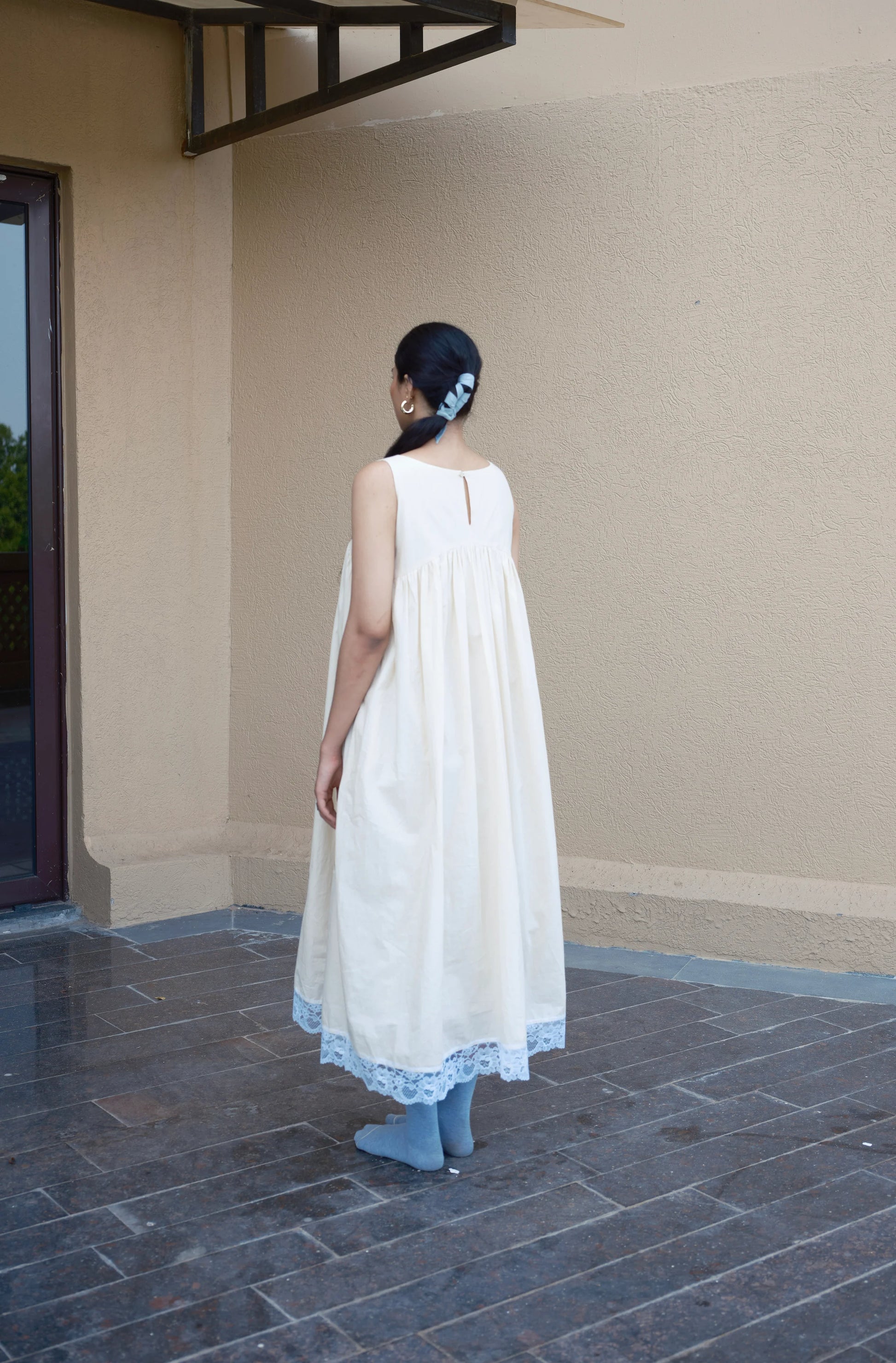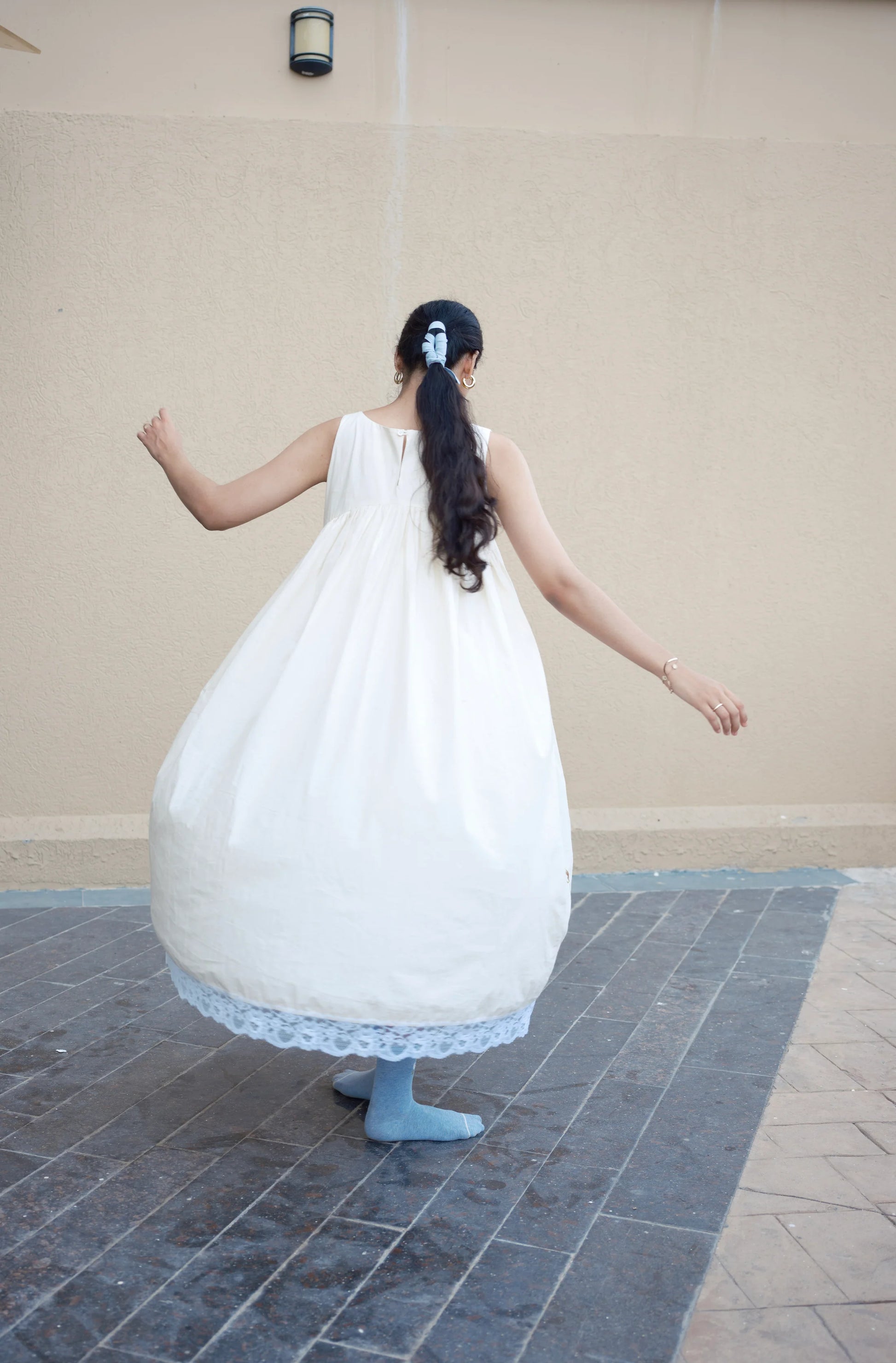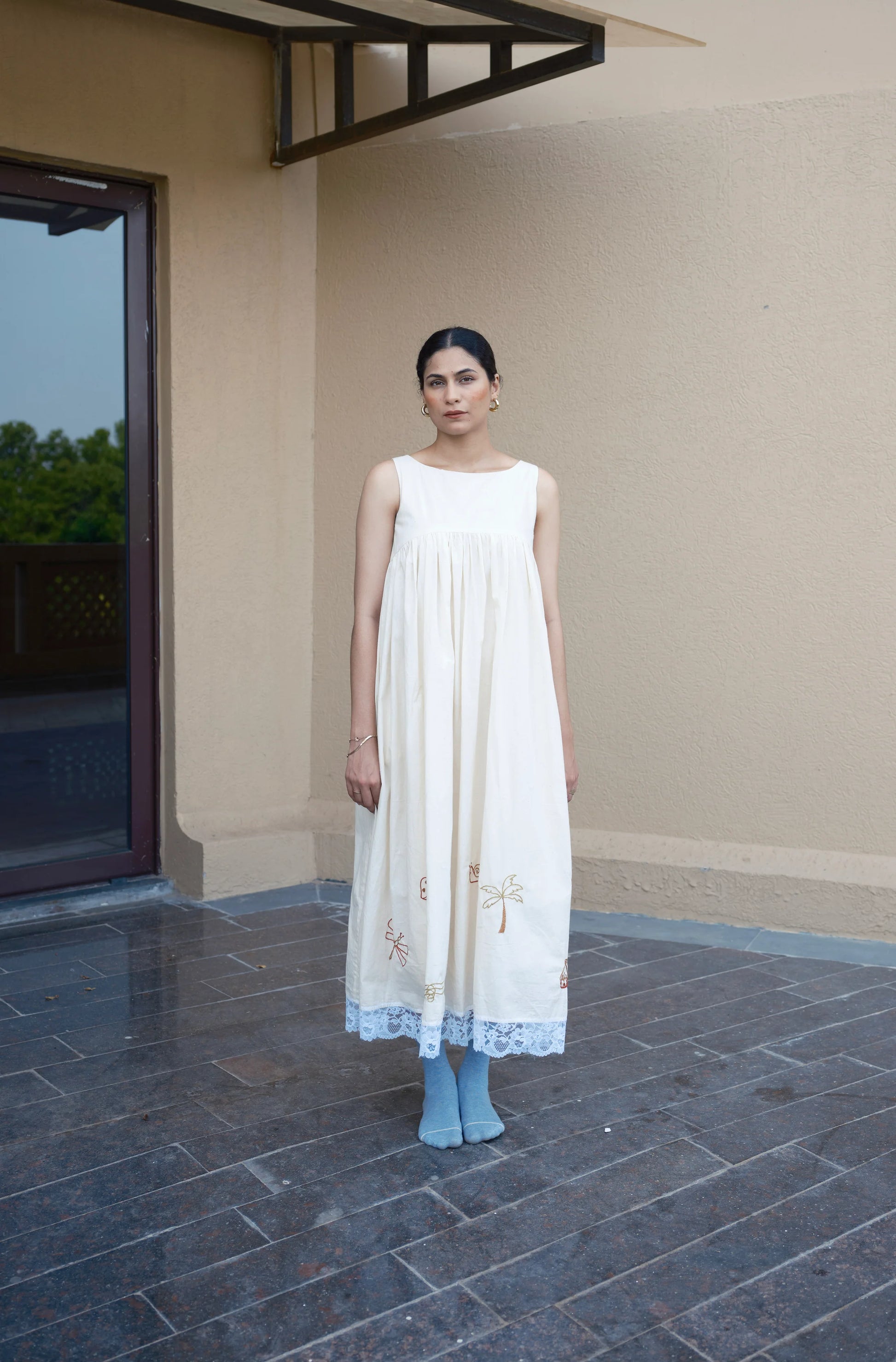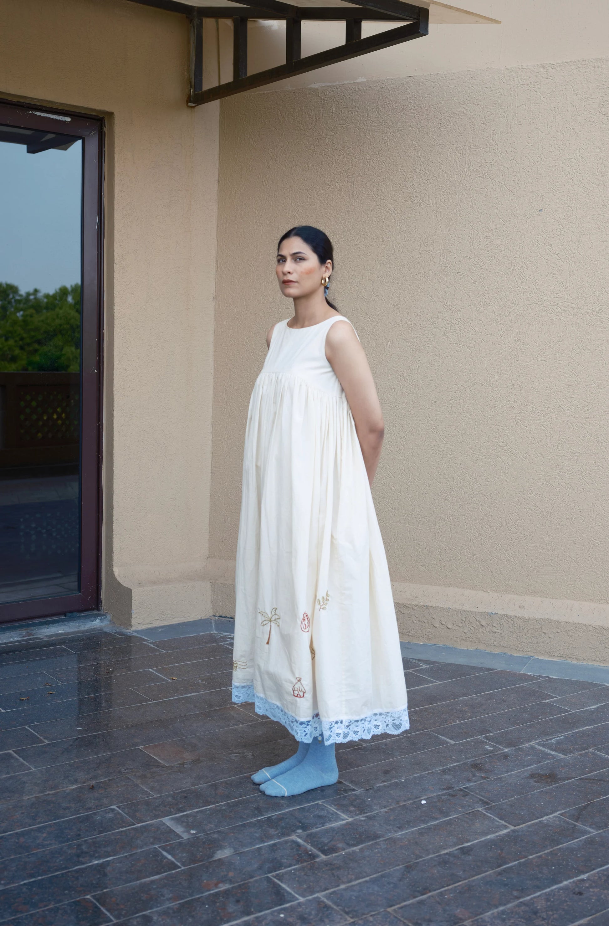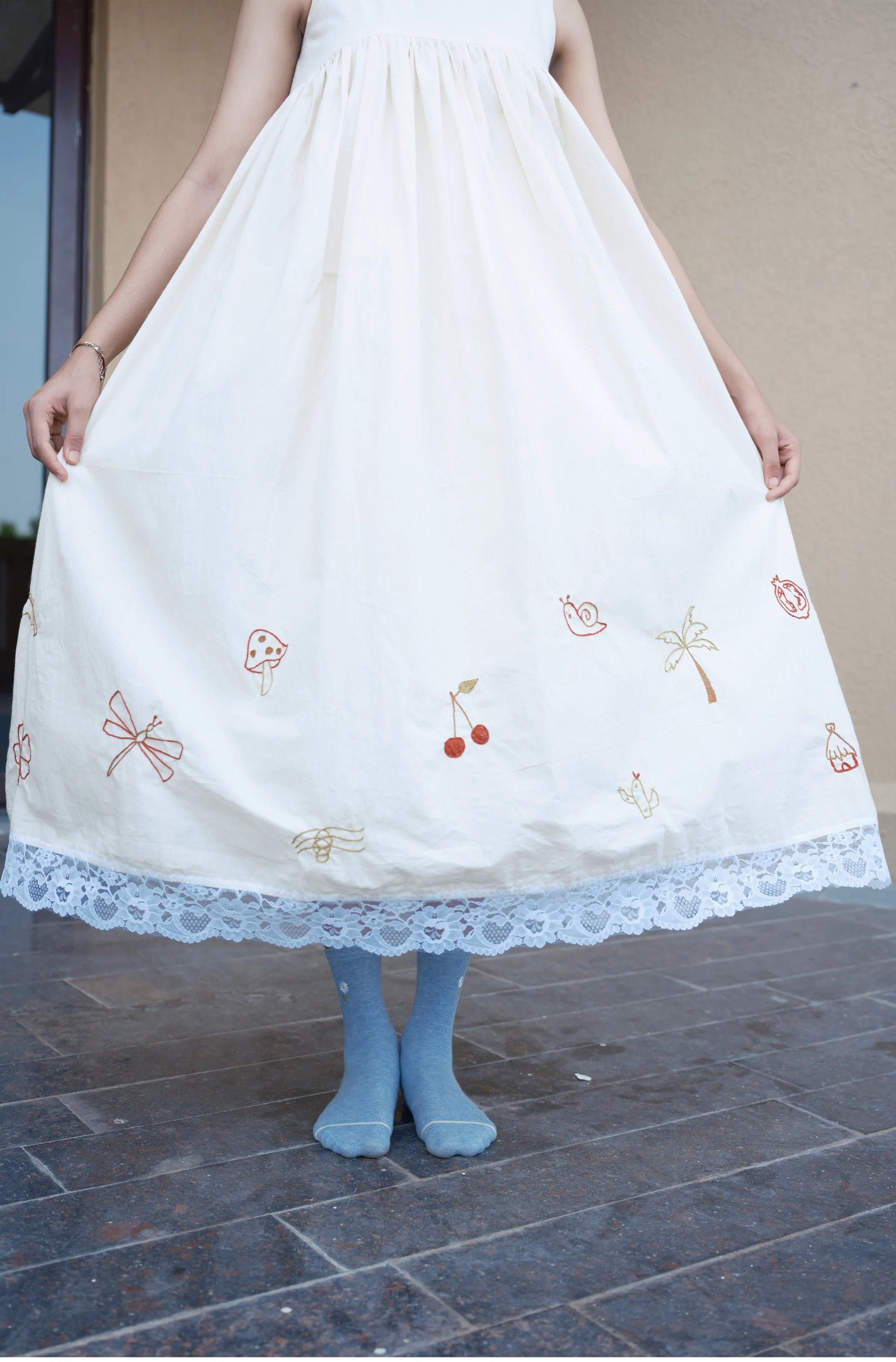 The most fun summer dress, with a boat neck and flared silhoutte. It is also adorned with the fun hand embroidered motifs in shades of the earth.