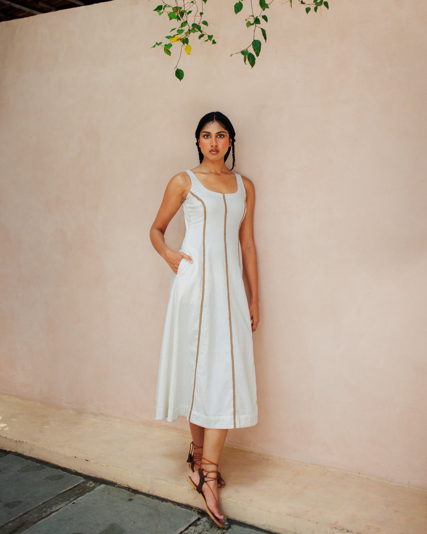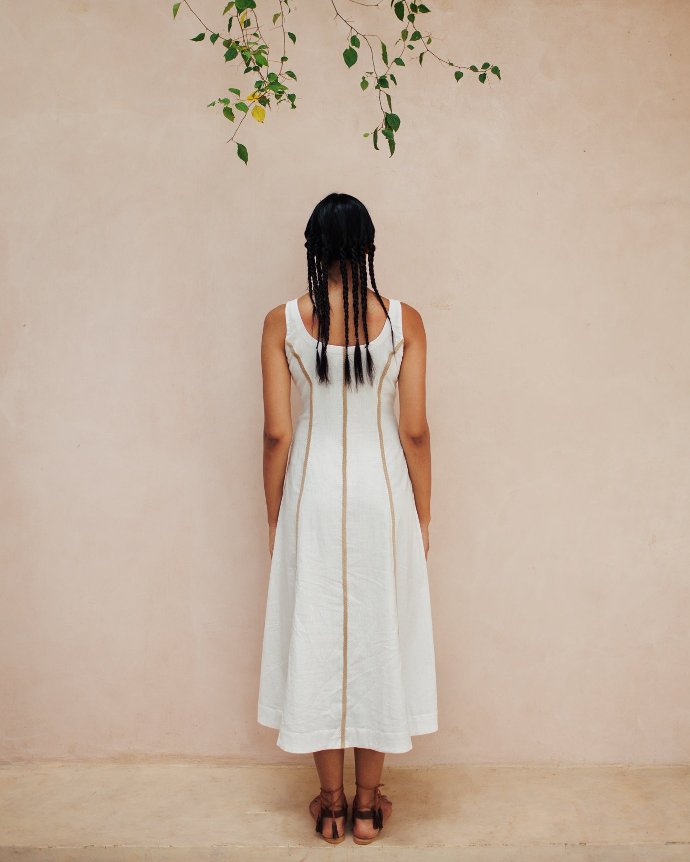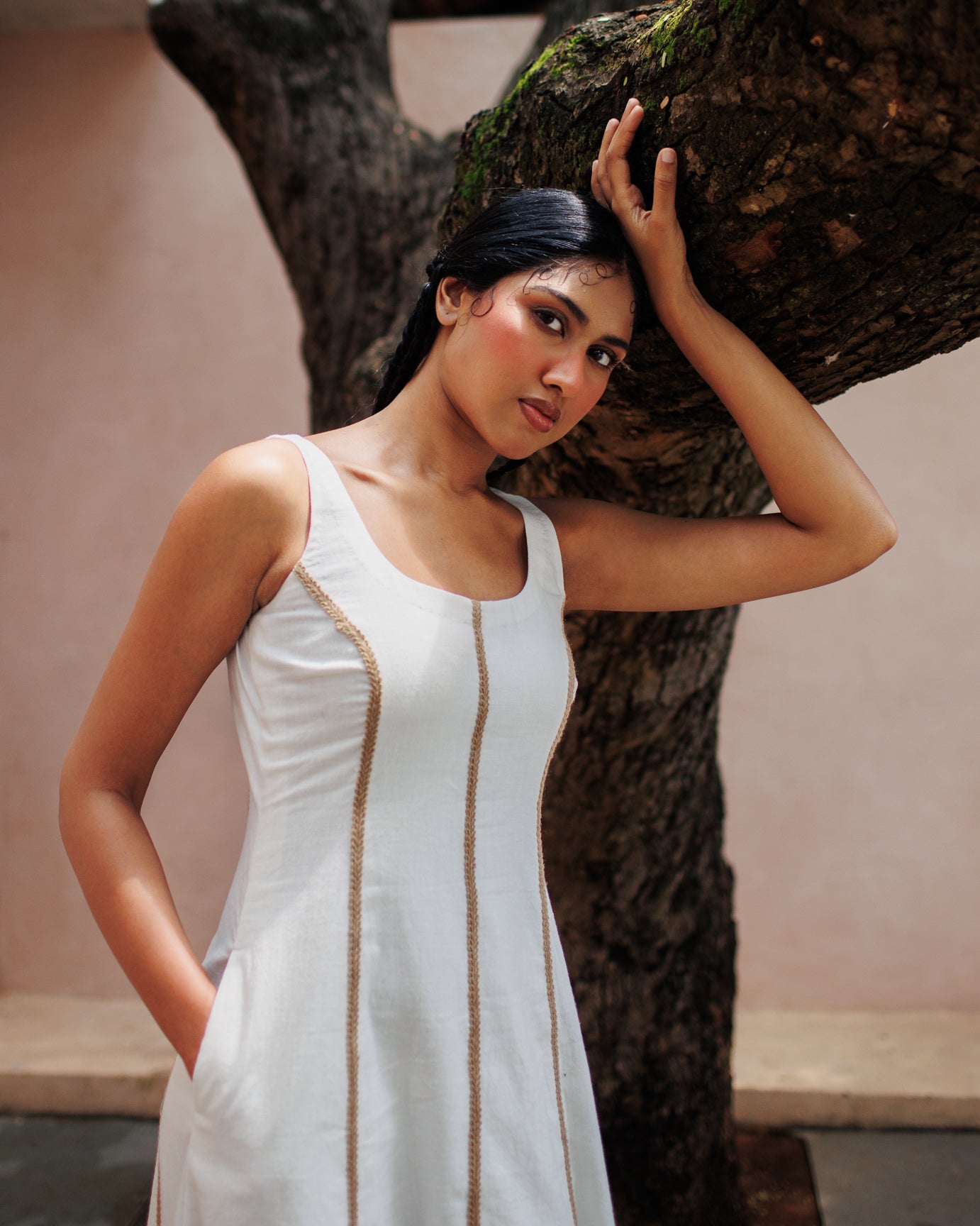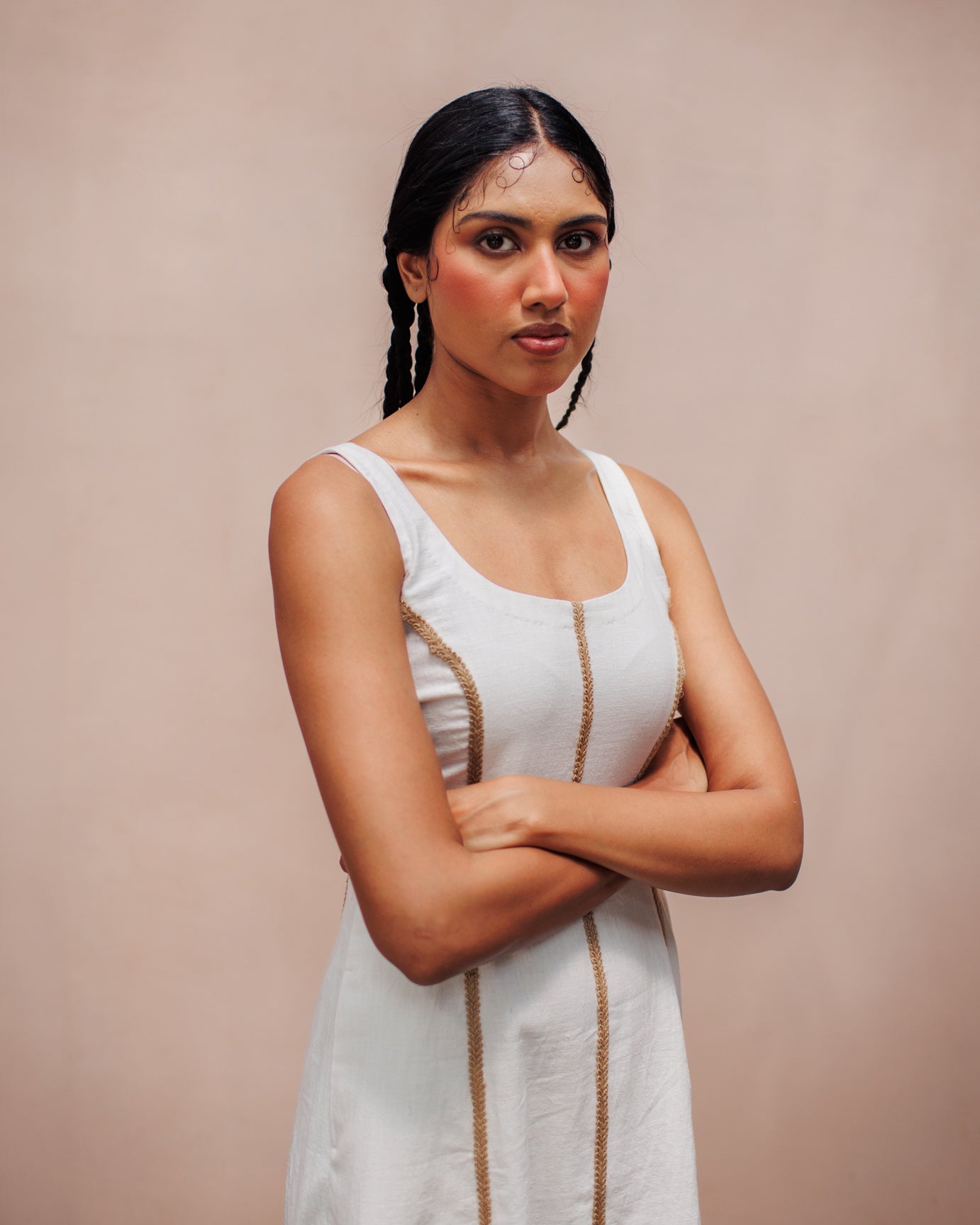 A timeless dress designed to flatter the form. Crafted in handspun, handwoven Khadi and lined with soft recycled cotton for added comfort. It features a jute lace detail running along the front and back, a side zipper for easy wear with a pocket, and a classic fit-and-flare silhouette.