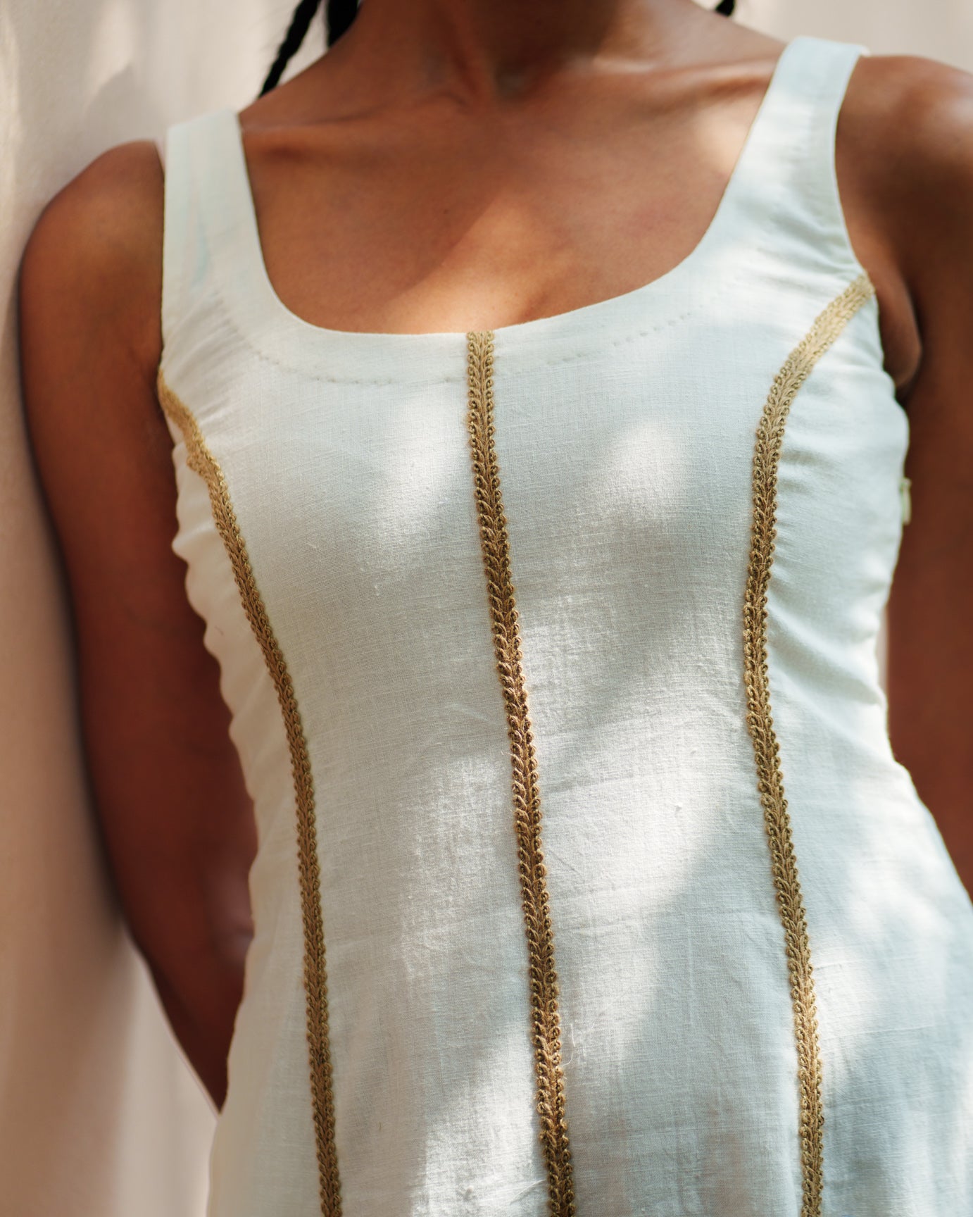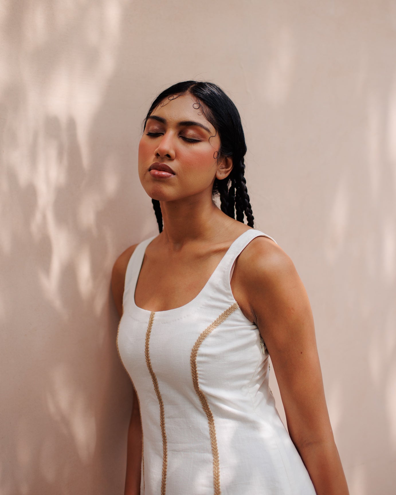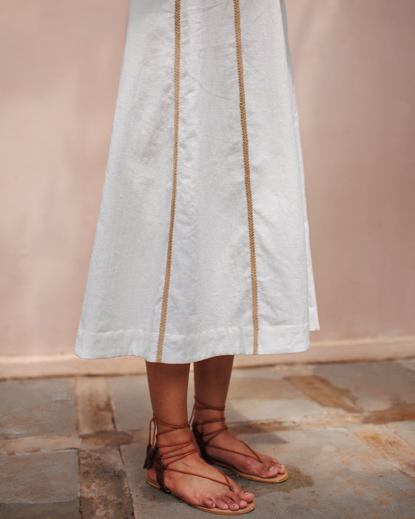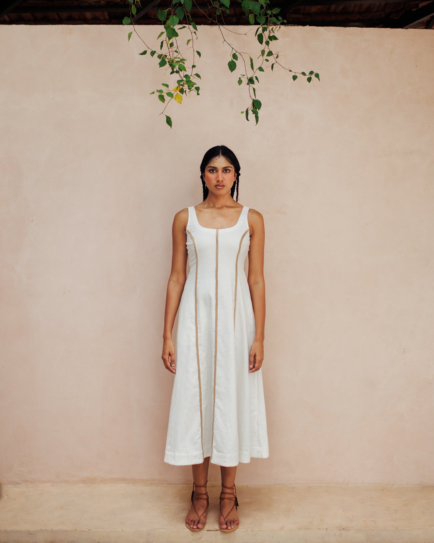 A timeless dress designed to flatter the form. Crafted in handspun, handwoven Khadi and lined with soft recycled cotton for added comfort. It features a jute lace detail running along the front and back, a side zipper for easy wear with a pocket, and a classic fit-and-flare silhouette.