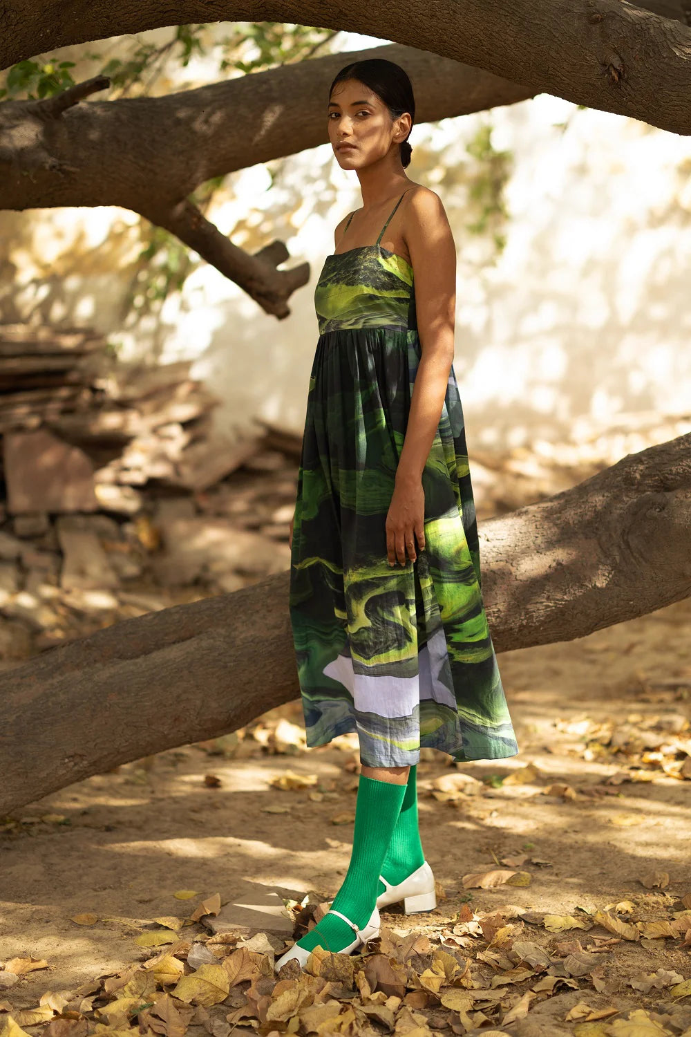 Printed strap dress, gathered at waist and smocking details at the back. The dress comes with adjustable straps and pockets.