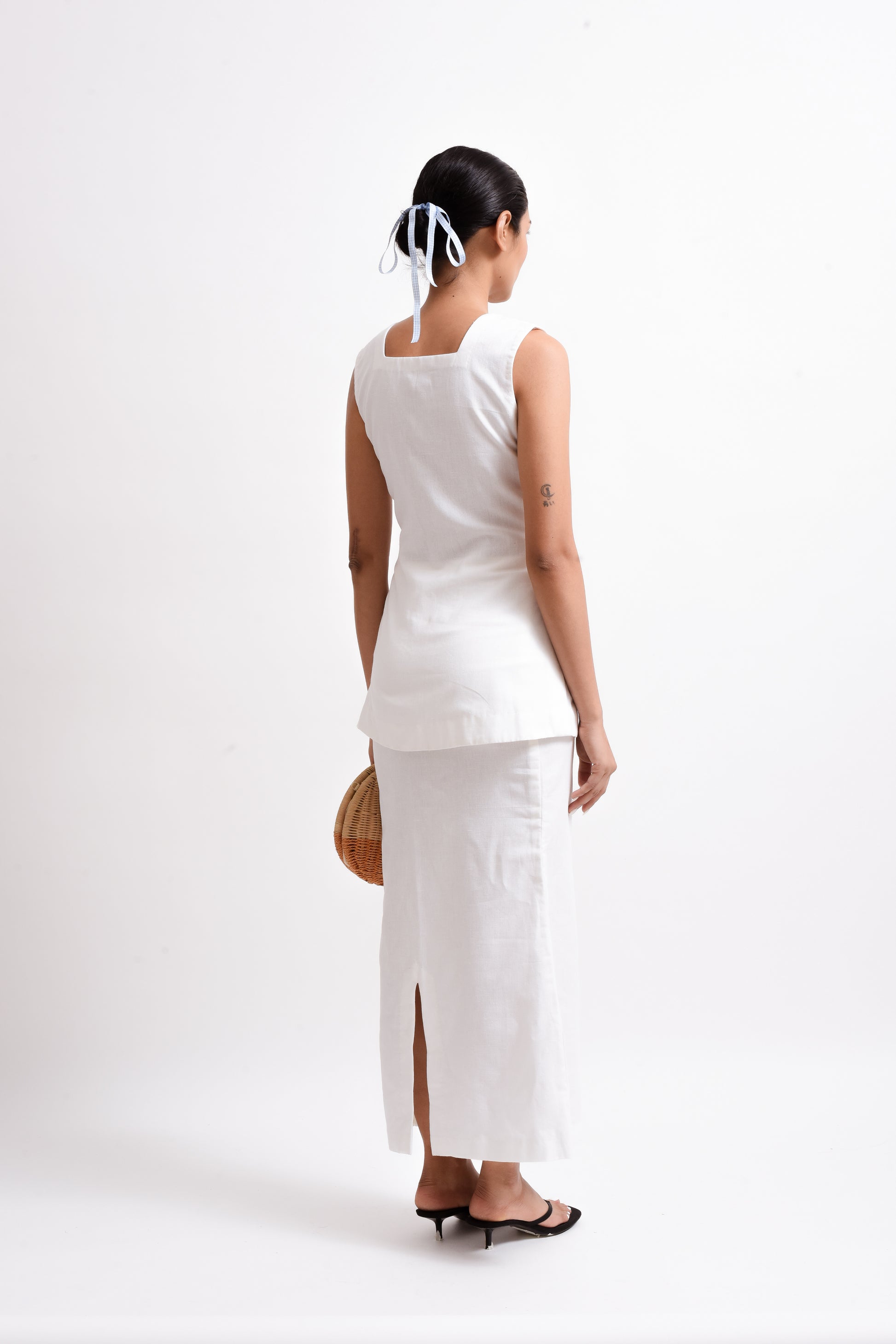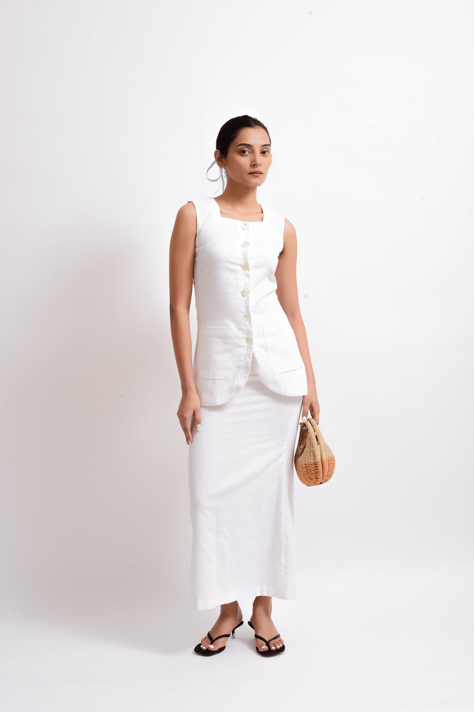 Elevate your wardrobe with the Ava Vest and Pencil Skirt Coord Set. Featuring a chic square neckline vest with center front buttons and side pockets, paired with a high/mid waist pencil skirt with a center back split. Both pieces are fully lined for comfort and style.