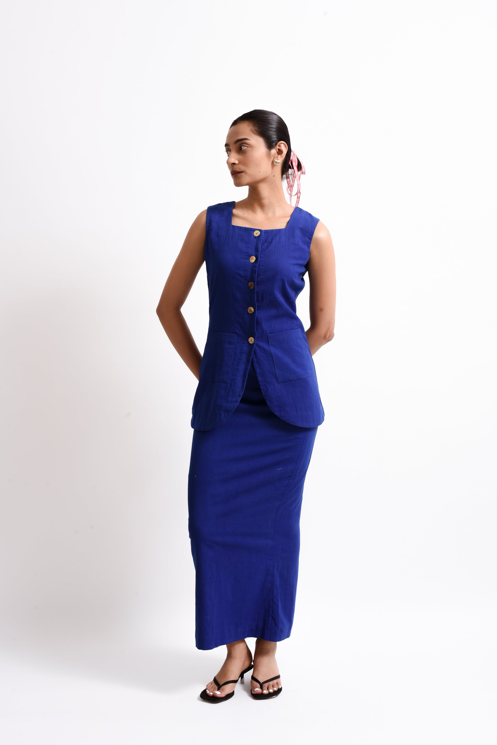 Elevate your wardrobe with the Mira Vest and Pencil Skirt Co ord Set. Featuring a chic square neckline vest with center front buttons and side pockets, paired with a high/mid waist pencil skirt with a center back split. Both pieces are fully lined for comfort and style.