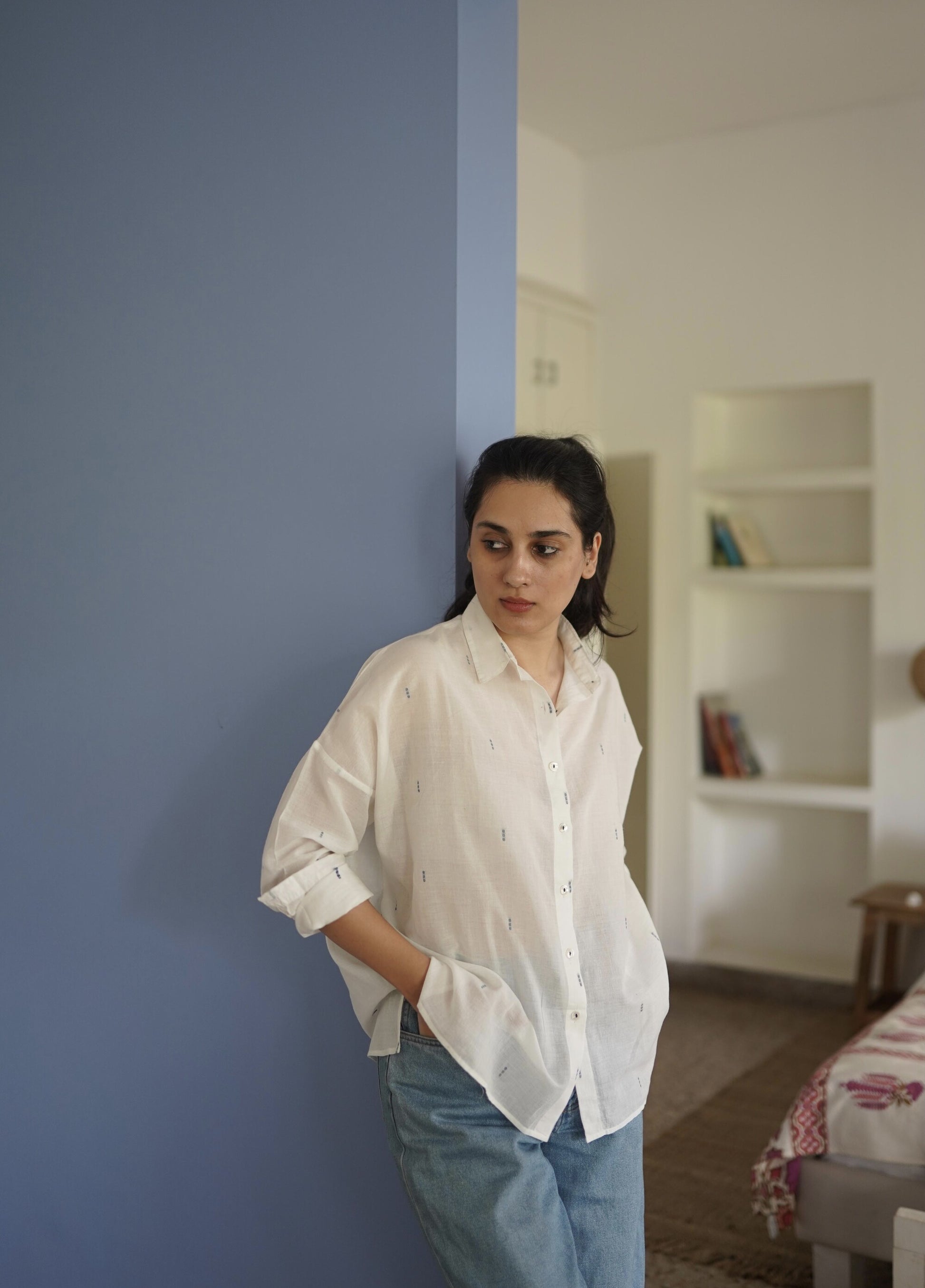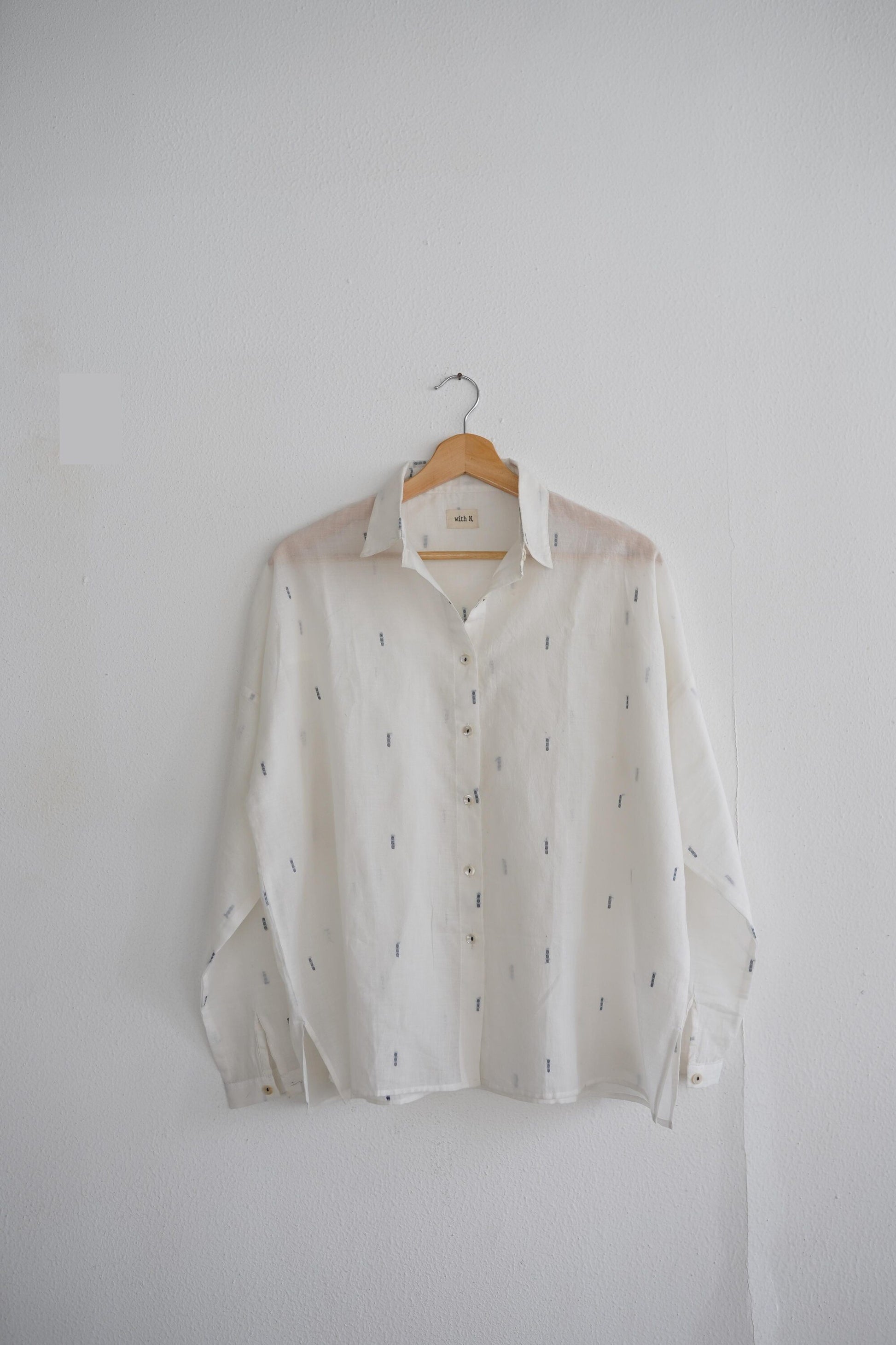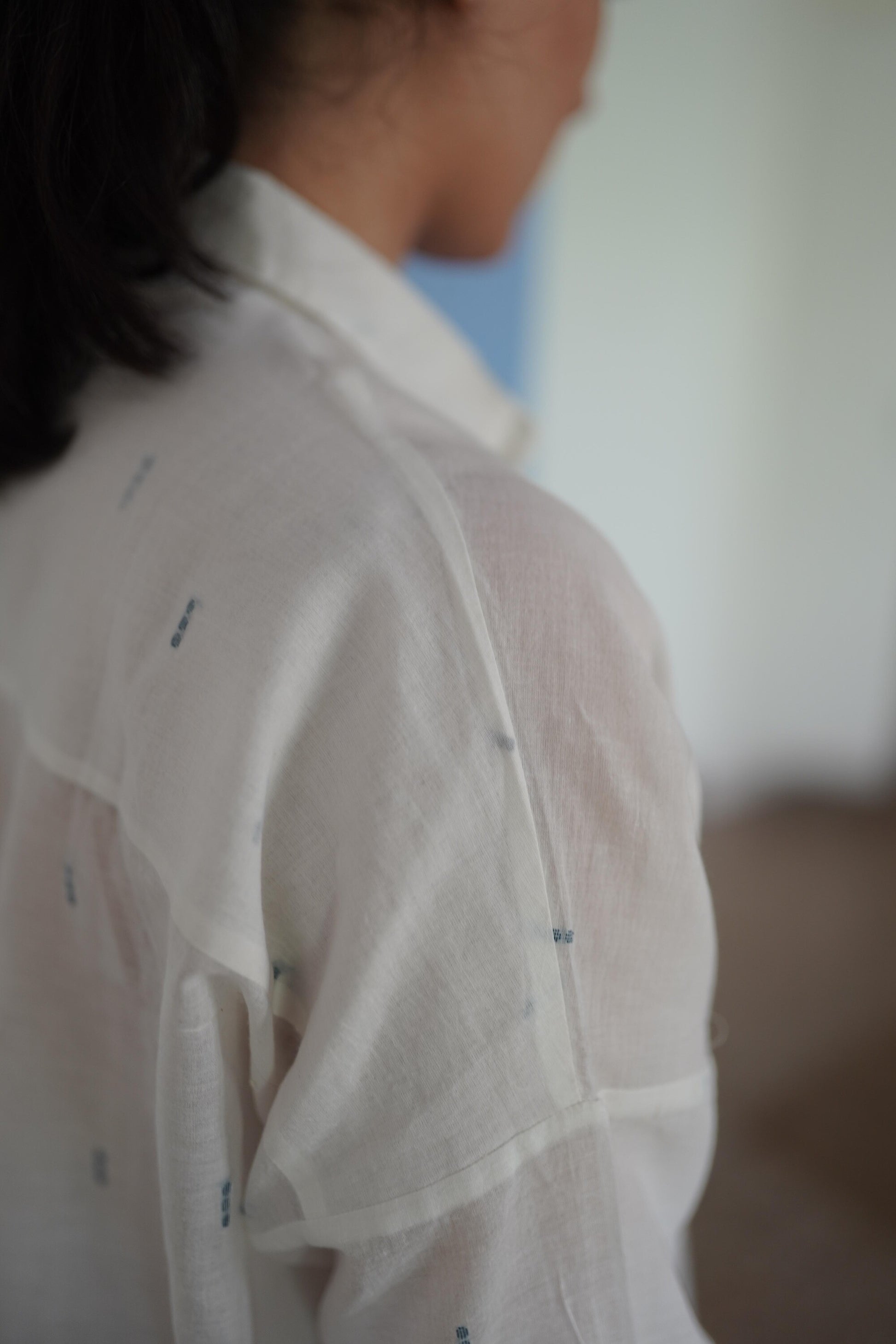 A symbol of summer, of continuation || Handwoven cotton shirt with Jamdani motifs. Drop shoulders, box pleat at the back and side slits for details. The garment is oversized and comes in dual sizes.