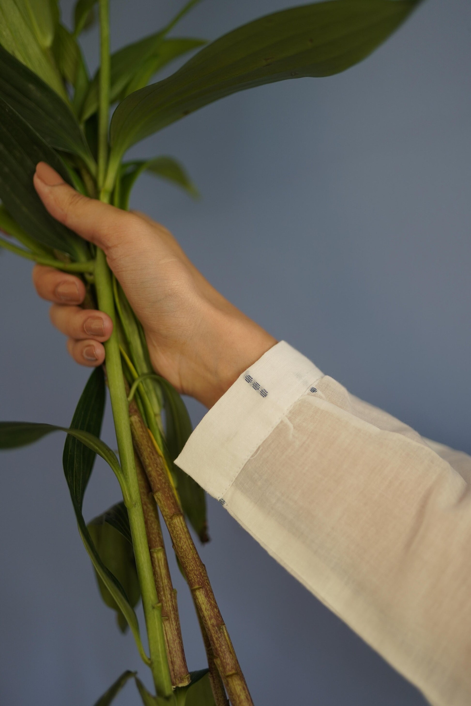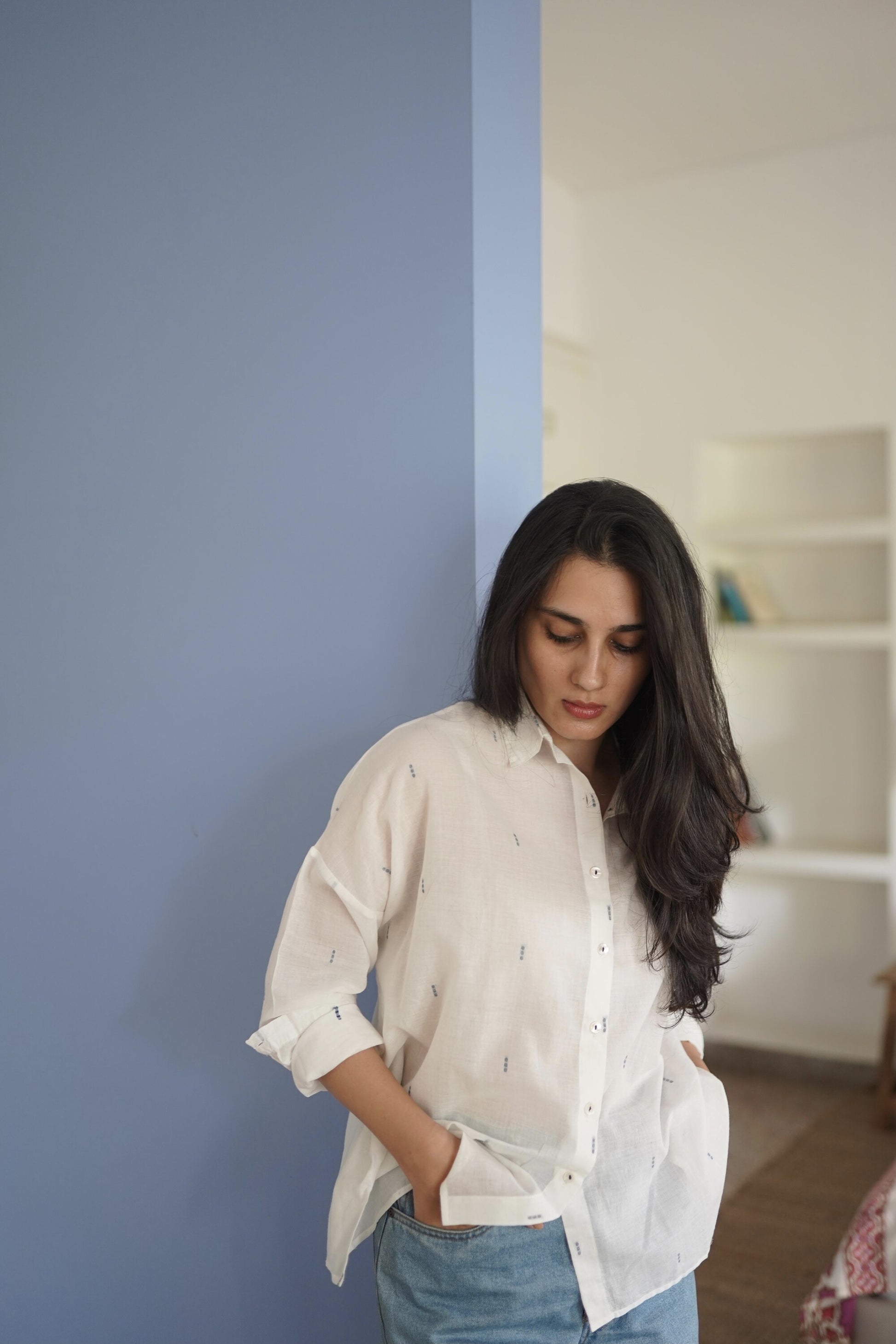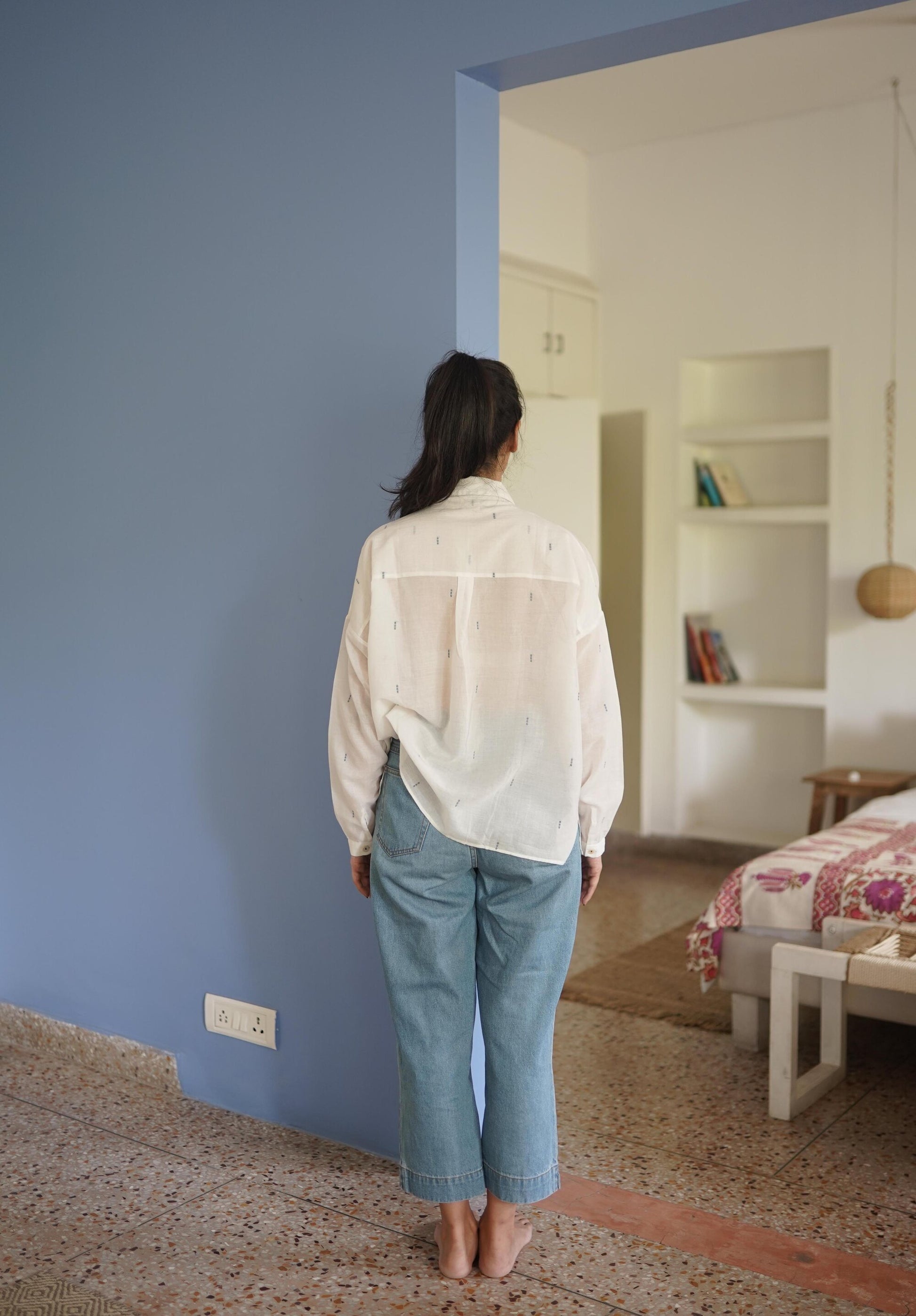 A symbol of summer, of continuation || Handwoven cotton shirt with Jamdani motifs. Drop shoulders, box pleat at the back and side slits for details. The garment is oversized and comes in dual sizes.