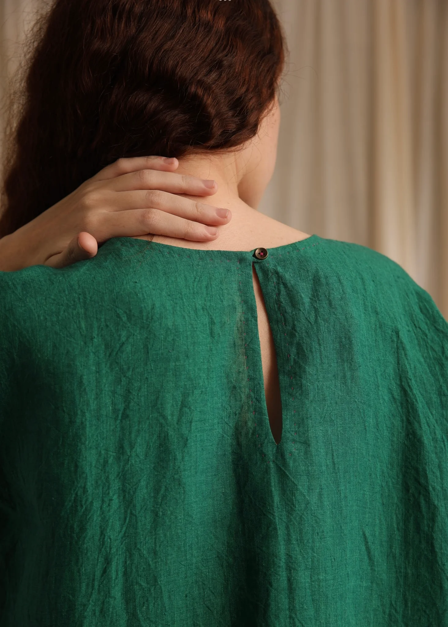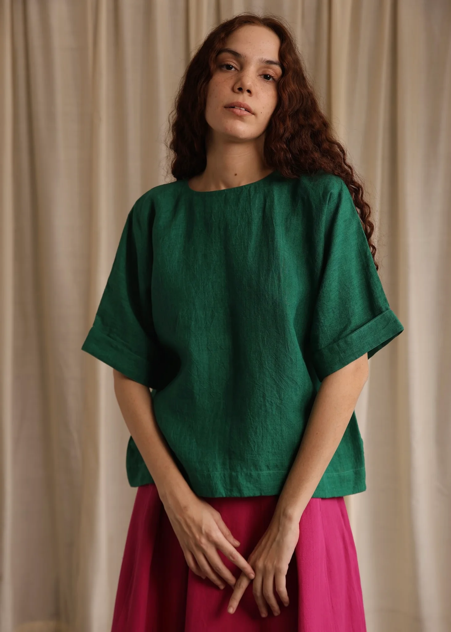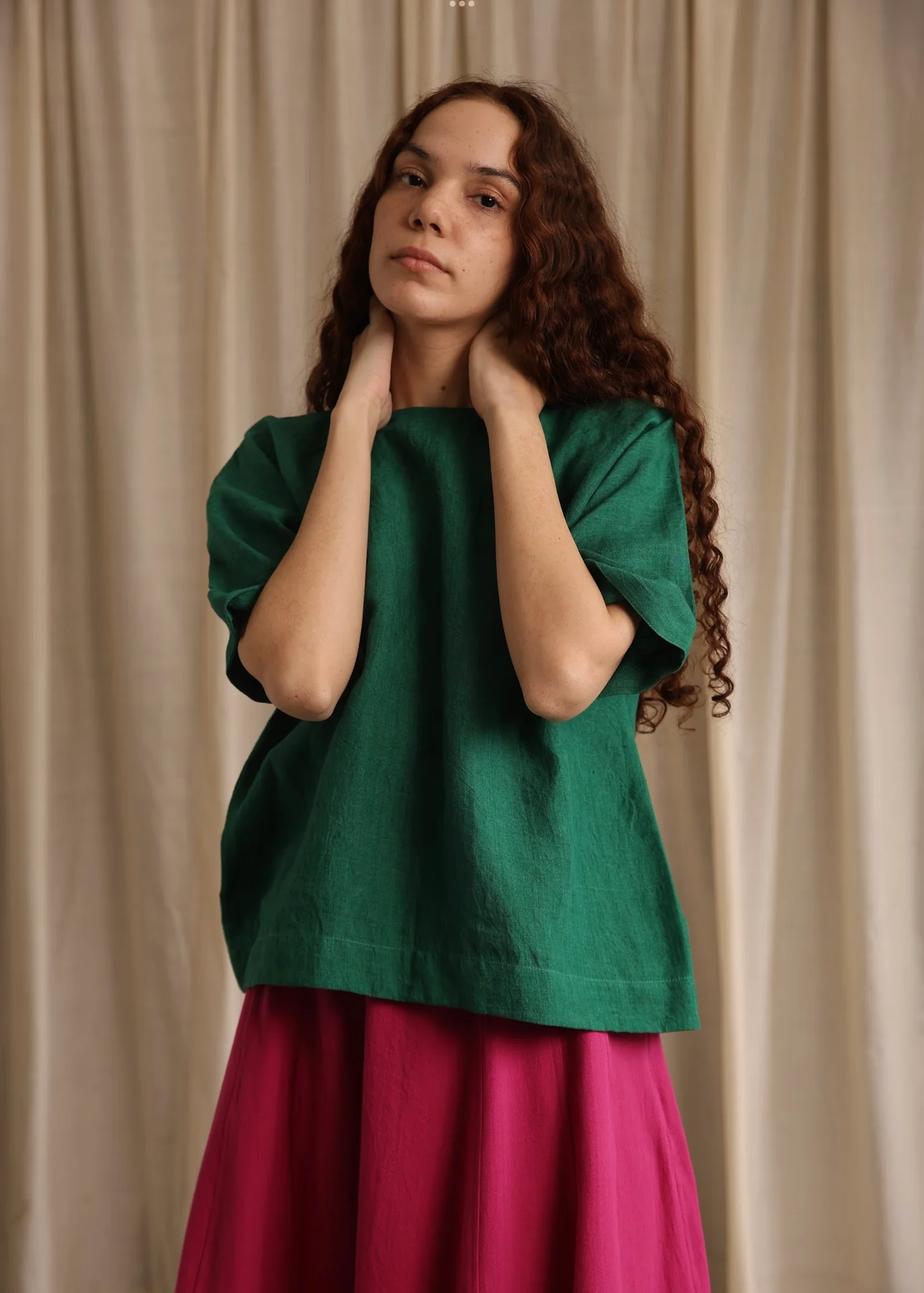 Cut in handwoven linen, Fae is a simple A-line top, with rolled up half-cut sleeves and a round neck.
