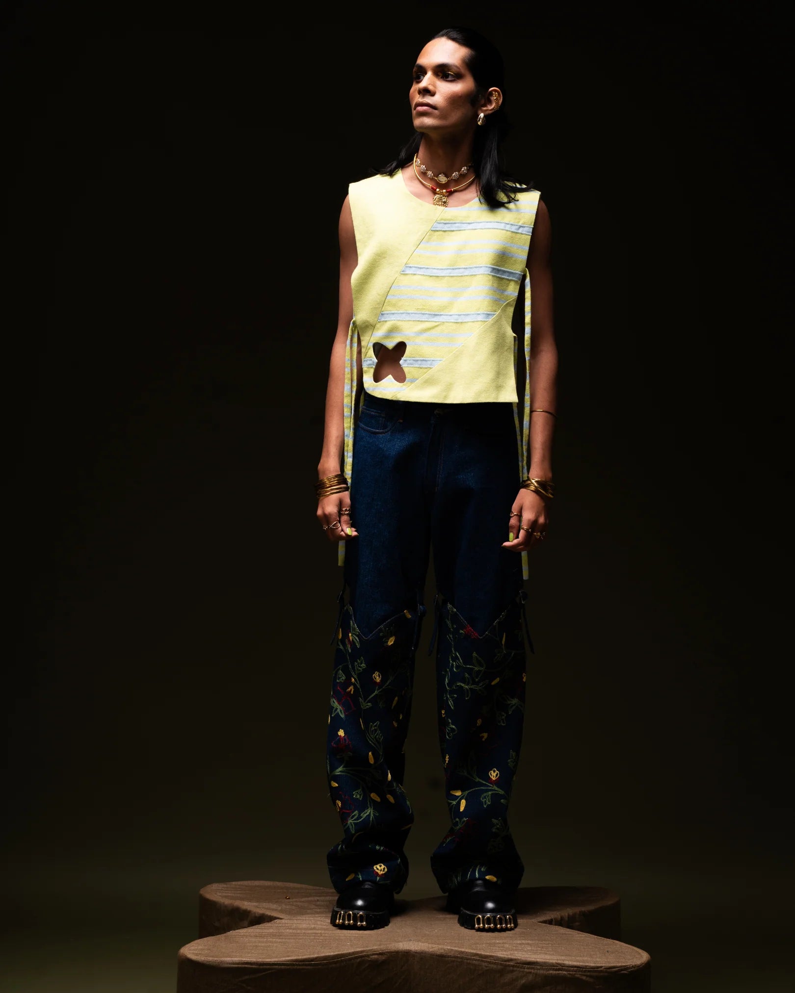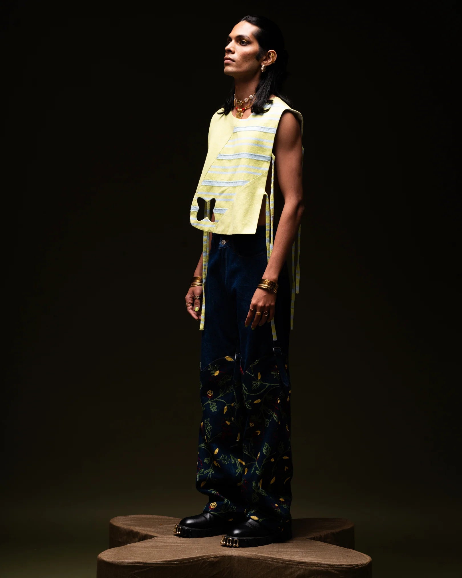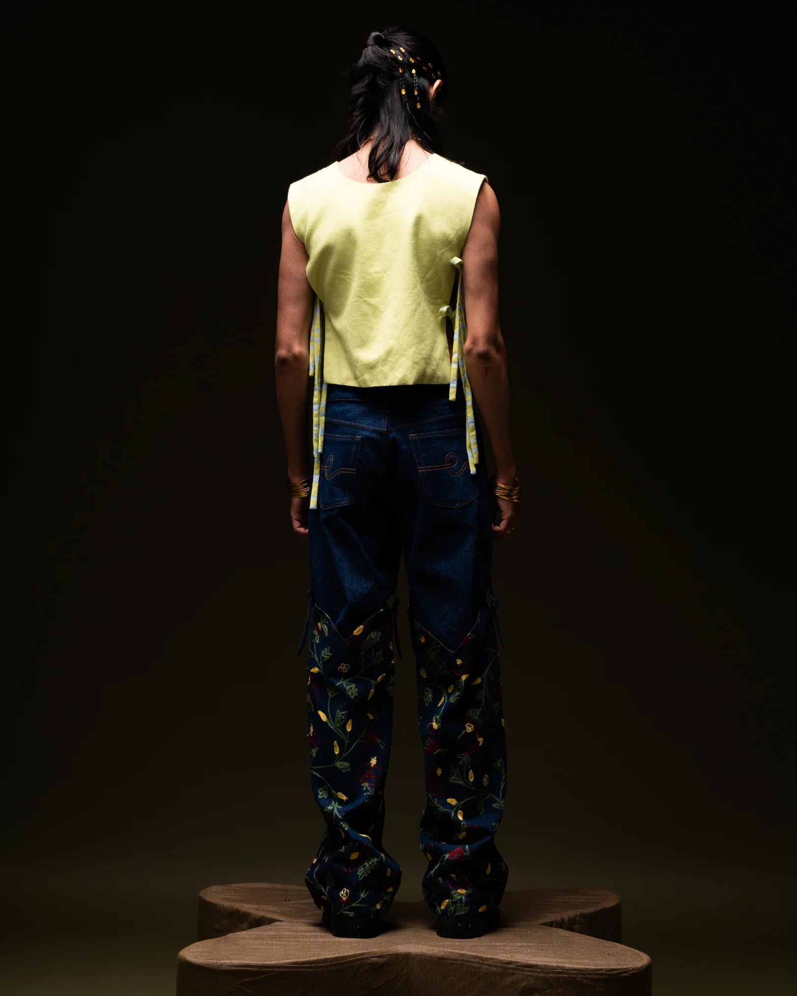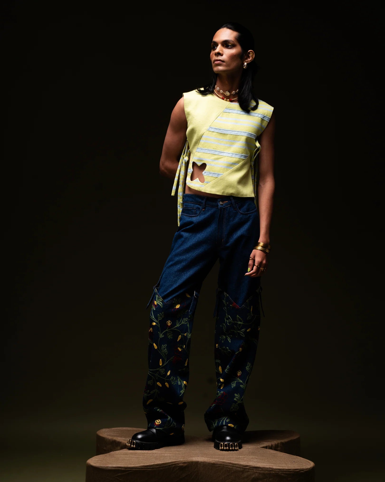 Far Away are blue denim pants with cowboy-stitched cuffs and layered construction. These high-rise jeans feature five-pocket styling, embroidered panels at the cuffs, and darted back pockets for added detail. A Jamakkalam logo patch on the back waistband completes the look. Want to switch things up? Try turning them into shorts for a versatile, stylish option.