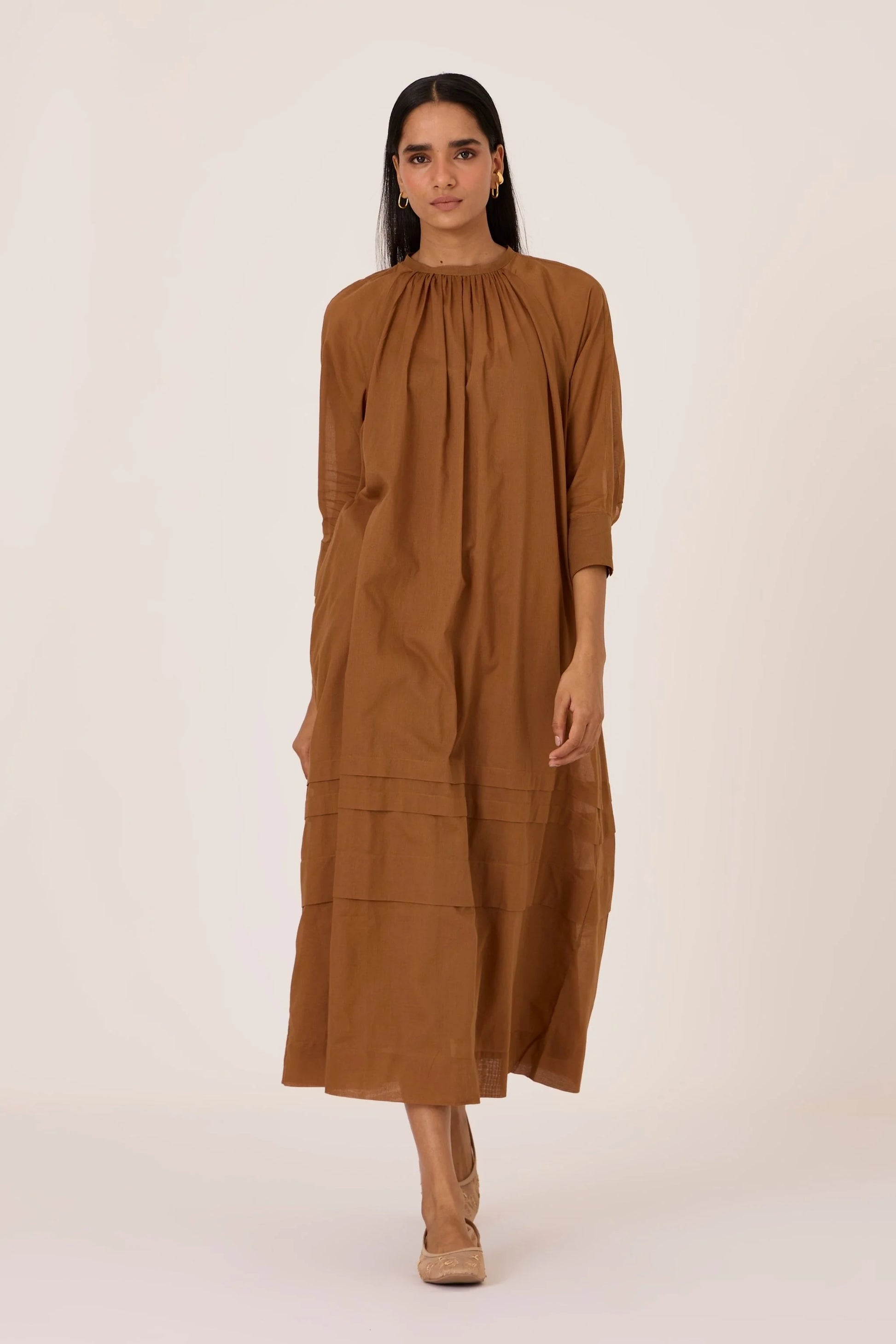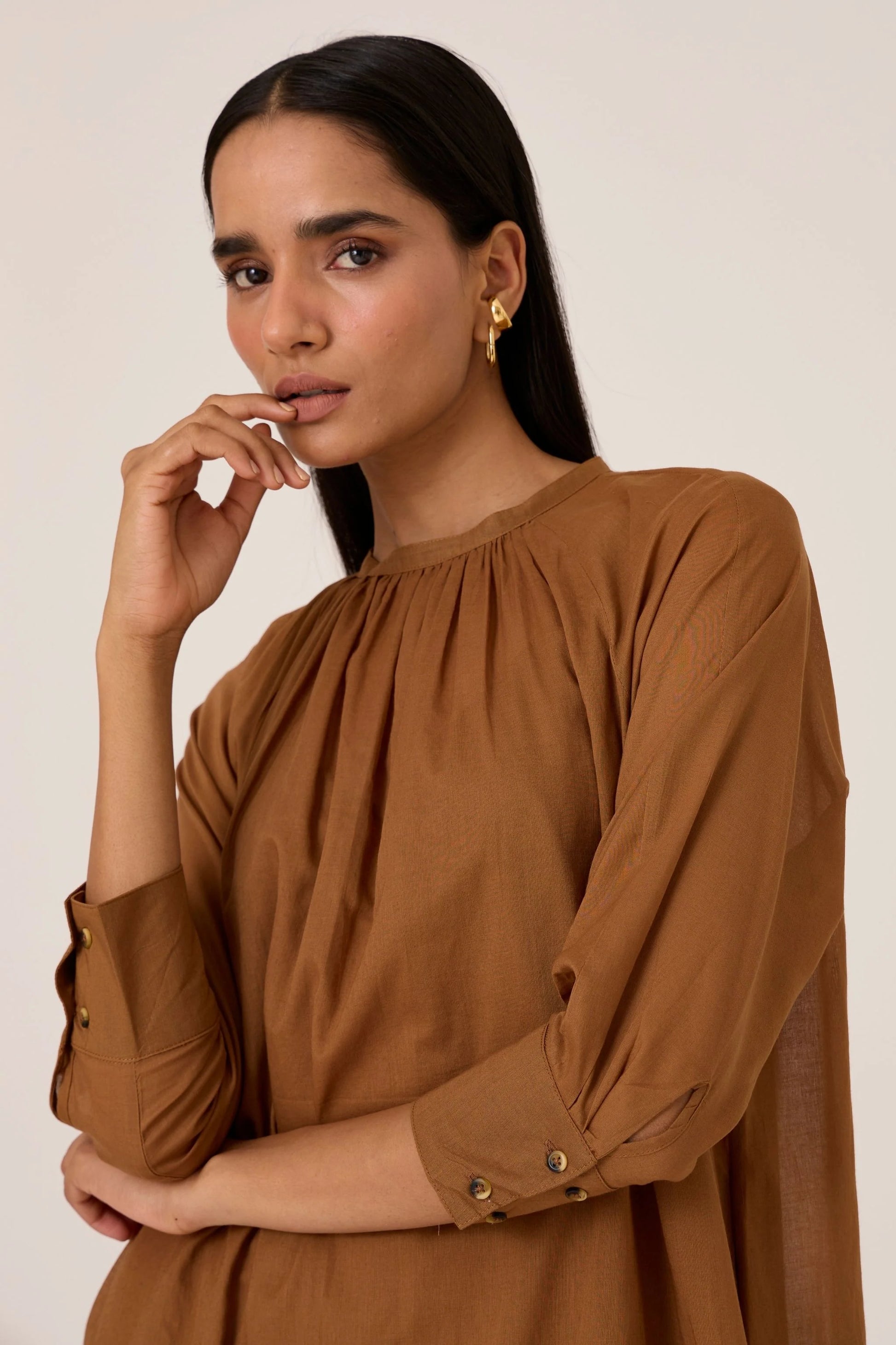 Resort style shift dress. Soft gathers at neckline. Raglan sleeves with cuffs. Rouleau button detail at the back. This dress is shipped with a slip.