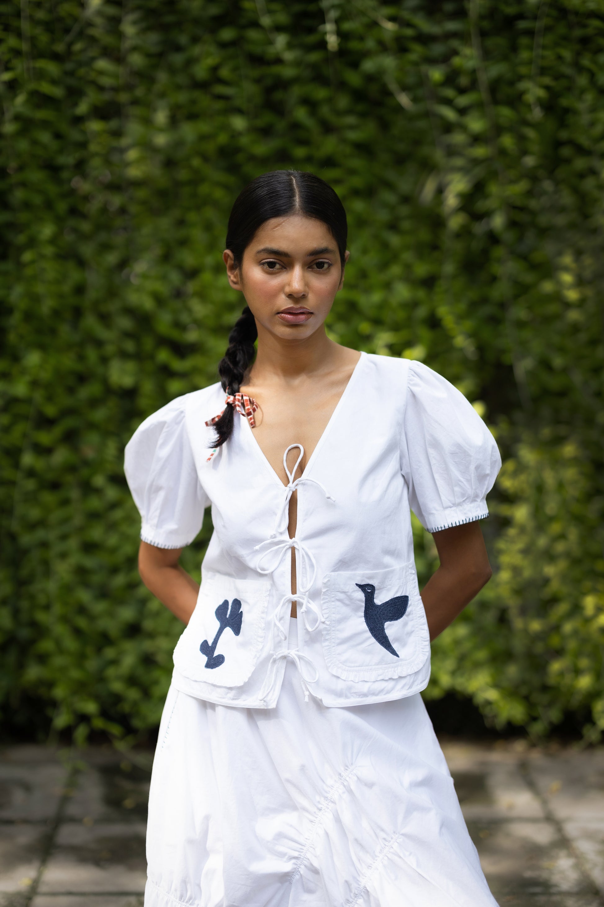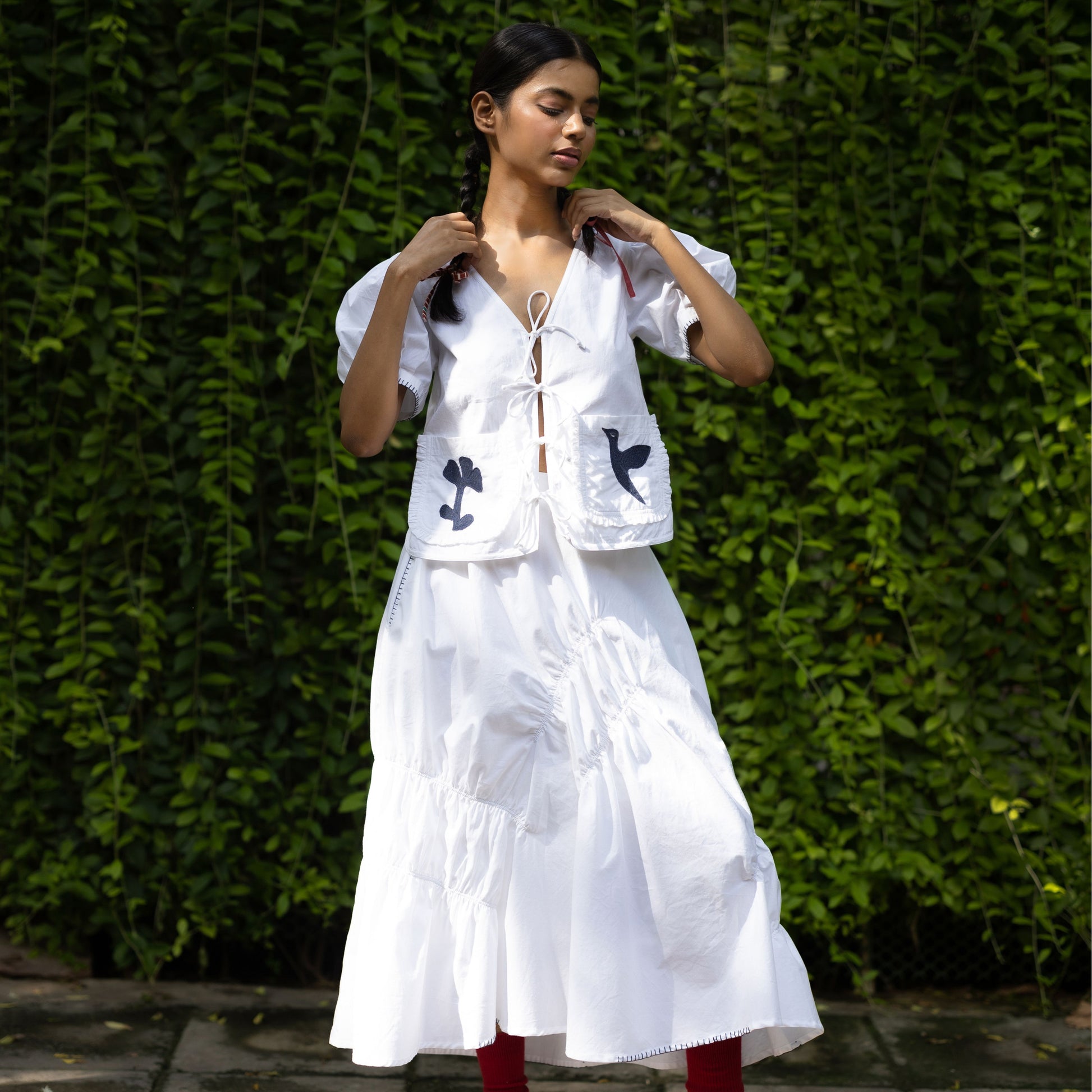 Elevate your style with this chic top, featuring patch pockets, frill details, and a front tie closure. Paired with a deconstructed skirt that boasts gathers, back elastic, and inseam side pockets, this outfit combines playful elements with practical design for a trendy, versatile look.