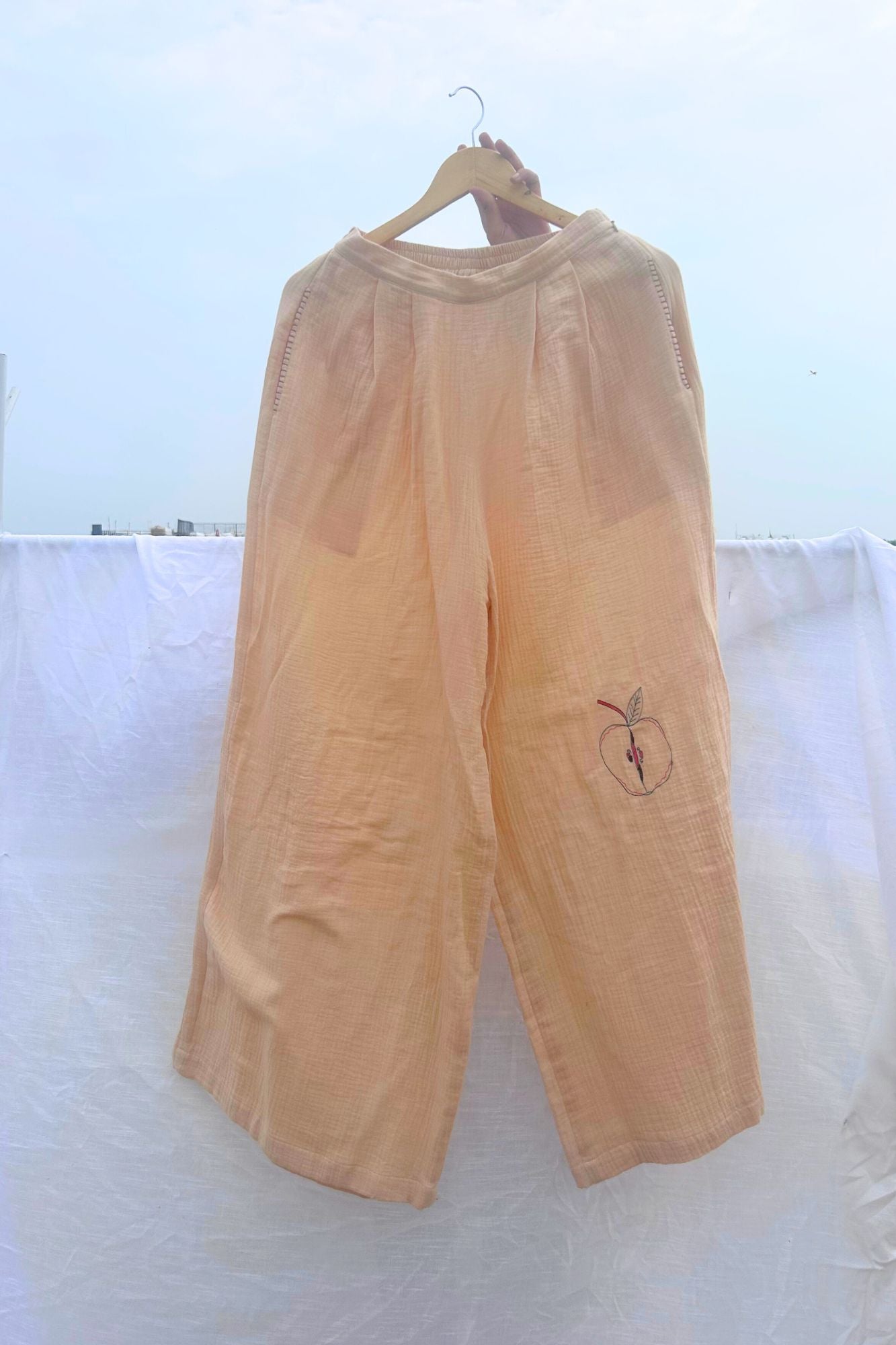 Description: Flared organic cotton pants with elasticated back, pleated front, details at the pocket and randomly placed doodle embroidery.