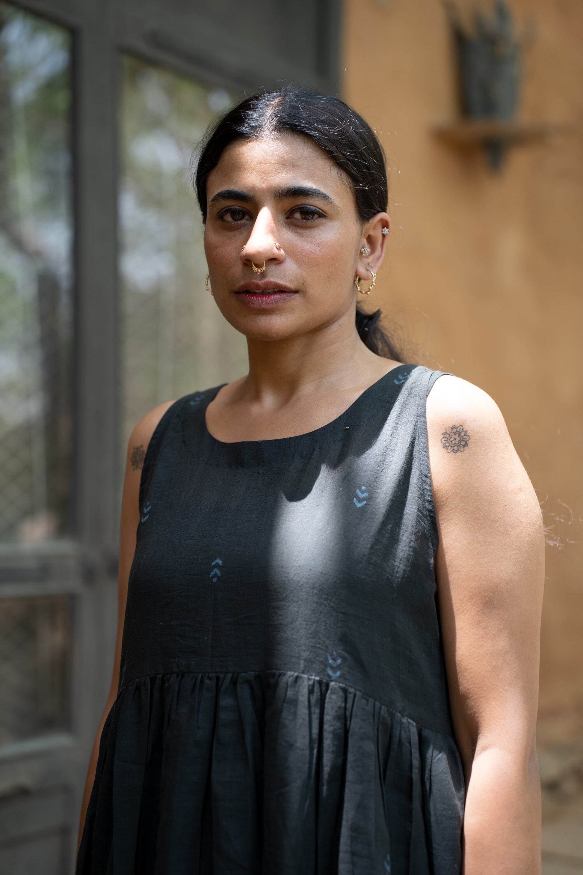 Midi dress that brings a few favourites together! Neatly arranged Jamdani from our “Flow” fabric, this time in an unassuming but also an unfailing combination of indigo and charcoal. The colours are naturally dyed. Gathered waist, generous fall and in-seam pockets for details. Comes with a handwoven cotton slip.