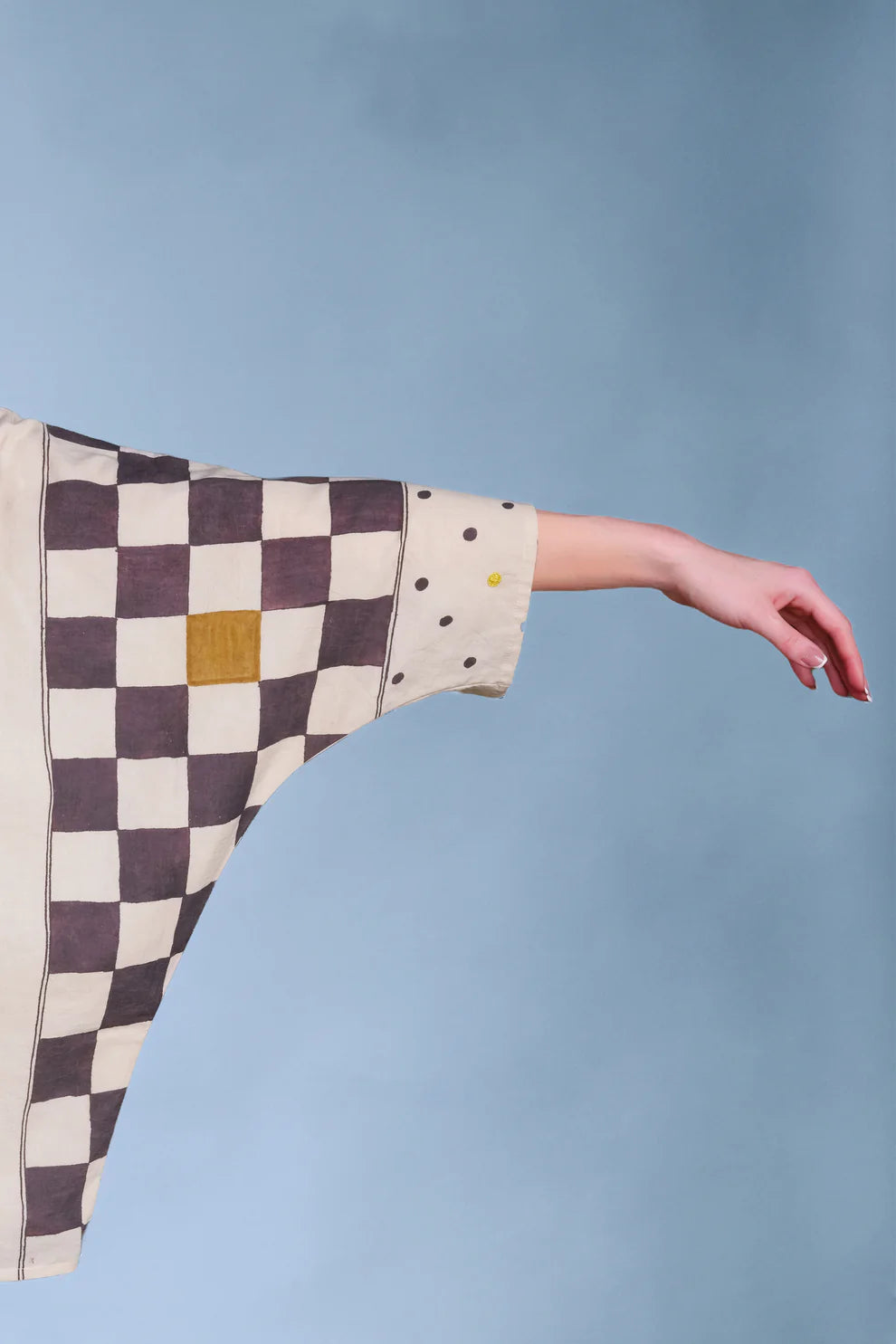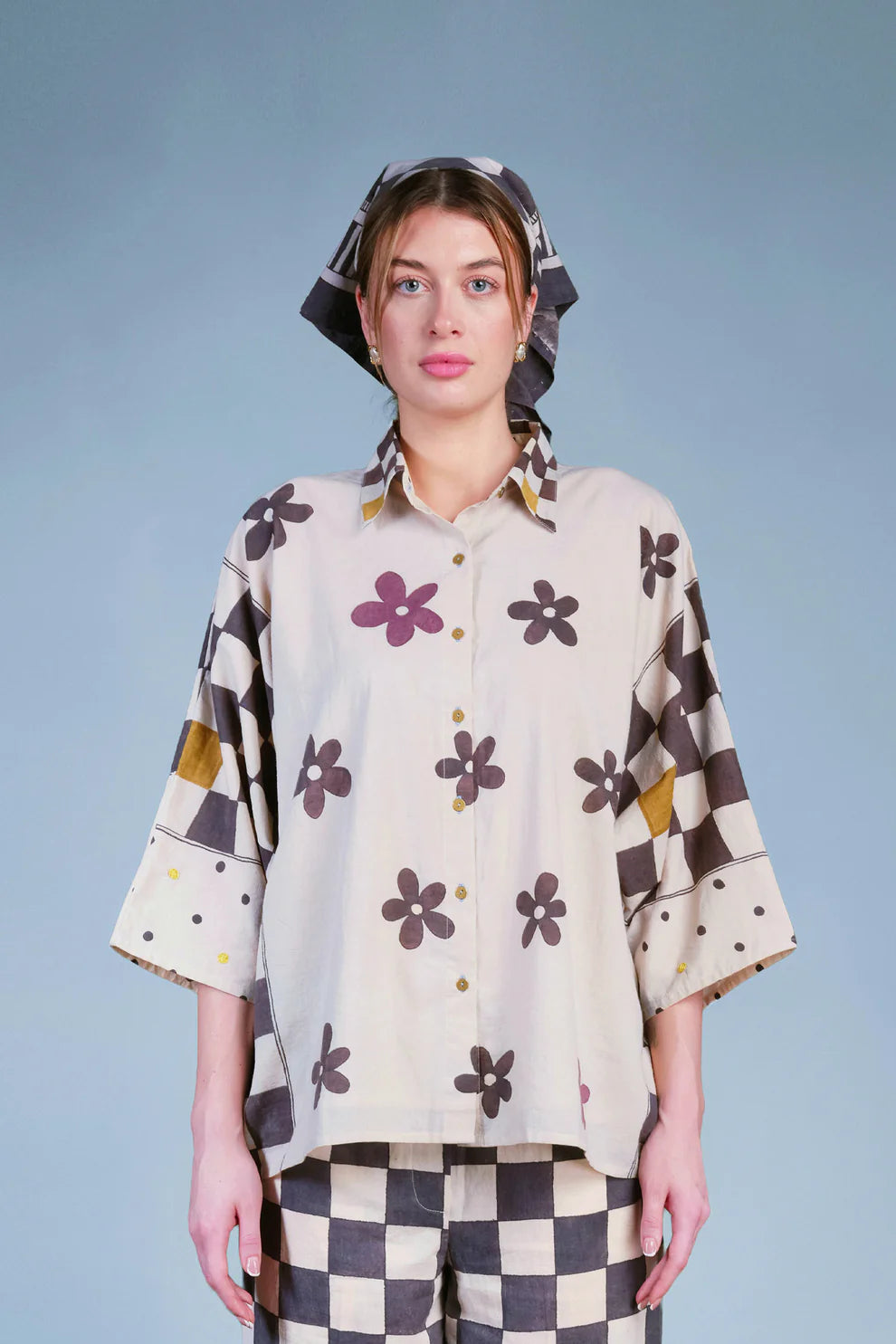 Oversized shirt with kimono sleeves and a classic collar. Mixed-prints painted in kassim, myrobalan, turmeric, lac and alum in panels on both sides of the shirt.