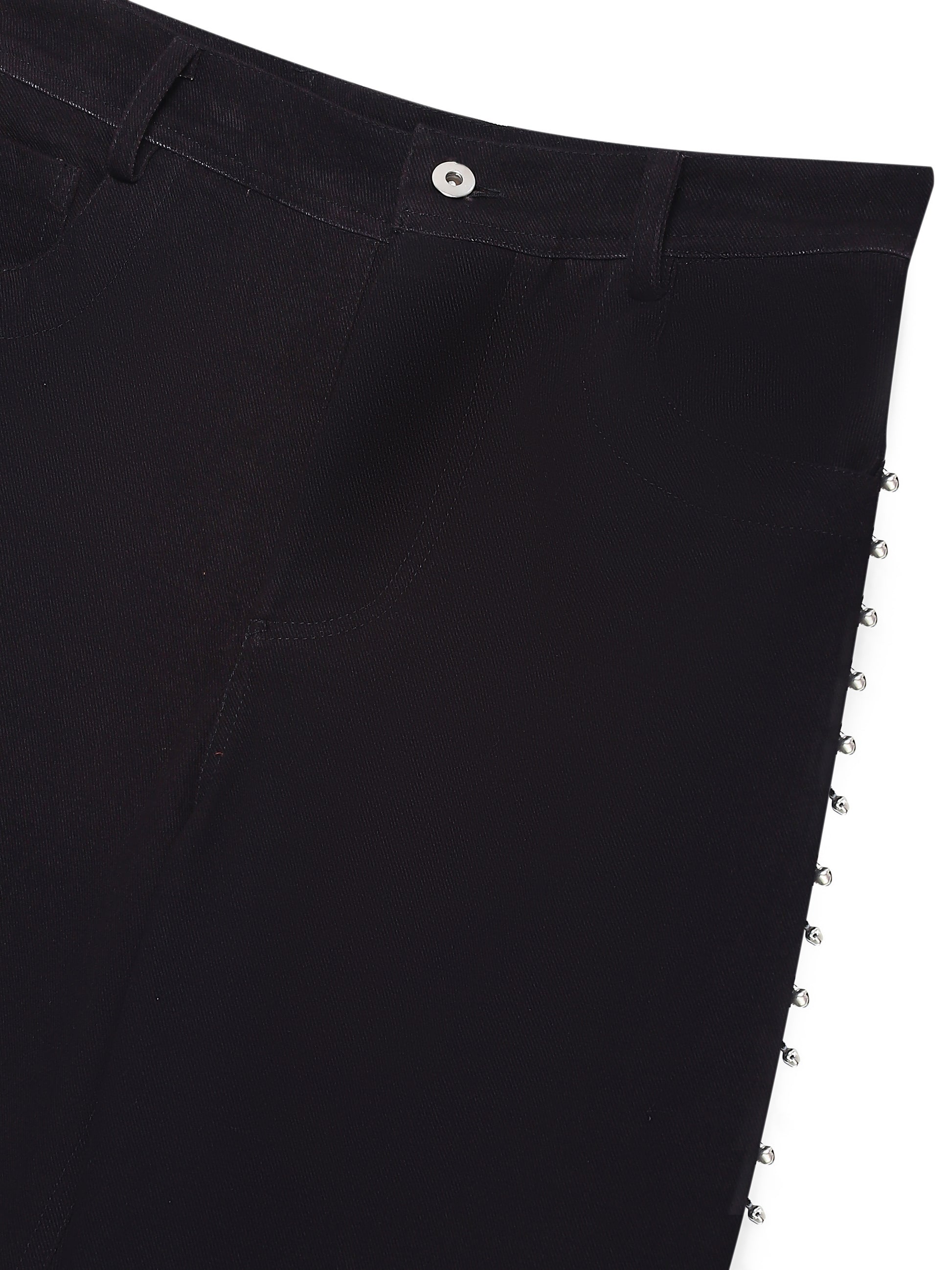 PRODUCT DESCRIPTION: NATURALLY-DYED BLACK NON-STRETCH DENIM TROUSERS WITH FOUR POCKETS, AND EMBELLISHED WITH HAND-STITCHED METAL TRIMS ON BOTH SIDE SEAM.