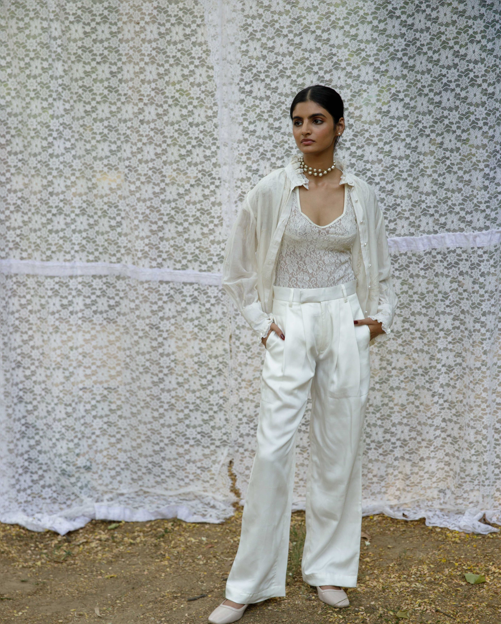 These ivory pants are crafted from twill weave silk and cotton blend, with its double pleat details, gives a refined clean look.