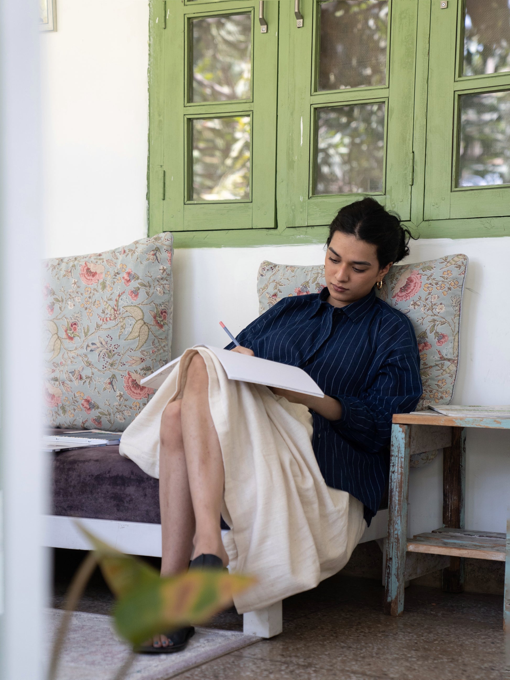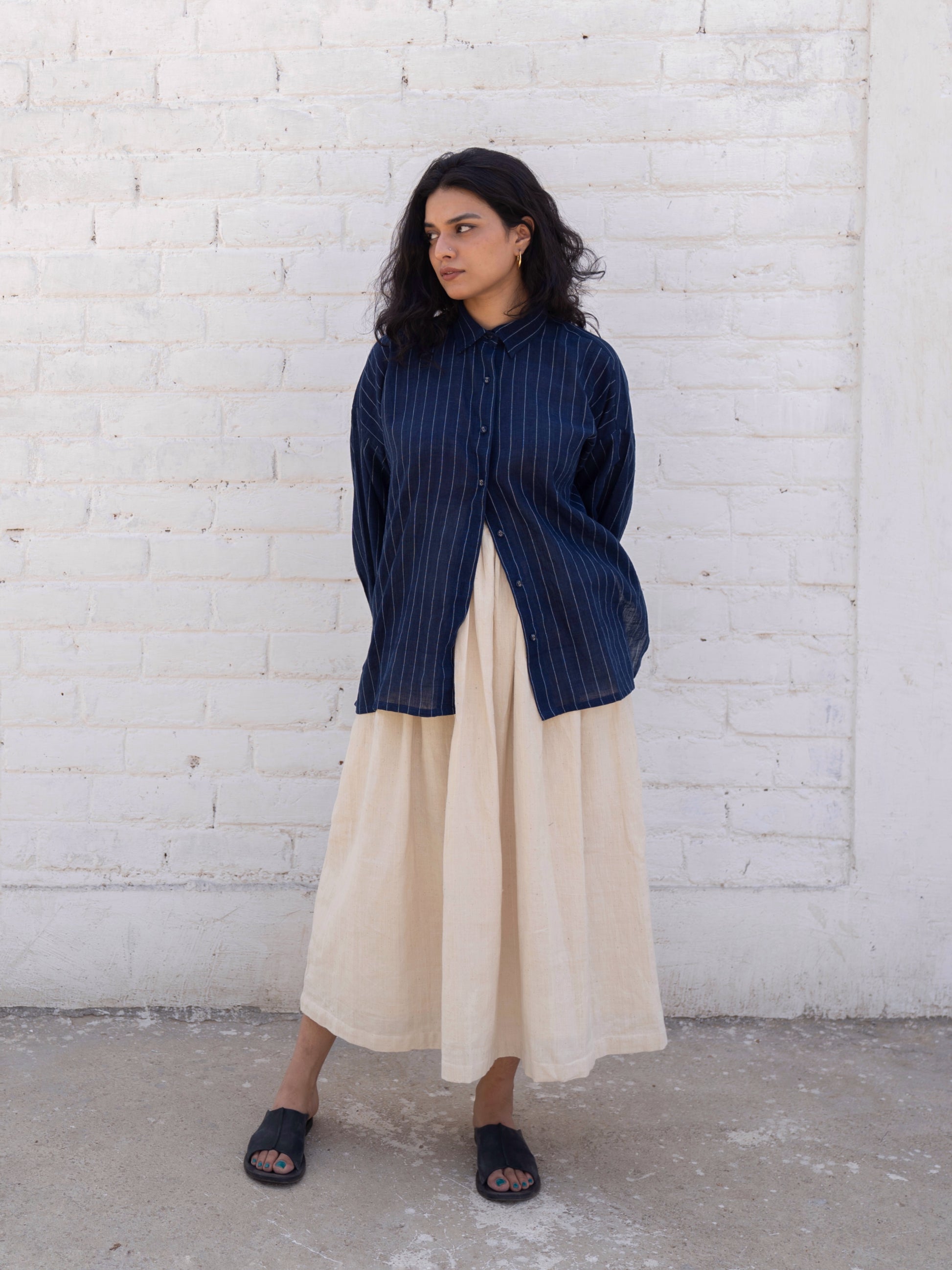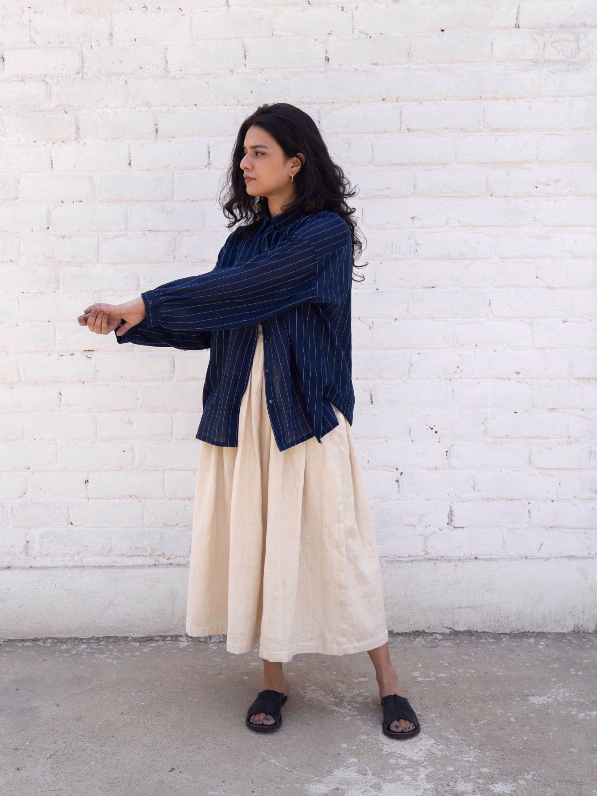 At its core, with N. celebrates simplicity and slowness. The label does not follow seasonal drops. Instead, it introduces pieces organically—when inspiration strikes, or when a textile speaks to them in a way that cannot be ignored. Each garment embraces the quiet irregularities of handloom—loose threads, slight variations, and asymmetry that signal the unmistakable presence of the human hand. It is this celebration of imperfection that defines with N.’s design language.