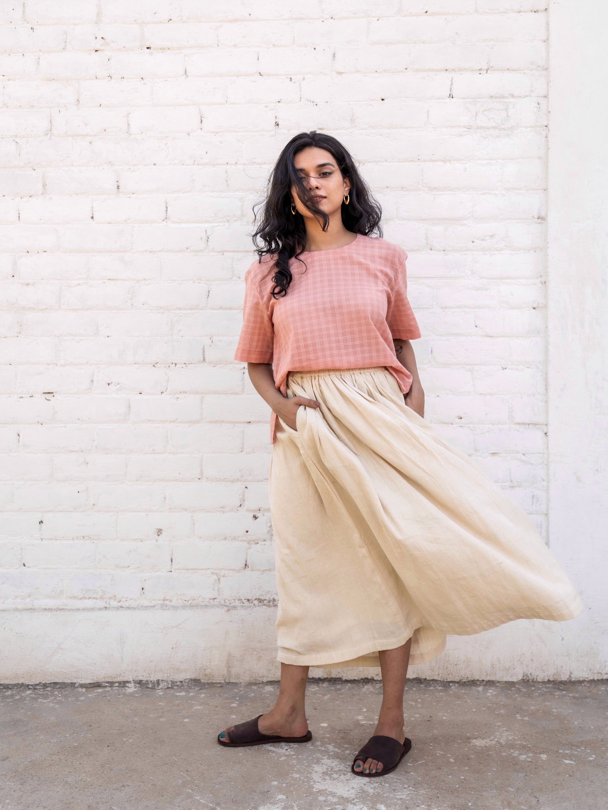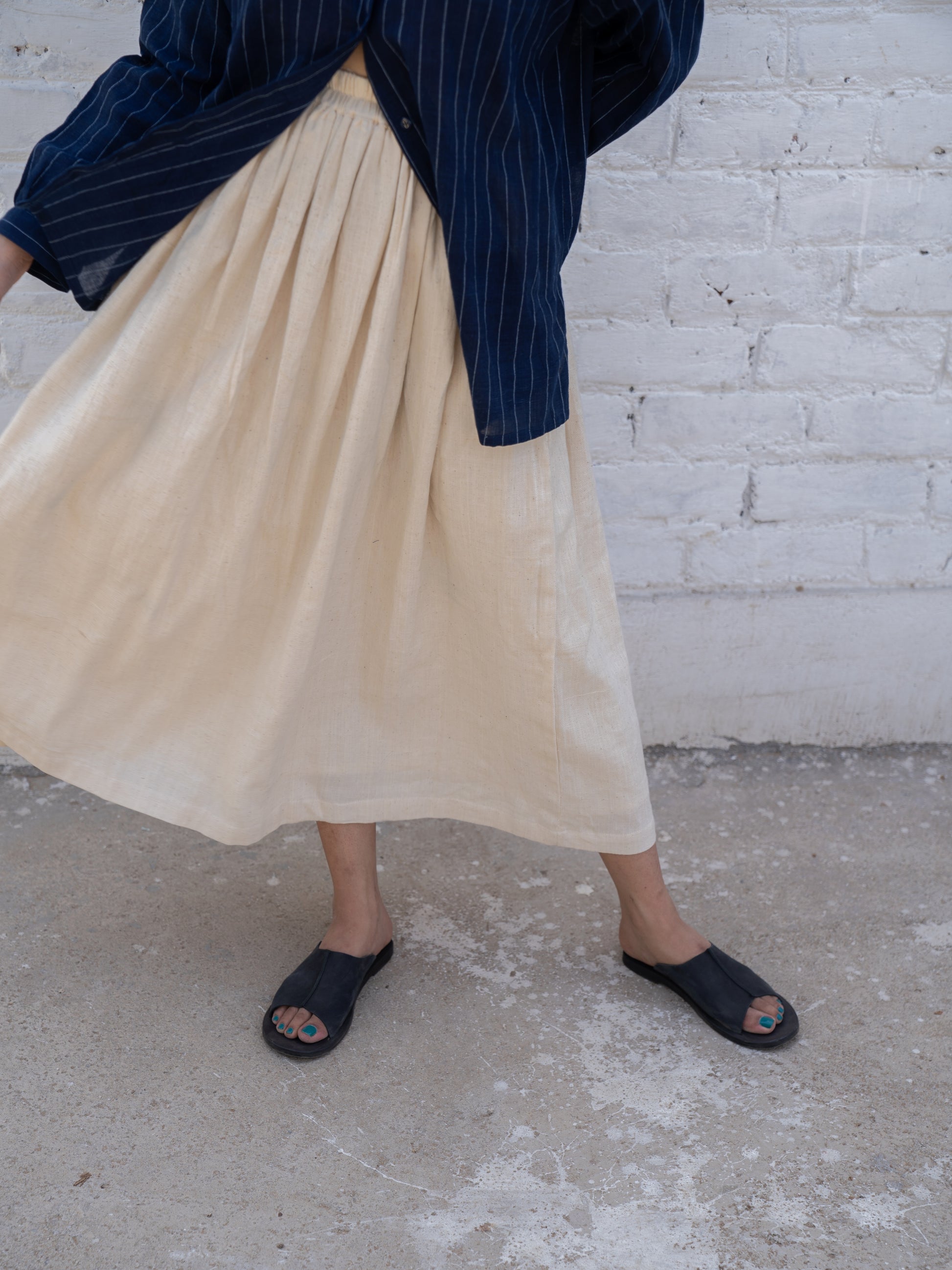 A fun summer skirt in handwoven cotton with a twill weave. Gathers at the waist, with a fully elasticated band. Pockets on both sides. Lined with handwoven cotton.