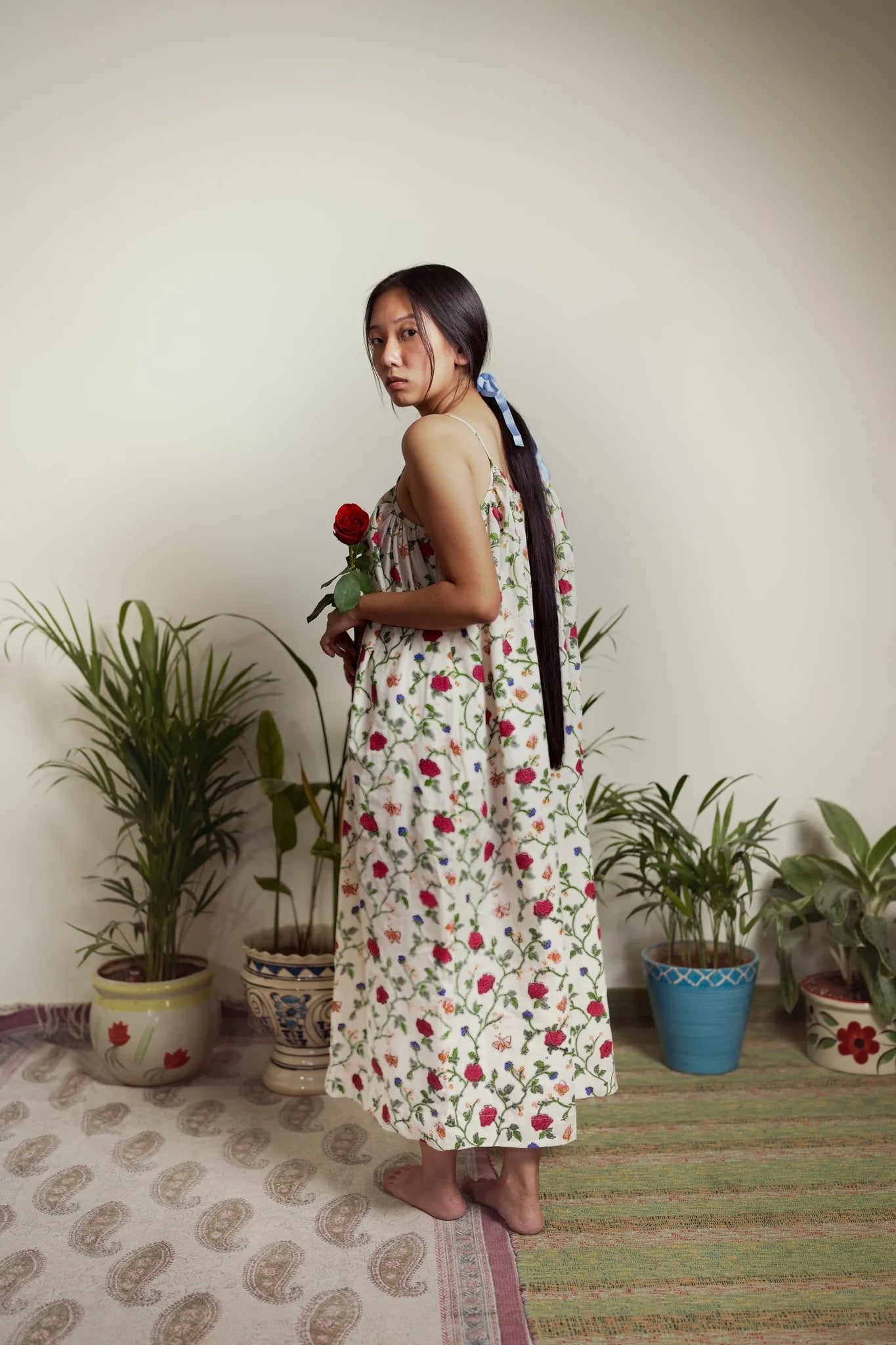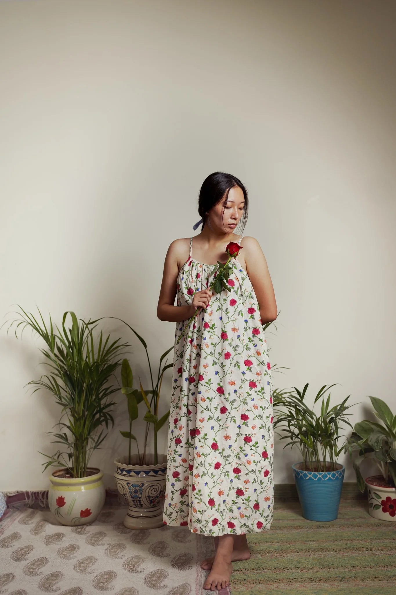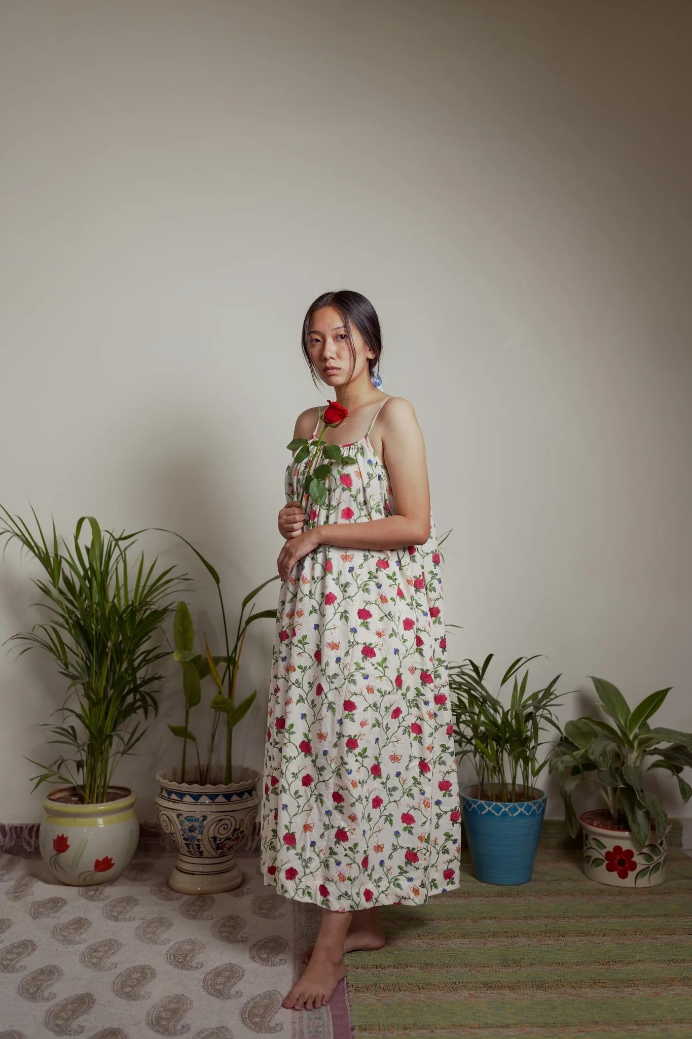Noodle strap gathered long dress in our hand block printed Gulabi.