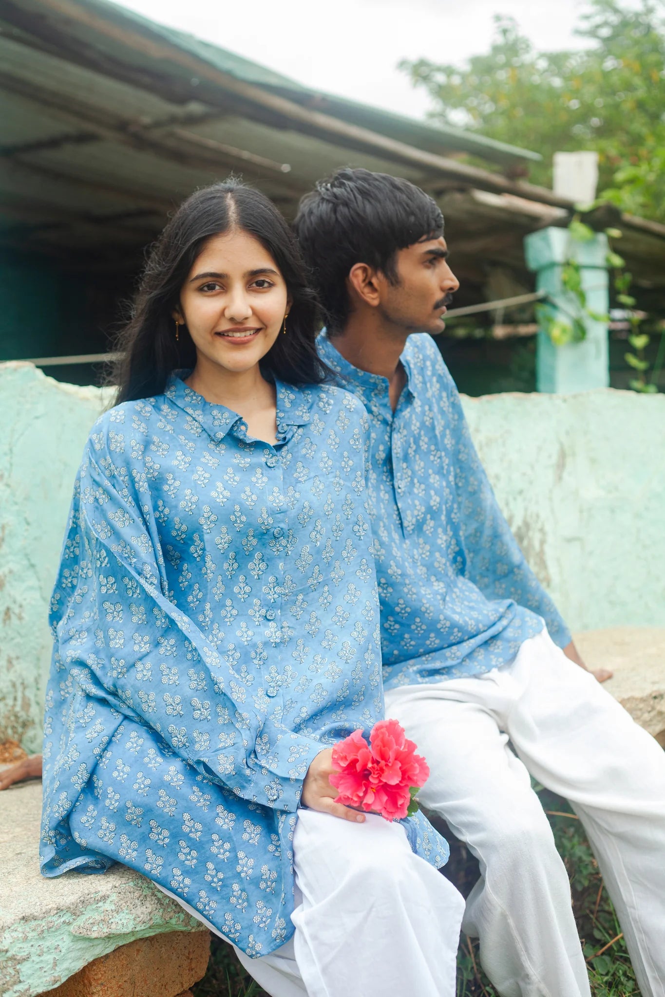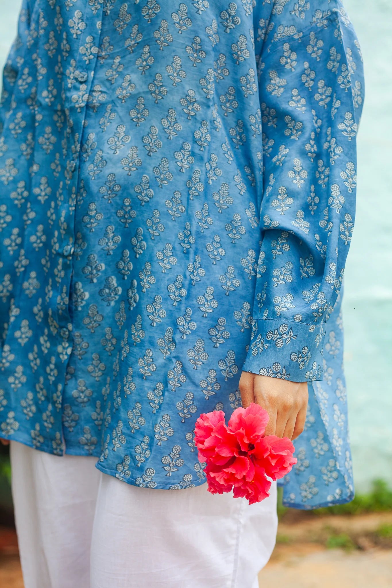 Classic oversized silk shirt in natural indigo, with hand-block printed floral motifs