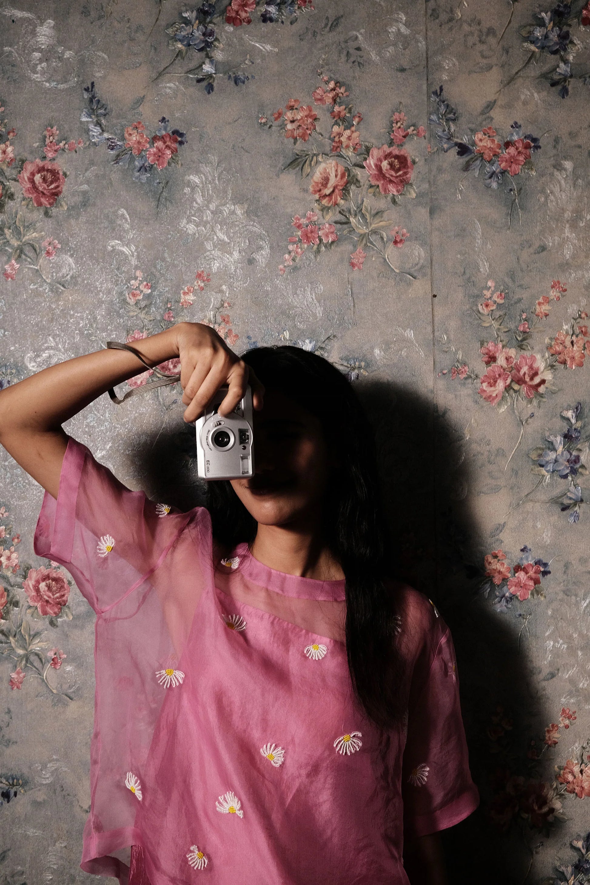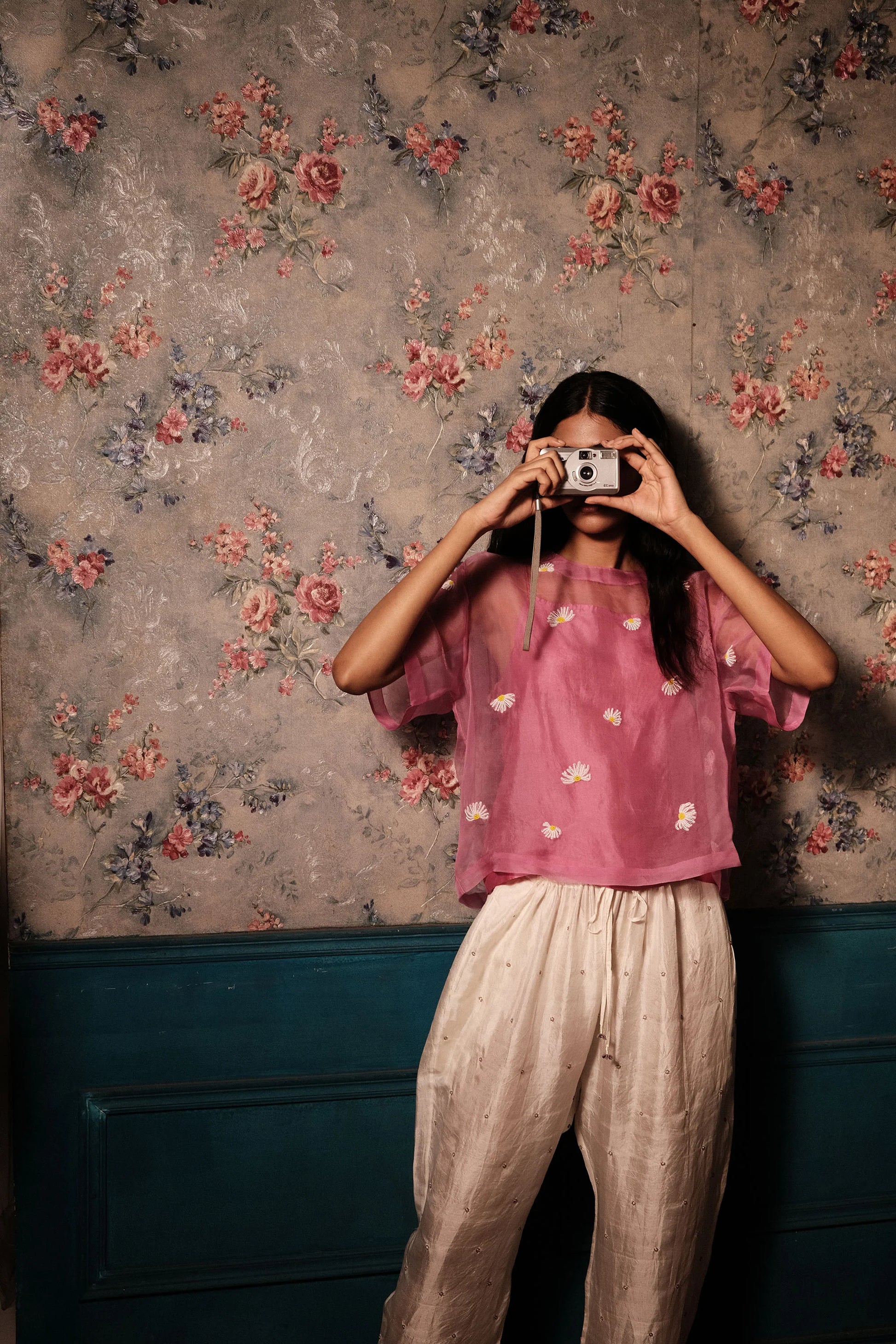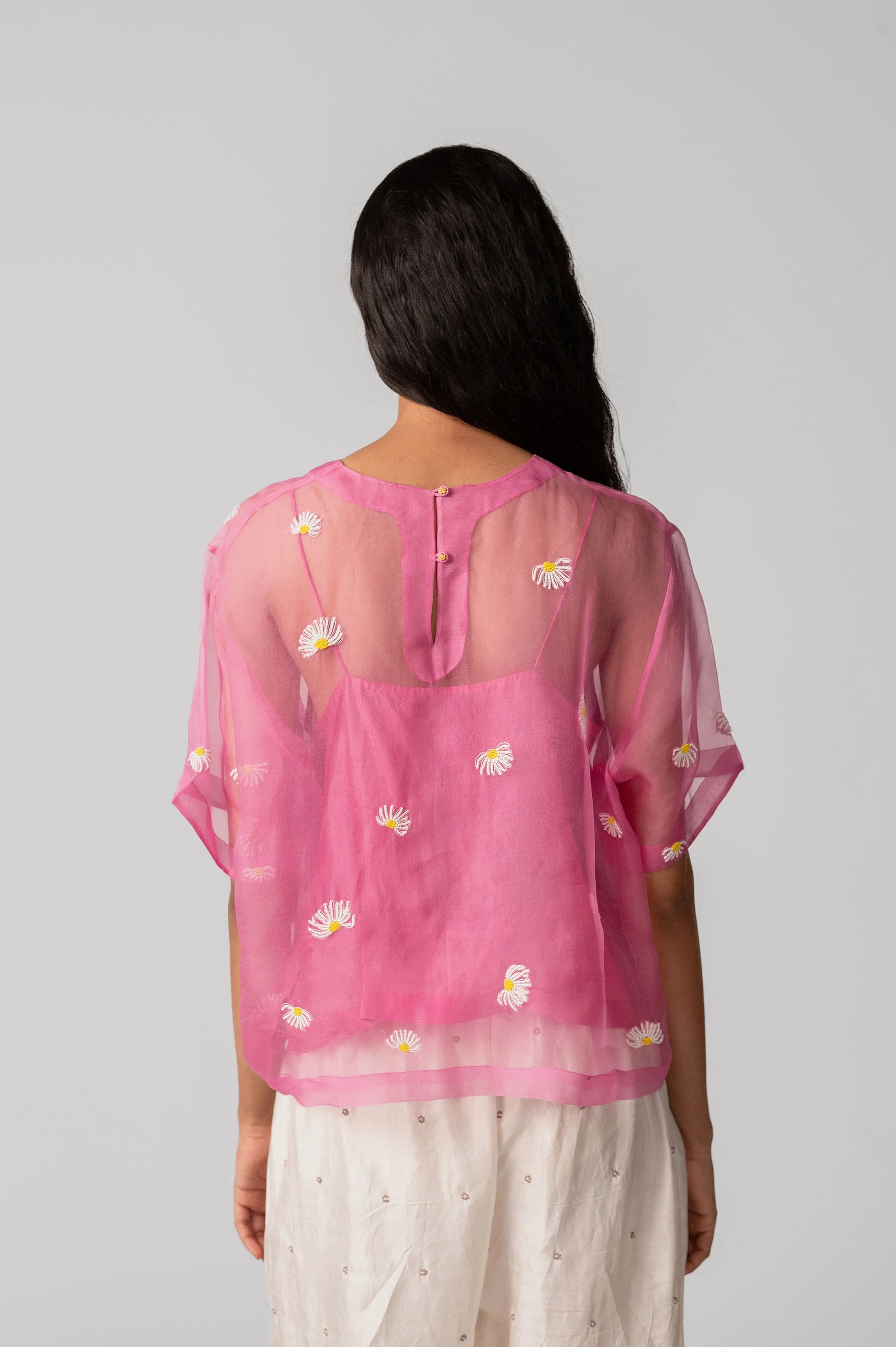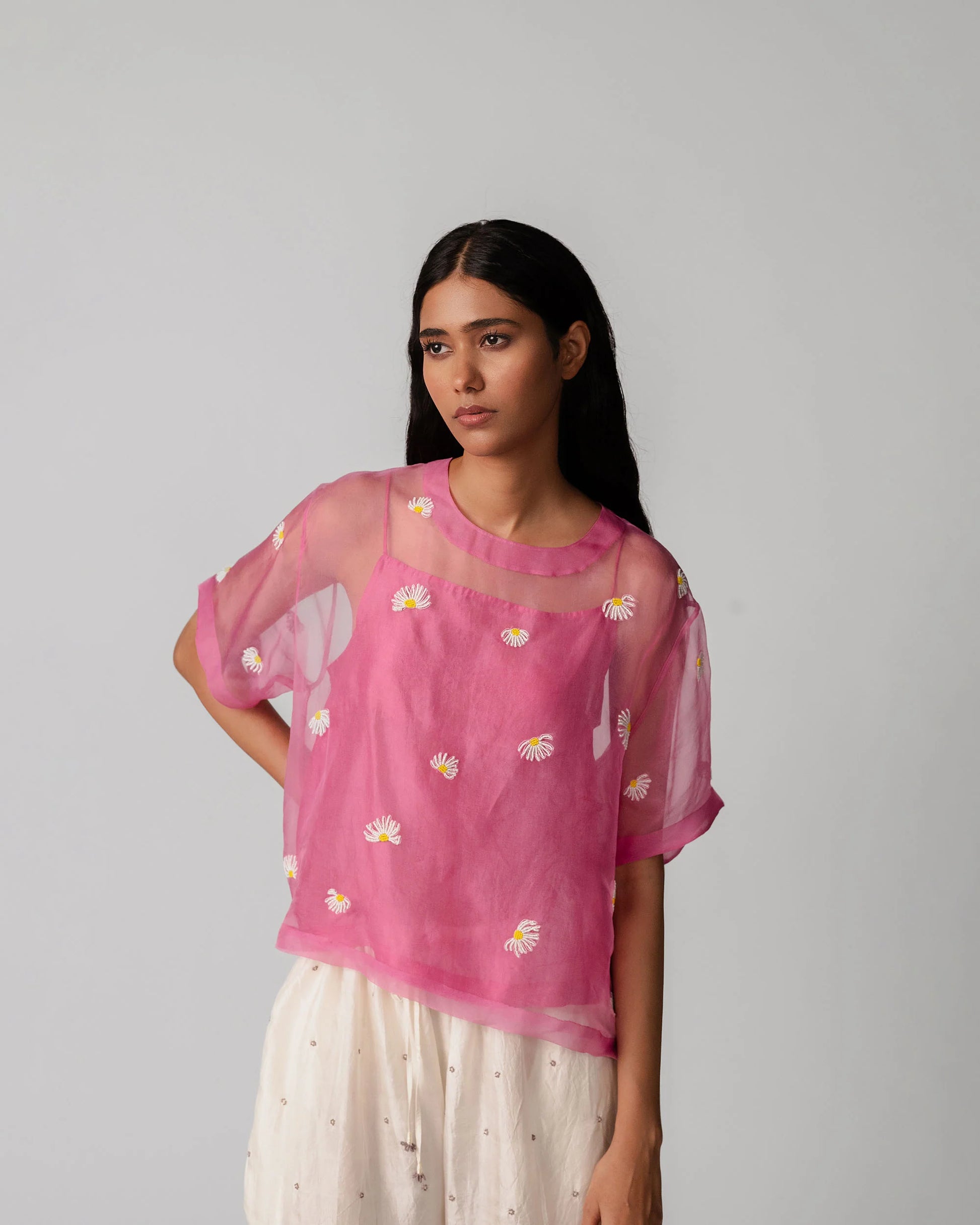 The Gulbahar Pink Organza Top by Serai is a beautifully ethereal piece made from sheer organza silk fabric. Its delicate, lightweight texture is complemented by a cotton/silk slip underneath, providing coverage while maintaining the top's translucent charm. The top features a minimalist floral design, enhancing its elegant and airy appearance.