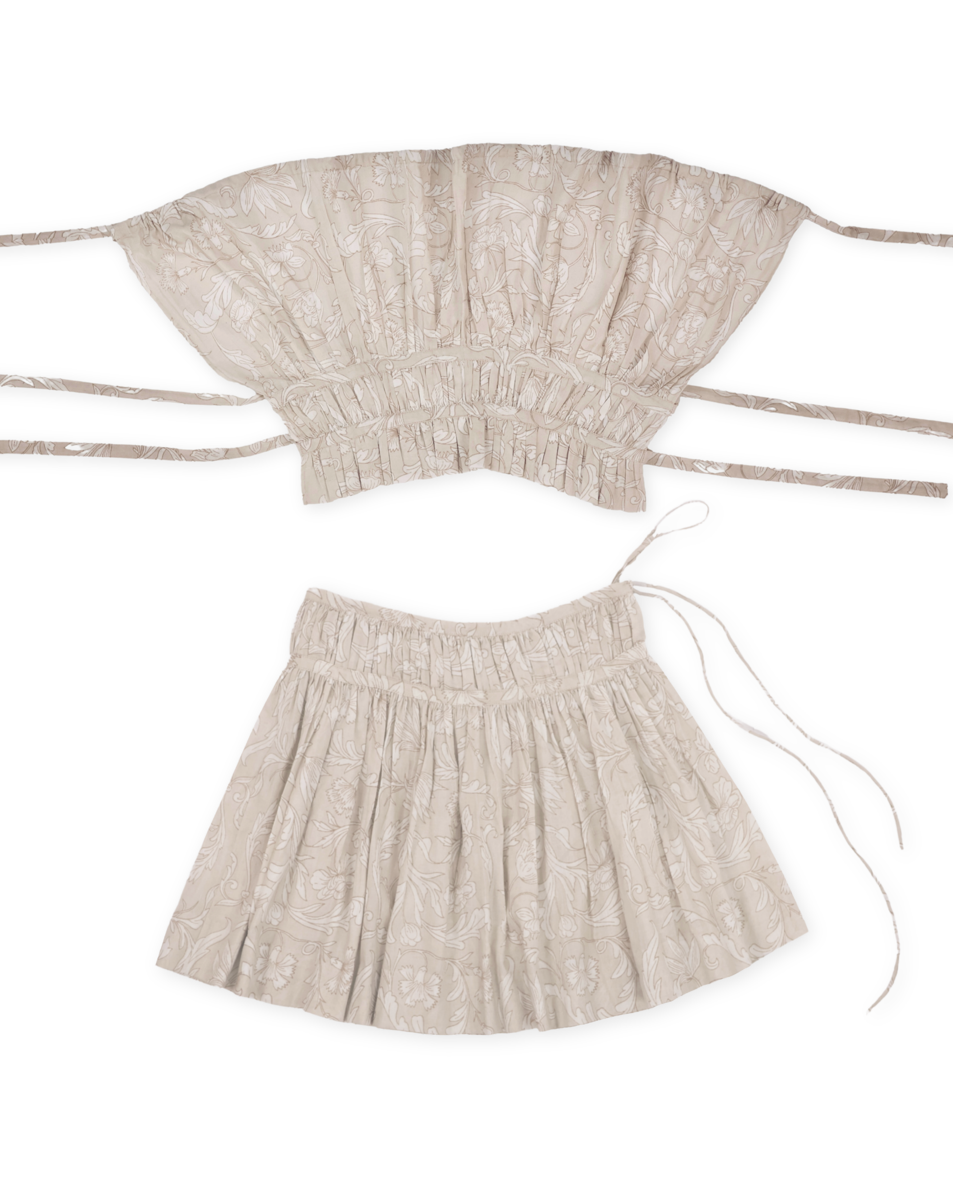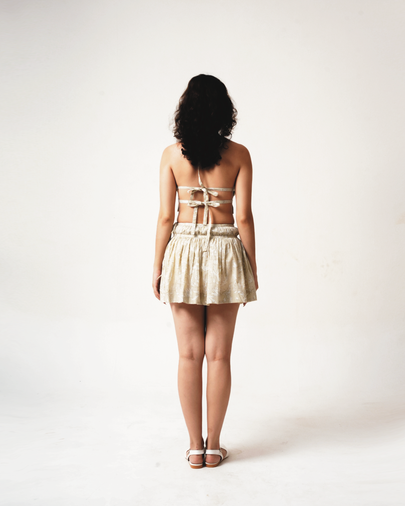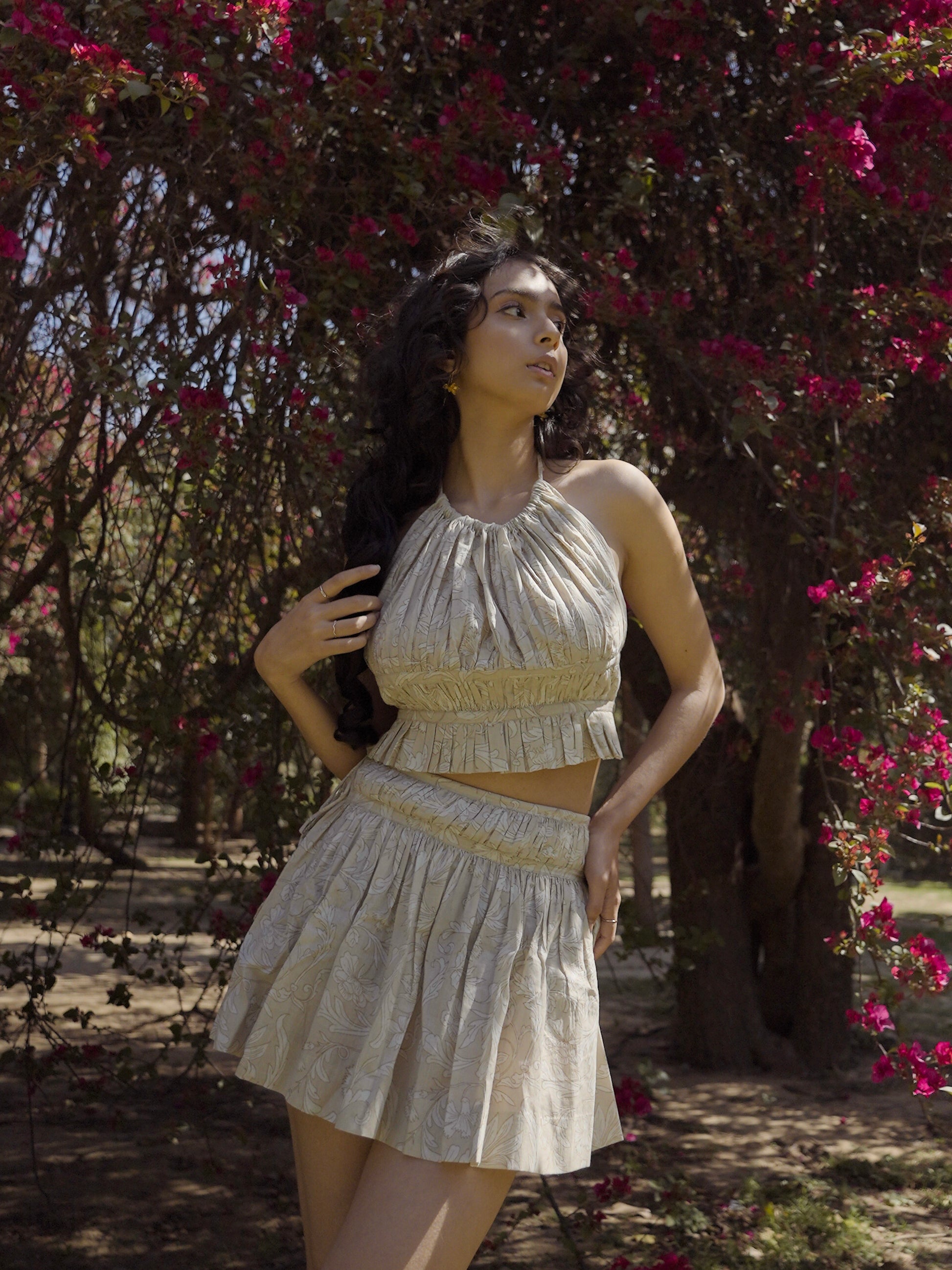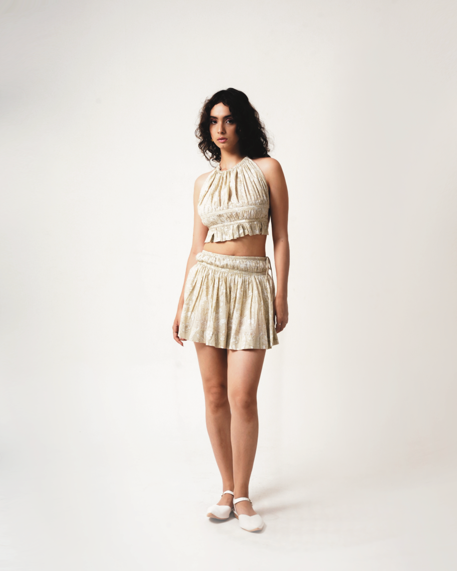 This stunning two-piece set blends sophistication with playful charm, featuring a cropped halter top and a flared gathered mini skirt that work seamlessly as one elegant ensemble. The halter neckline gracefully highlights the shoulders, while delicate pleating and tie-back closures offer both structure and flexibility. The coordinating mini skirt mirrors the top’s soft pleats, enhancing movement and flow. Designed in airy, breathable fabric with subtle floral print. Perfect for summer brunches, casual gatherings, or evening soirees.