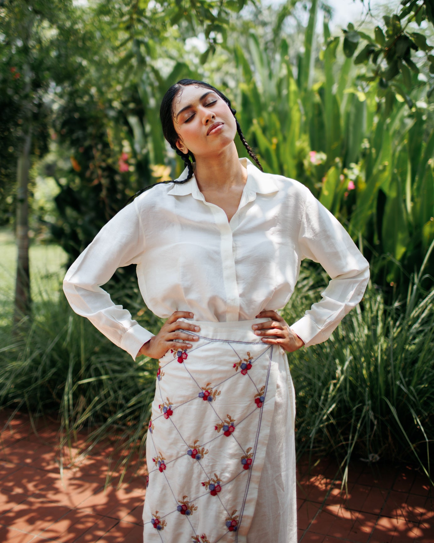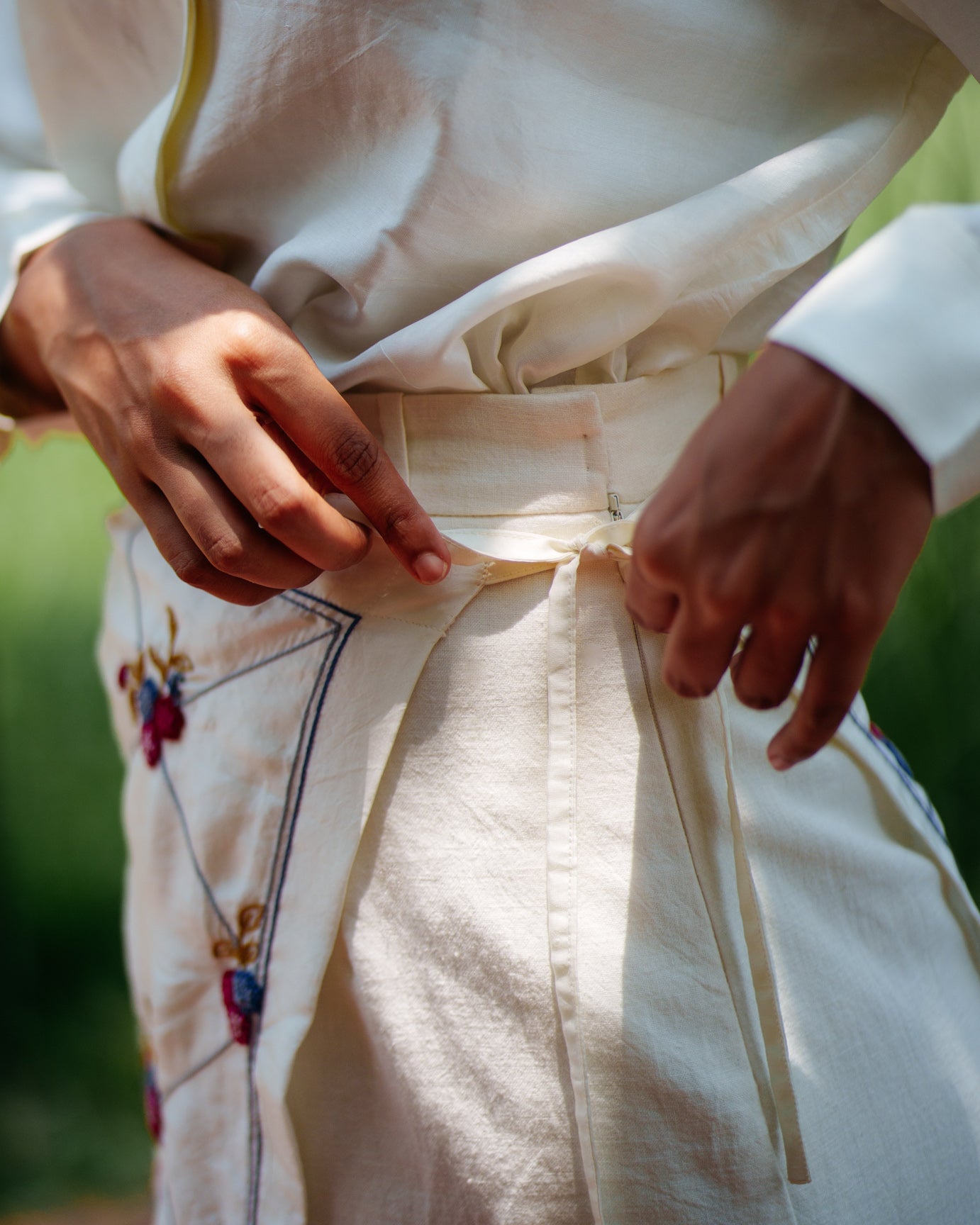 Crafted in handwoven Mulberry silk, this tie-up features intricate hand-embroidered motifs and delicate side string fastenings. Designed as an overlay, it can be styled over a skirt, trouser, or dress to elevate any look with a statement layer.