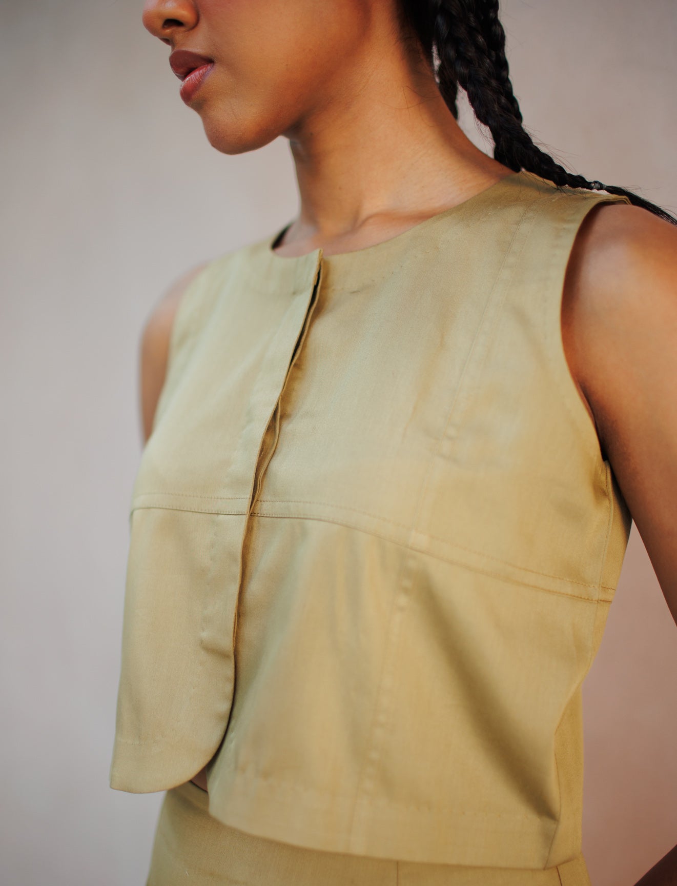 A panelled, button-down top crafted in GOTS-certified organic cotton. It features a hidden placket, a rounded hemline, and a classic crew neckline—designed for effortless everyday wear with refined details.