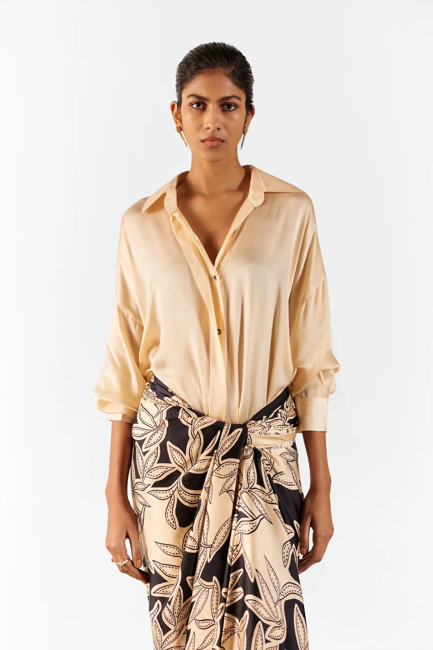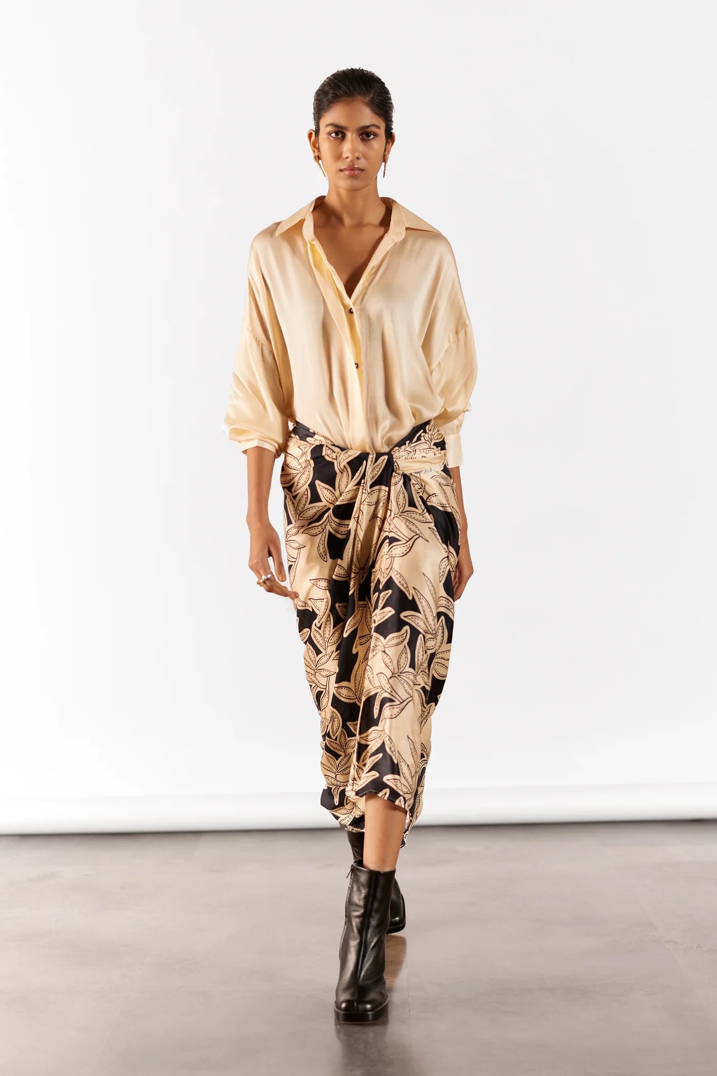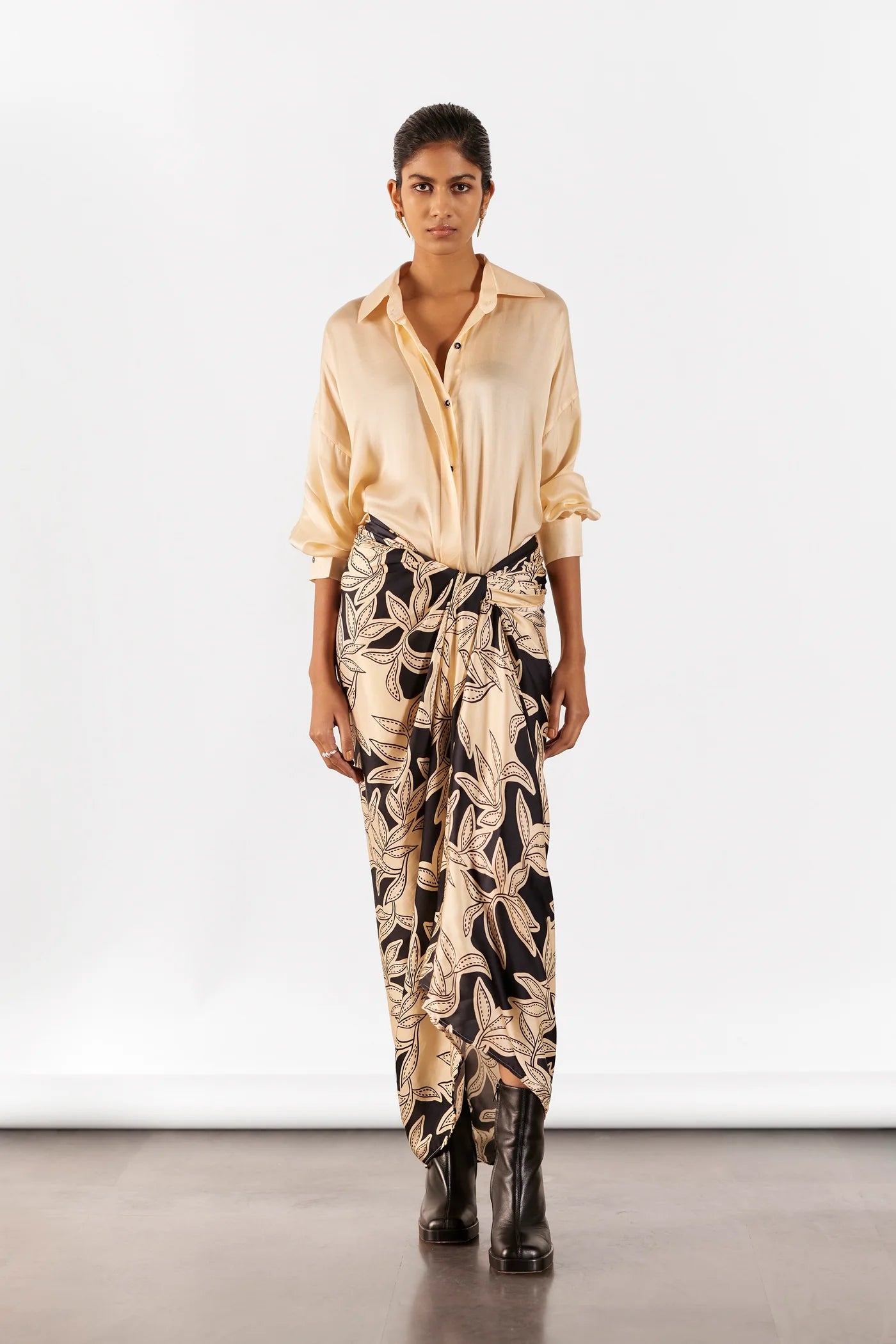 The Hazel Shirt Draped Dress crafted from our stunning Vegan Silk fabrication, trans-seasonal, is a statement piece. Made in our hand drawn Hazel print inspired by the wild blooms of winter, it is an attached dress. With a contrast shirt on top, it is chic. Featuring a draped skirt, this piece can be tied with a knot and can be styled in different ways. Wear it with heels for an elegant look.
