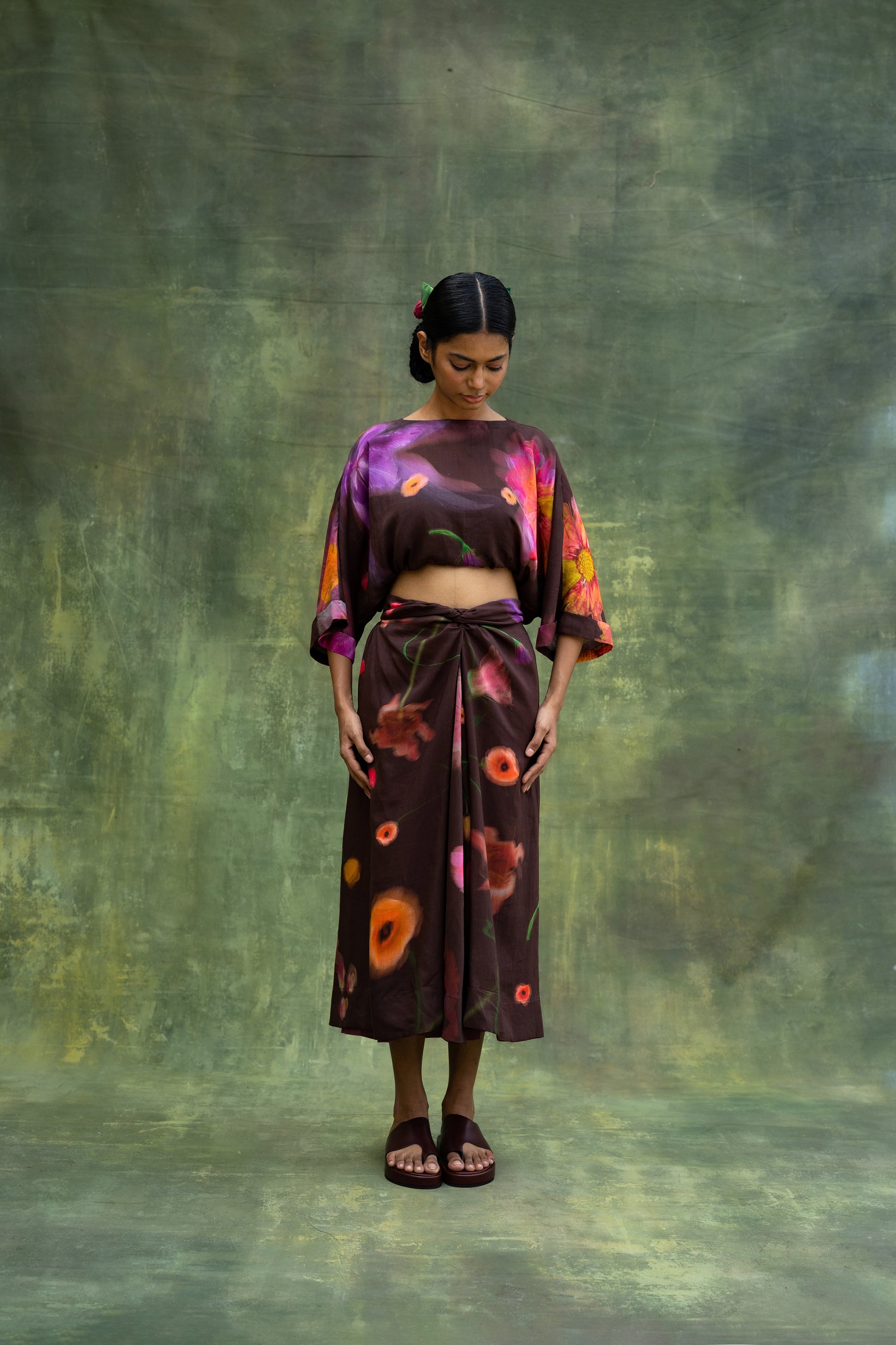 This set includes a short, boxy printed top with a front knot and a calf-length skirt featuring an elasticated back for a comfortable fit. Made from upcycled modal, tencel, and bamboo viscose, the fabric showcases a multi-color floral print on a brown base, blending sustainability with style.
