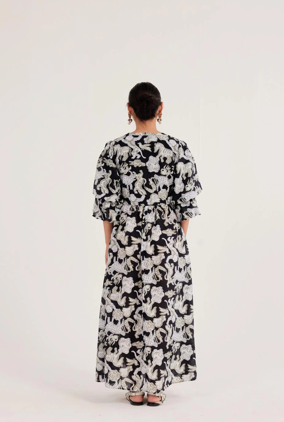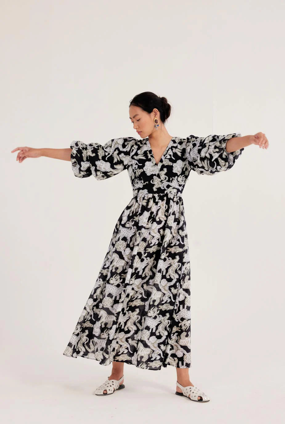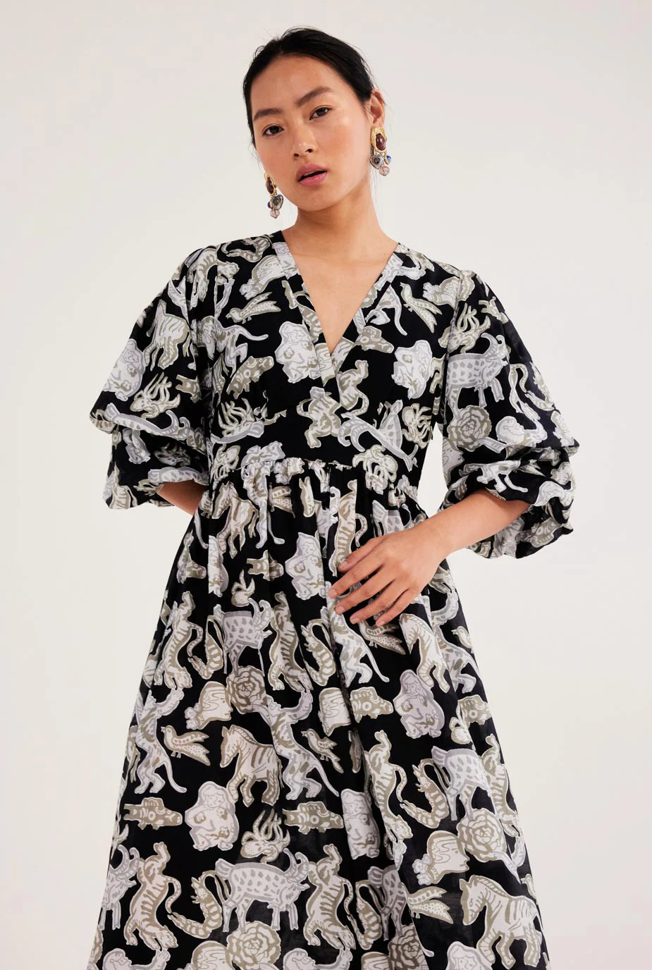 This stand out dress is crafted in bold hand printed animal motifs. This flowy maxi dress has dramatic doubly puffed sleeves and a plunging neckline framed by an empire waistline, ensuring a super flattering fit. Pair it with a headband or wide rimmed sunglasses for the perfect vintage look.