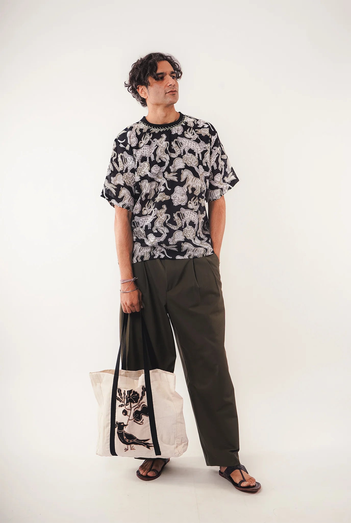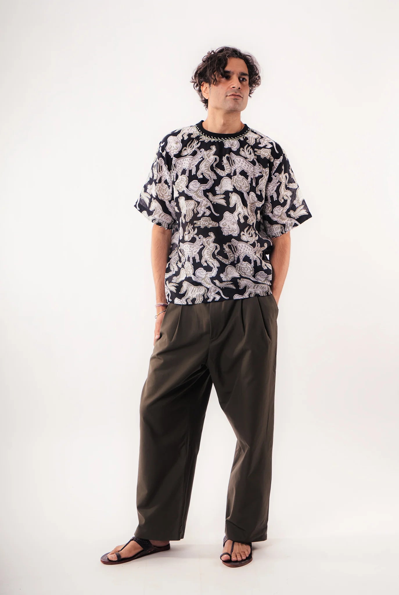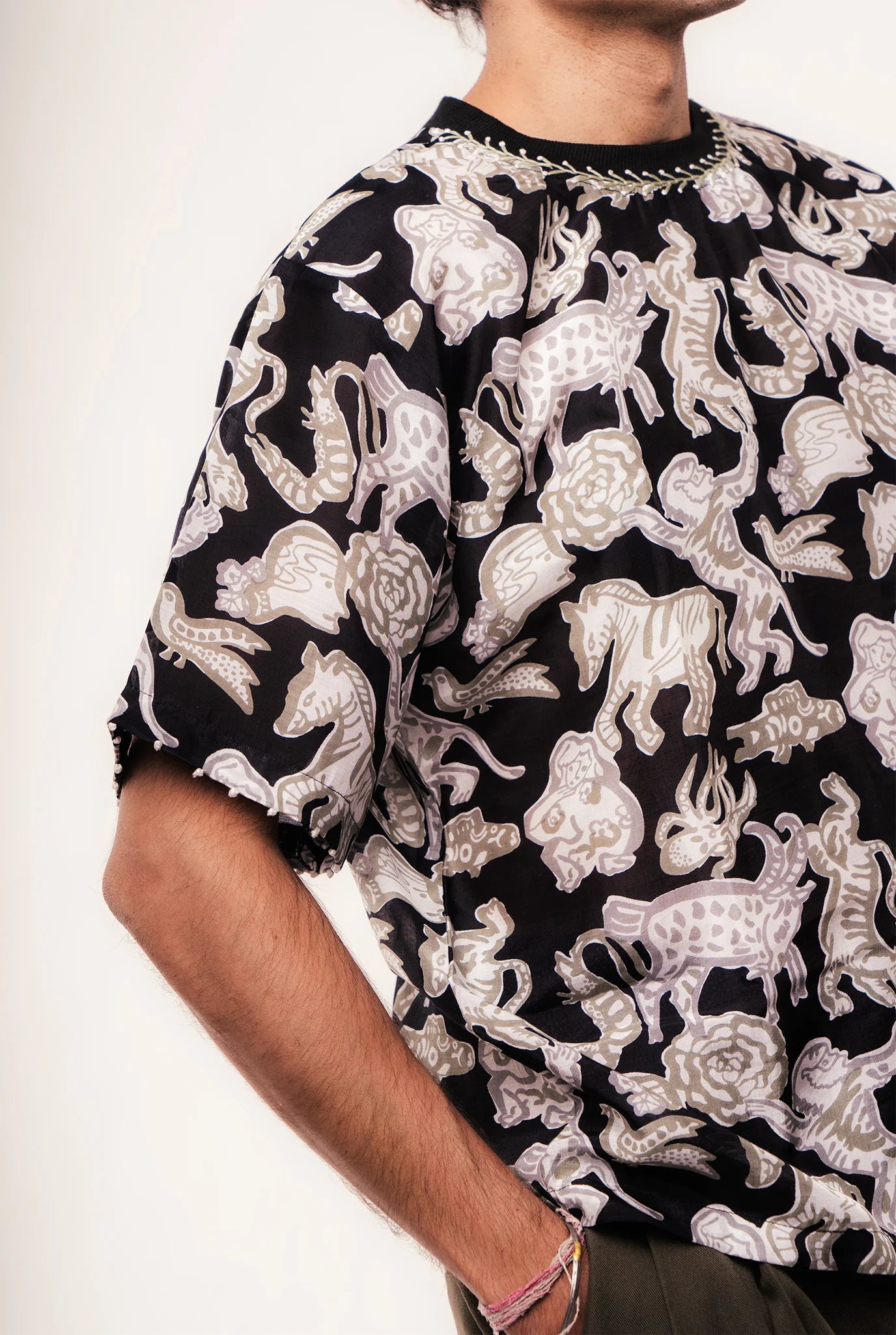 A tshirt so nice, you’ll want to wear it twice. Handblock printed woven t-shirt with a ribbed neck and hand embroidery.