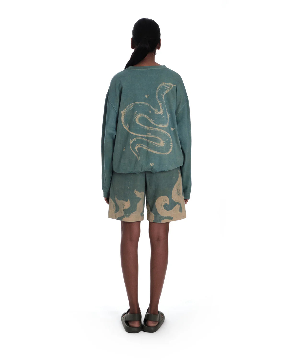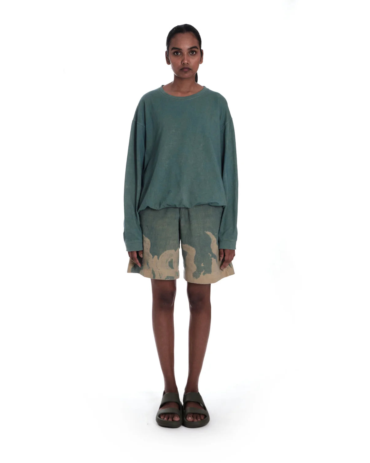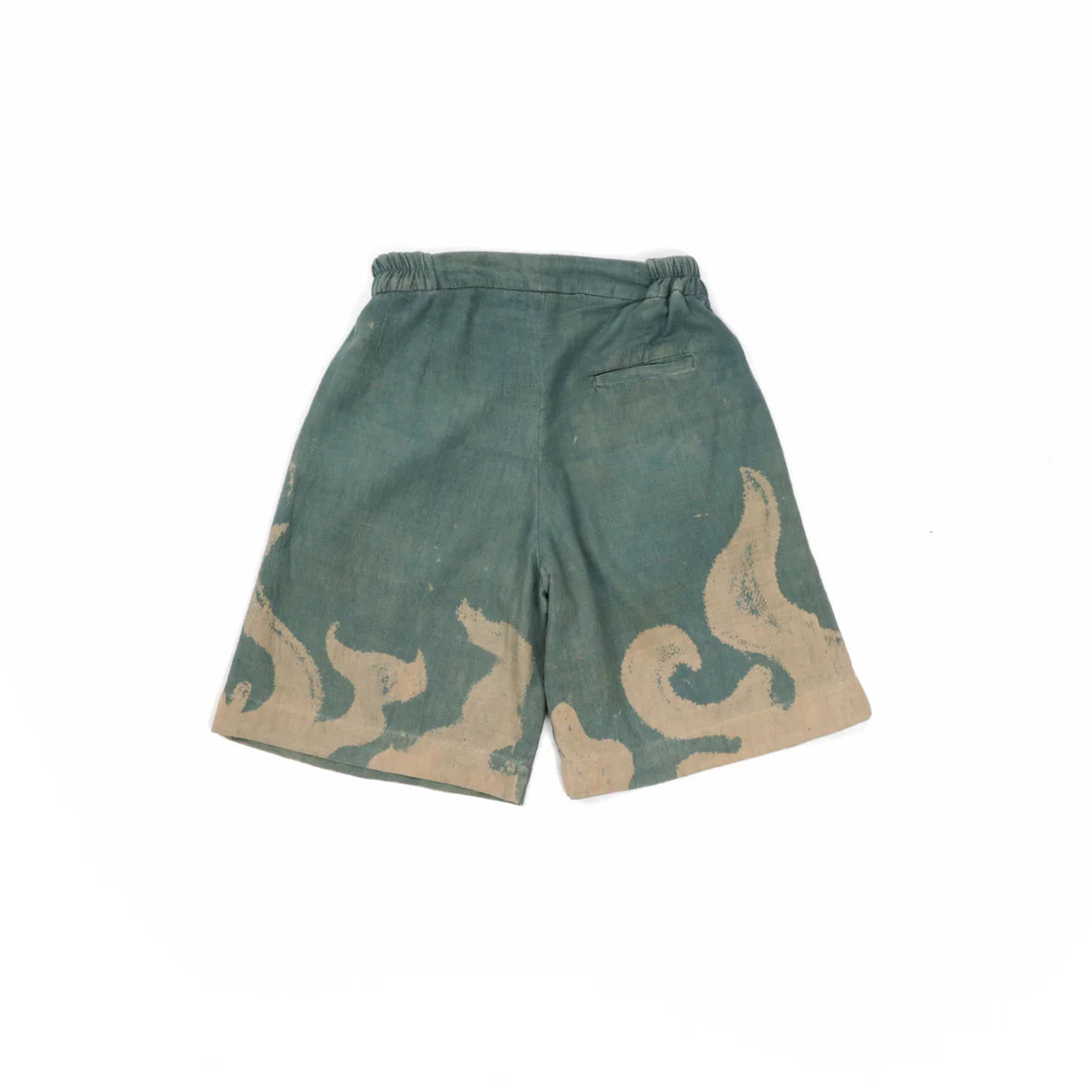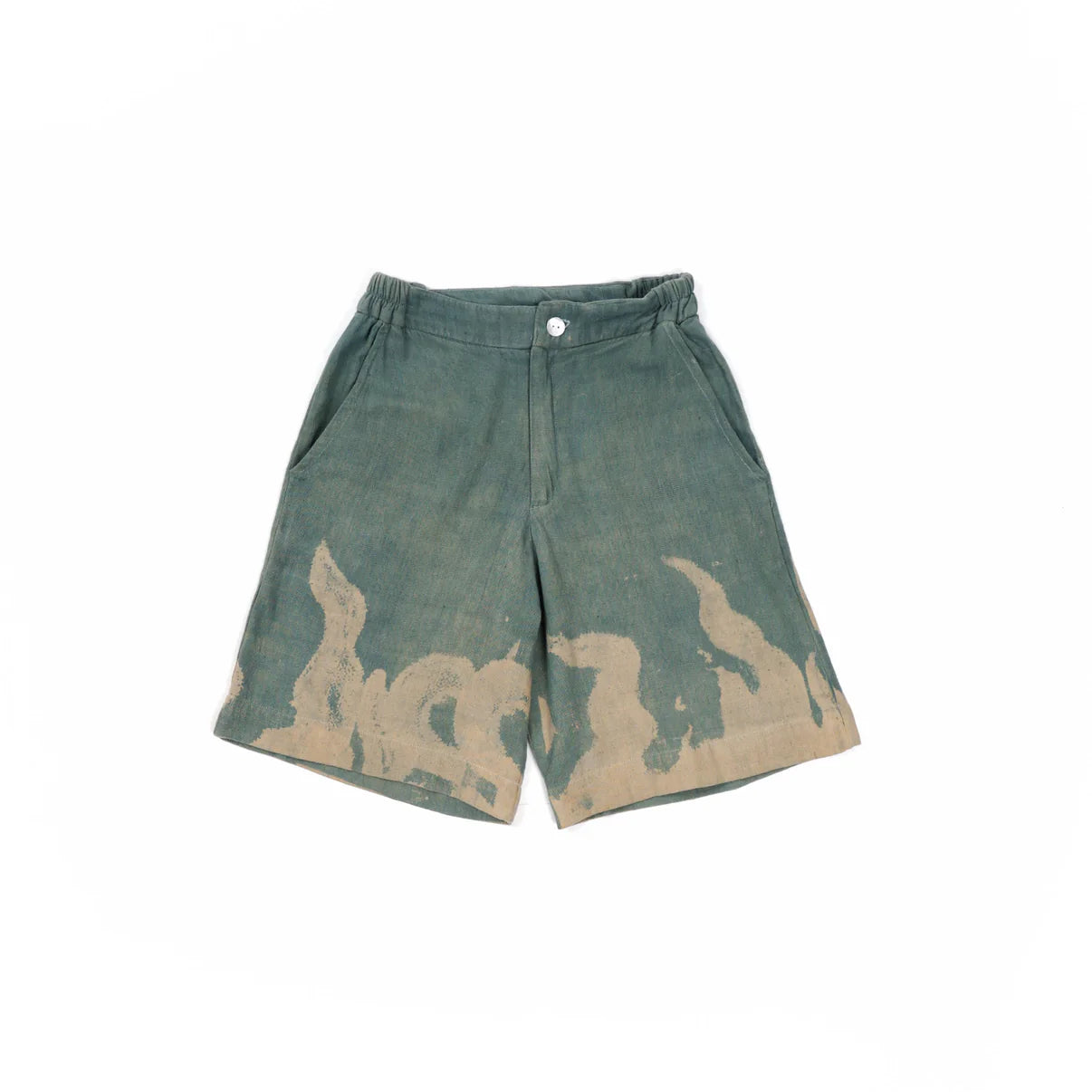 Bakr’s plain unisex shorts with side elastics, in the shade “forest green” is hand-dyed in a 100% extract of myrobalan flowers, resist printed and over-dyed in-house with our organic honey indigo fermentation.