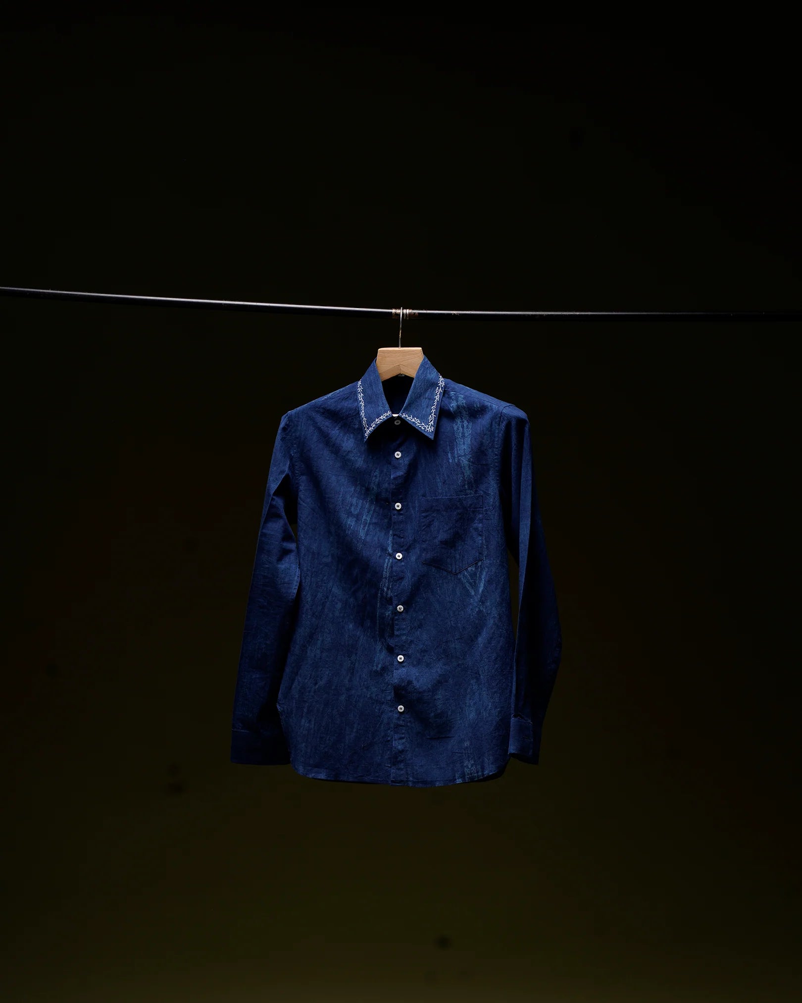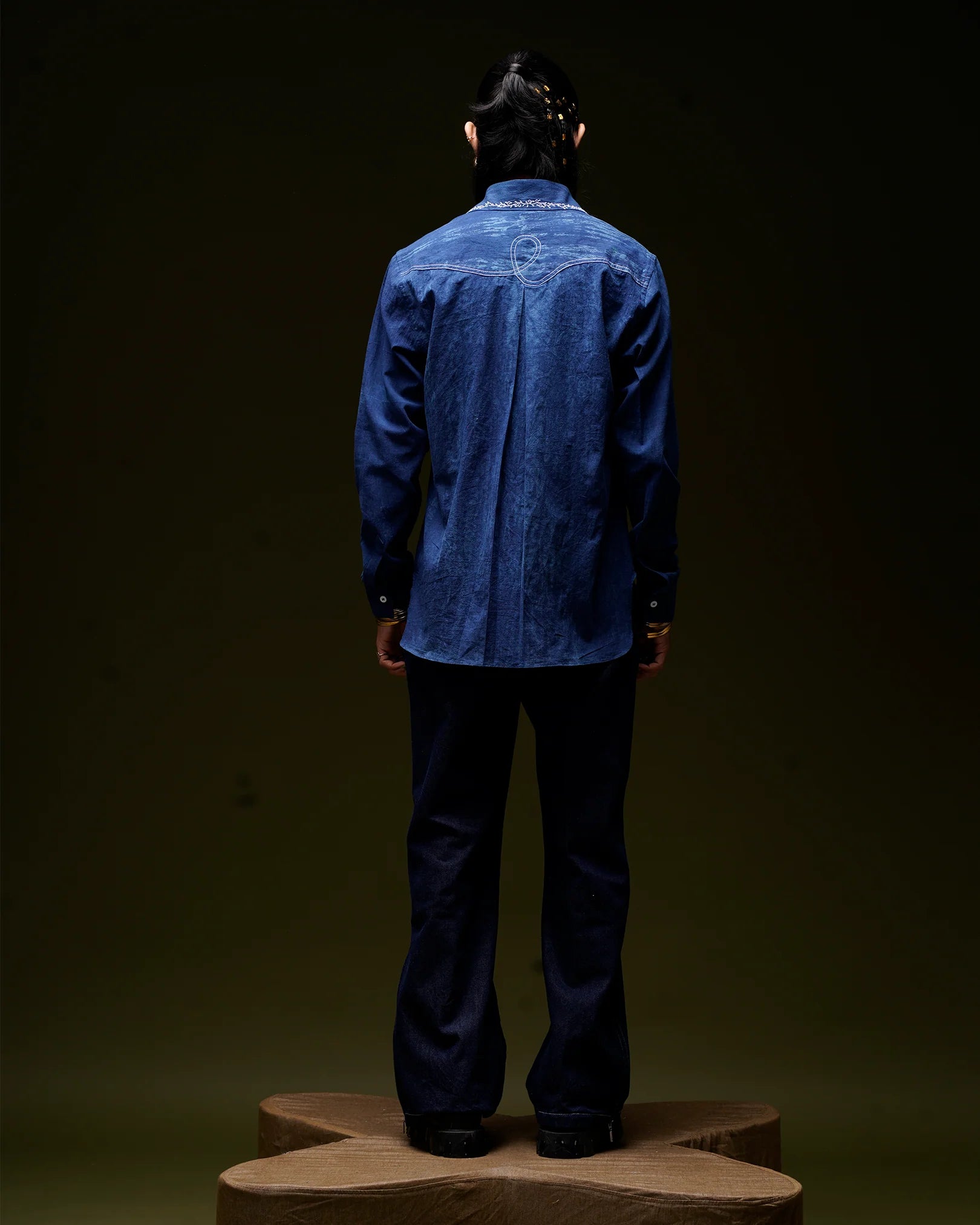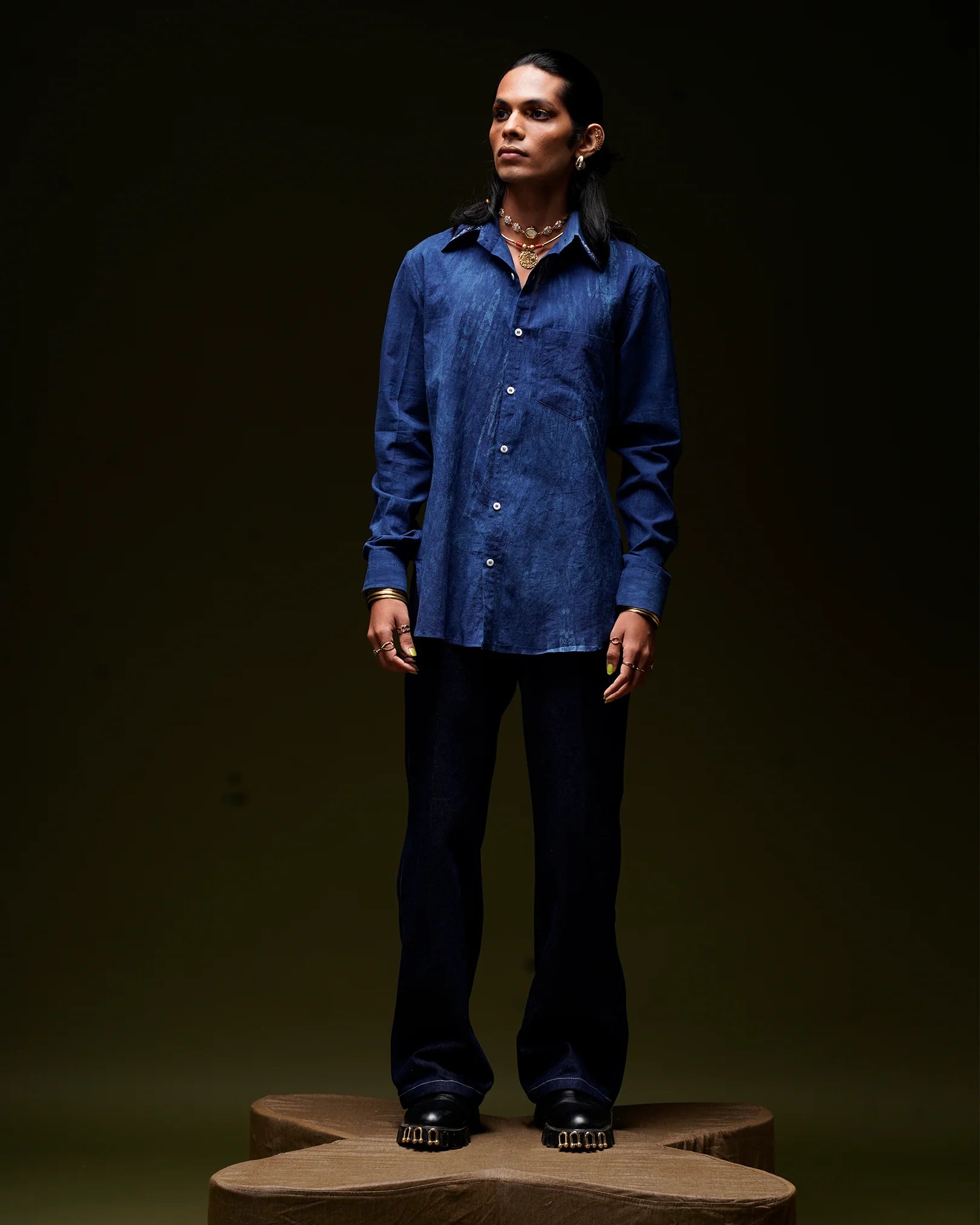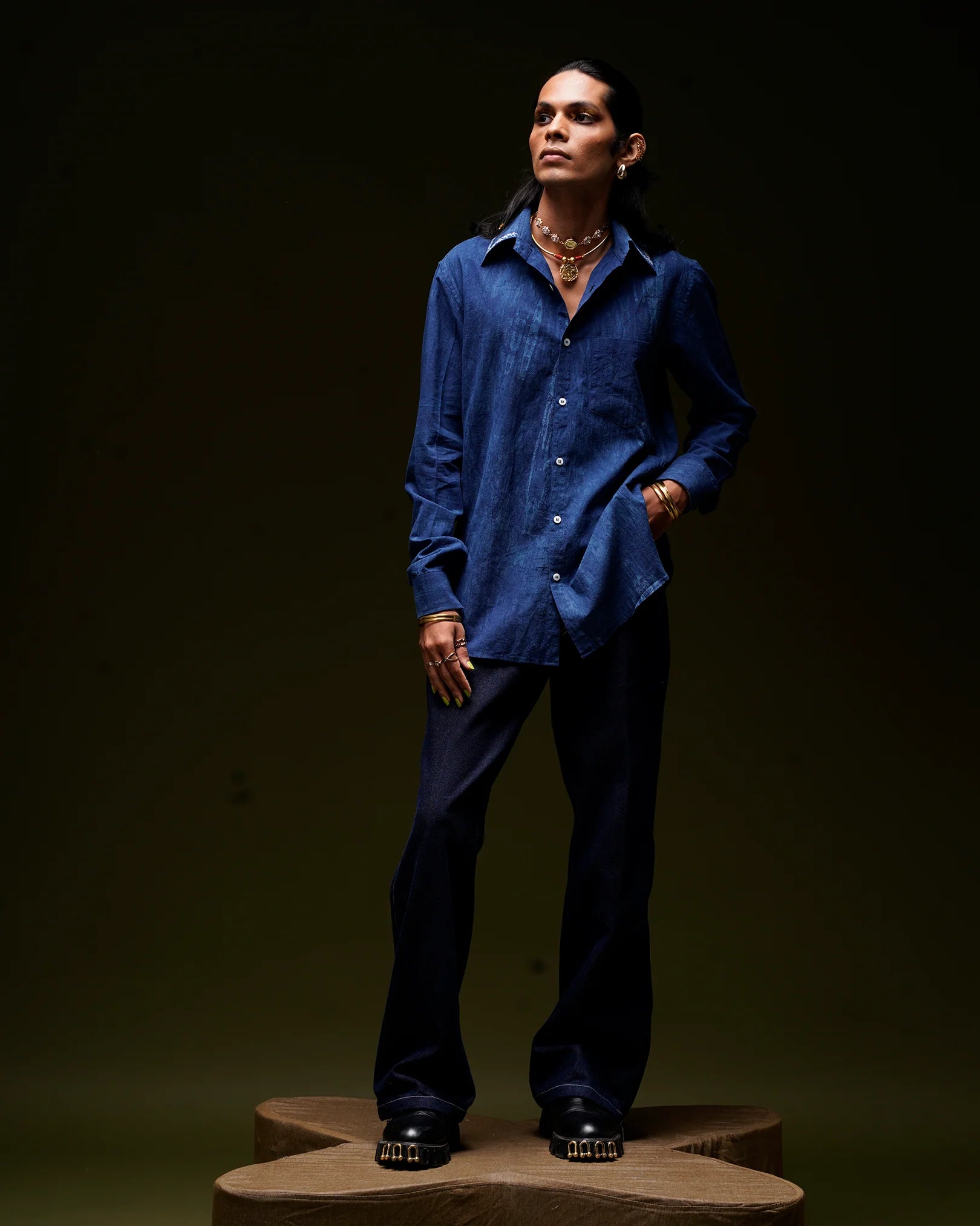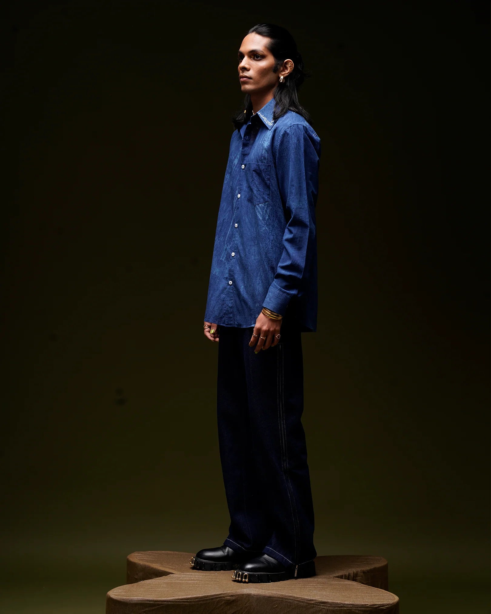 Indigo Arambh is an indigo cotton shirt featuring intricate Tamil border motif embroidery. Crafted from soft, breathable cotton, this regular-fit shirt offers exceptional comfort. It boasts a classic collar, full sleeves, and hand-embroidered detailing on the collar, adding a touch of elegance. This staple piece is designed to bring out your inner charisma with timeless charm.