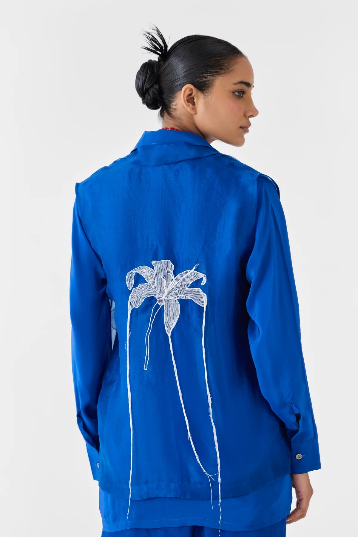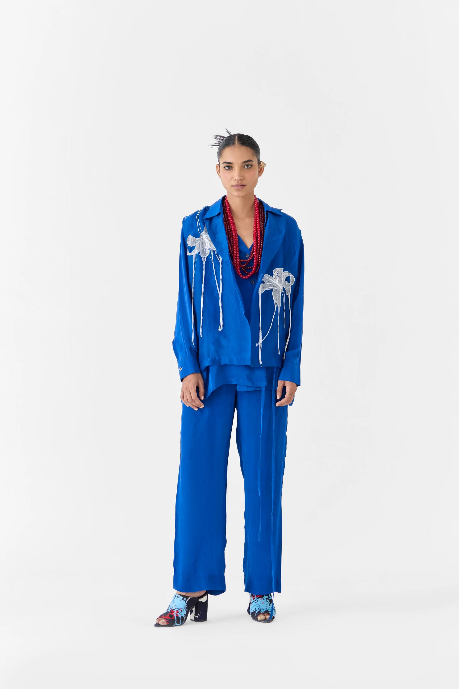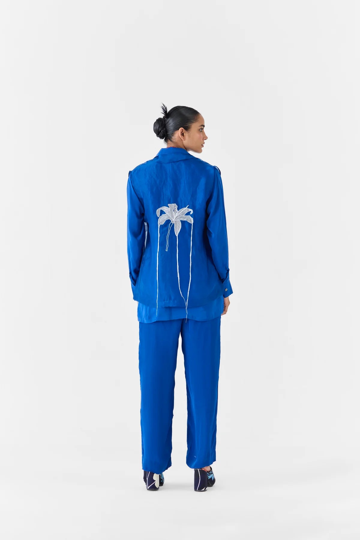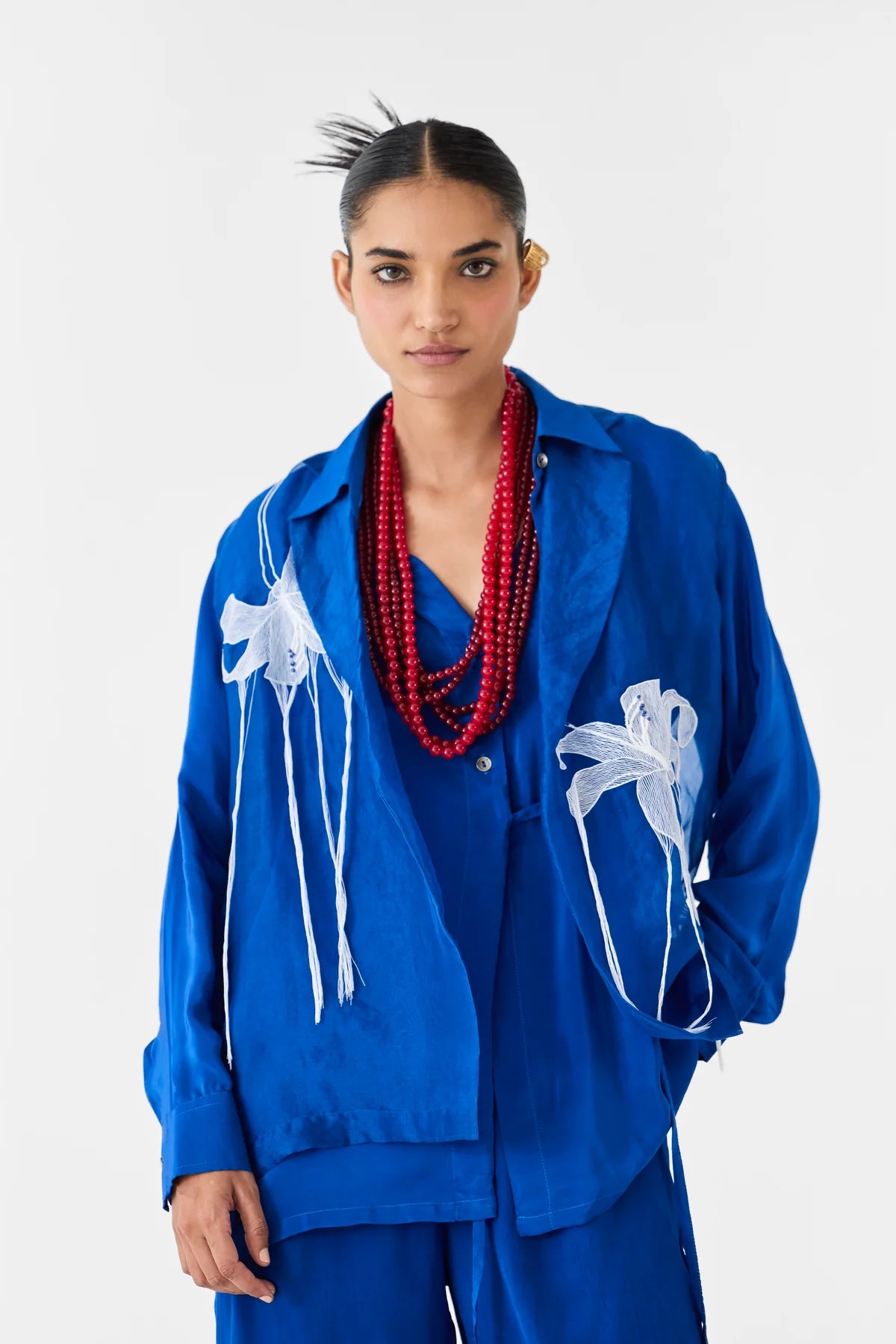 The Indigo Organza Jacket crafted from our stunning organza fabrication, trans-seasonal, is a statement piece. The jacket, made in our hand dyed organza has a collar and lapel. It has a straight fit. It has been hand embroidered with flower motifs with hanging threads. It can be paired with our matching Indigo shirt & Trousers Co-ord. Wear it with heels for an elegant look.