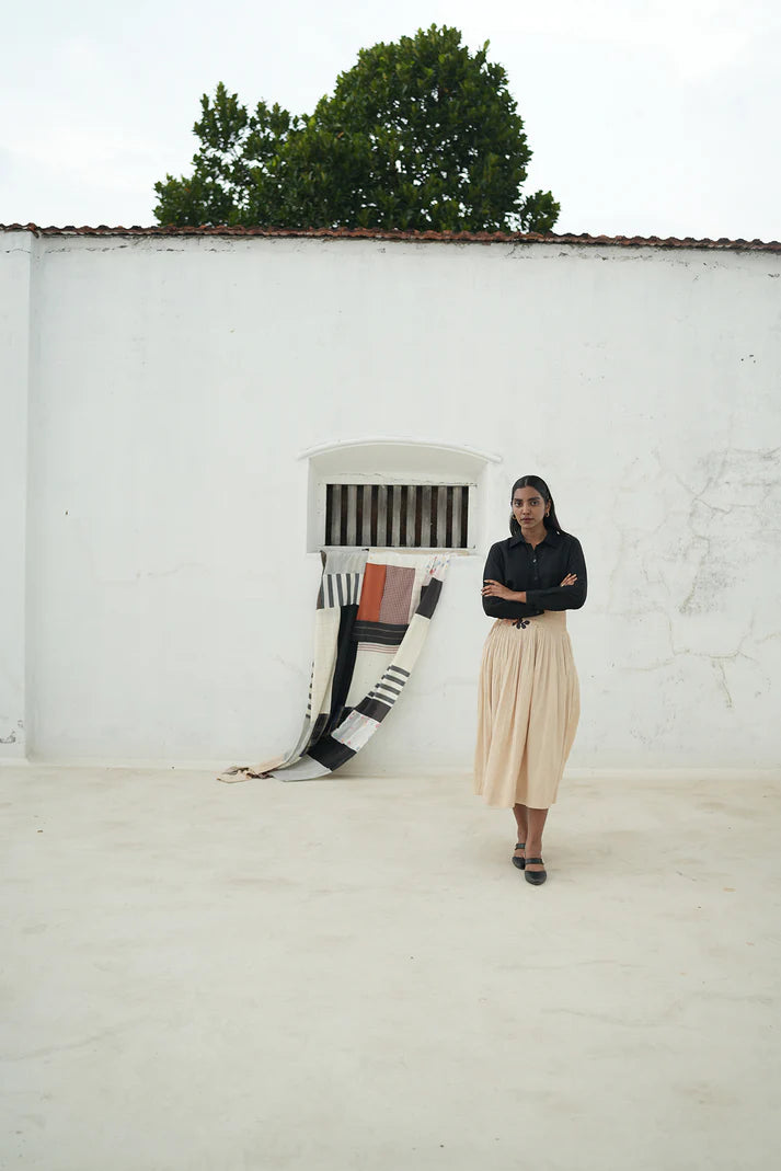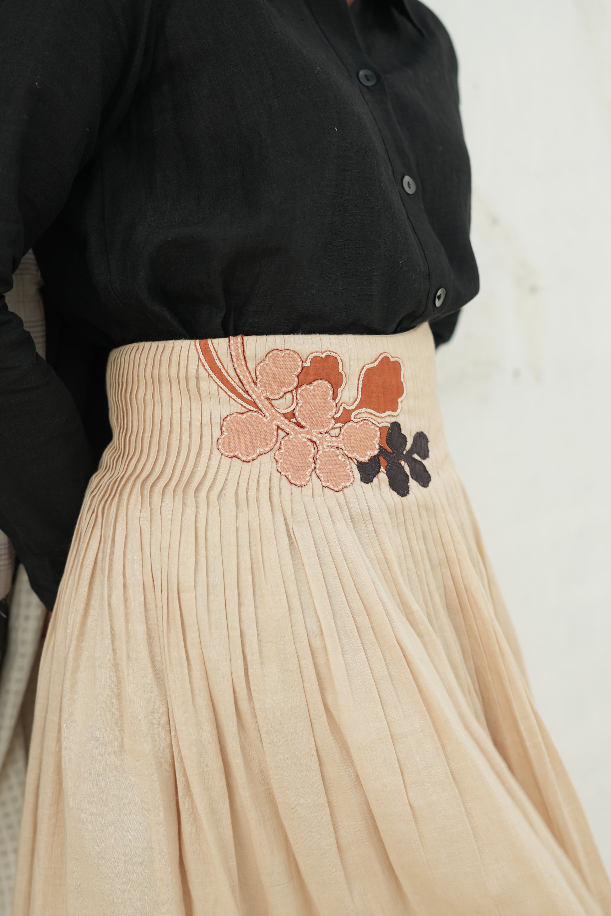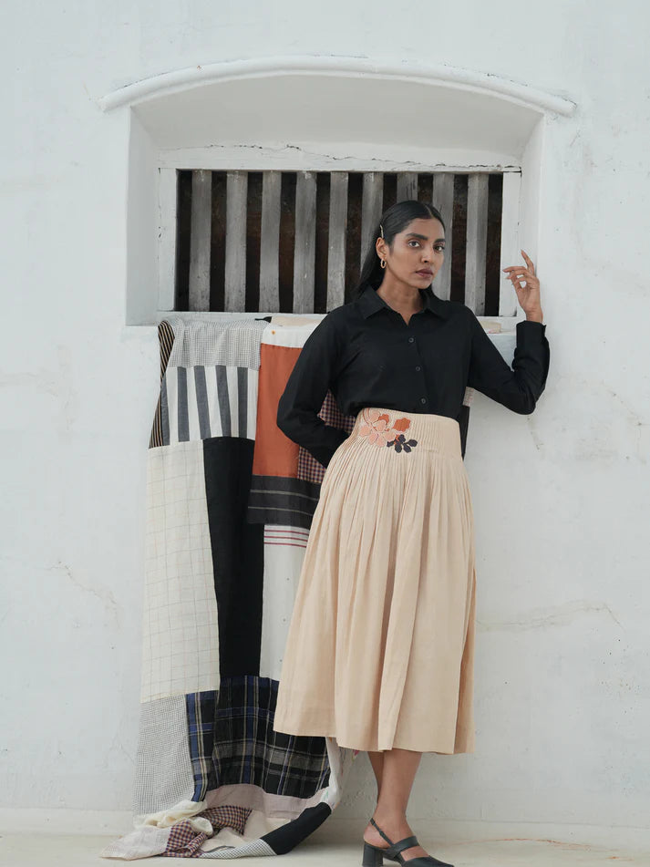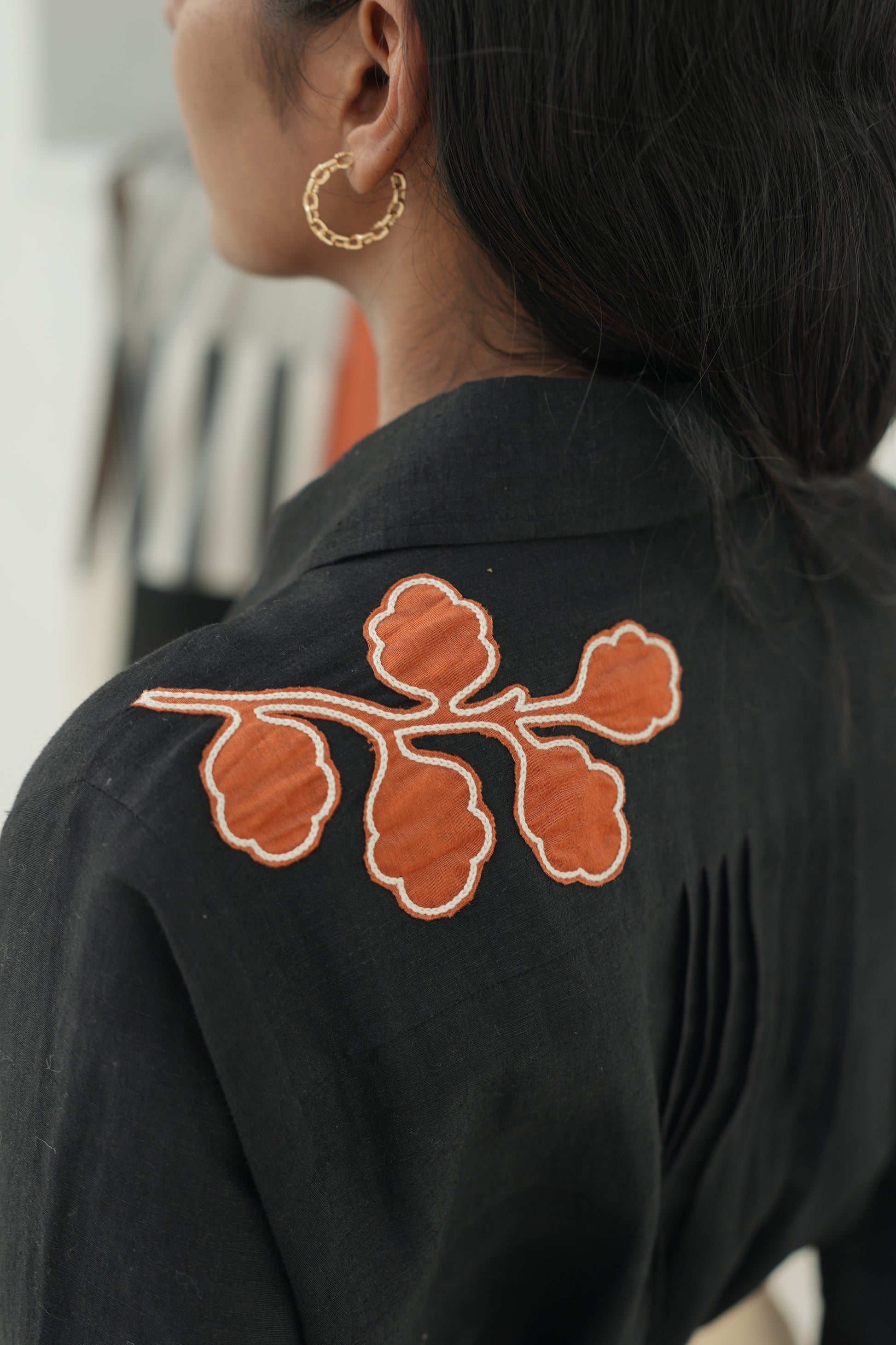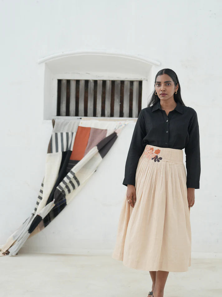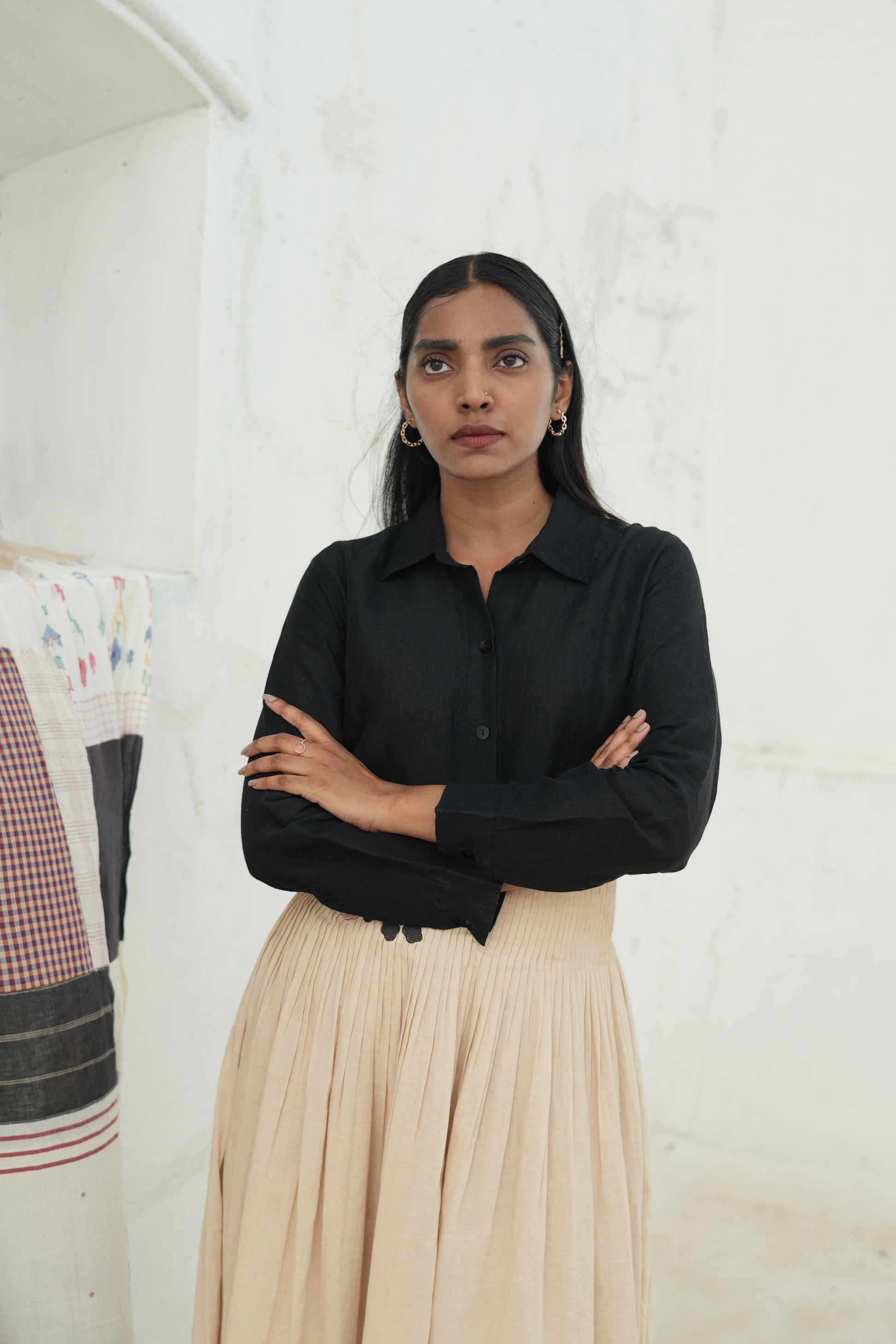 THE IVY SHIRT IN HANDLOOM COTTON linen, this shirt offers a breathable, lightweight feel with a naturally textured finish. The appliqué work on the left back shoulder adds a unique, handcrafted detail, while the center pleats at the back yoke create a structured yet fluid silhouette for added comfort and movement.