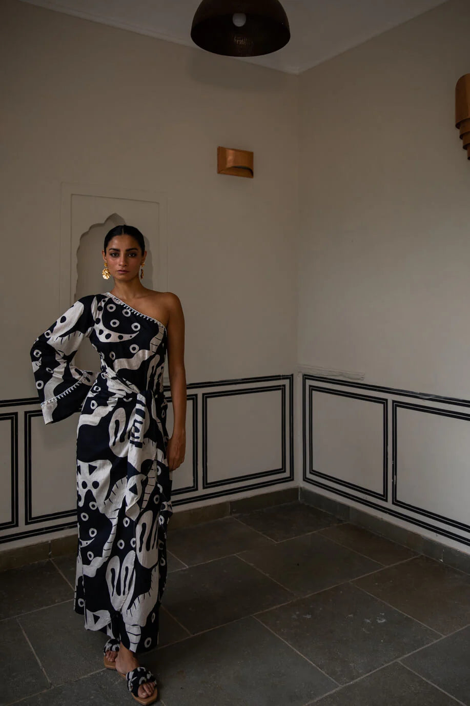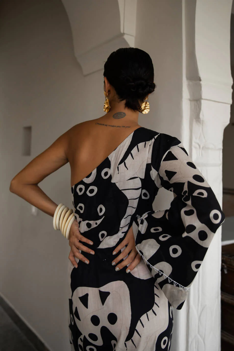 Patterned with an abstract black and beige screen print, our Jantar Mantar dress is a play of shapes and forms. Made from lightweight Modal fabric, the one-shoulder silhouette is embellished with embroidery on the neckline and sleeves. And don’t miss the adjustable waist tie-up that ensures the most flattering fit.
