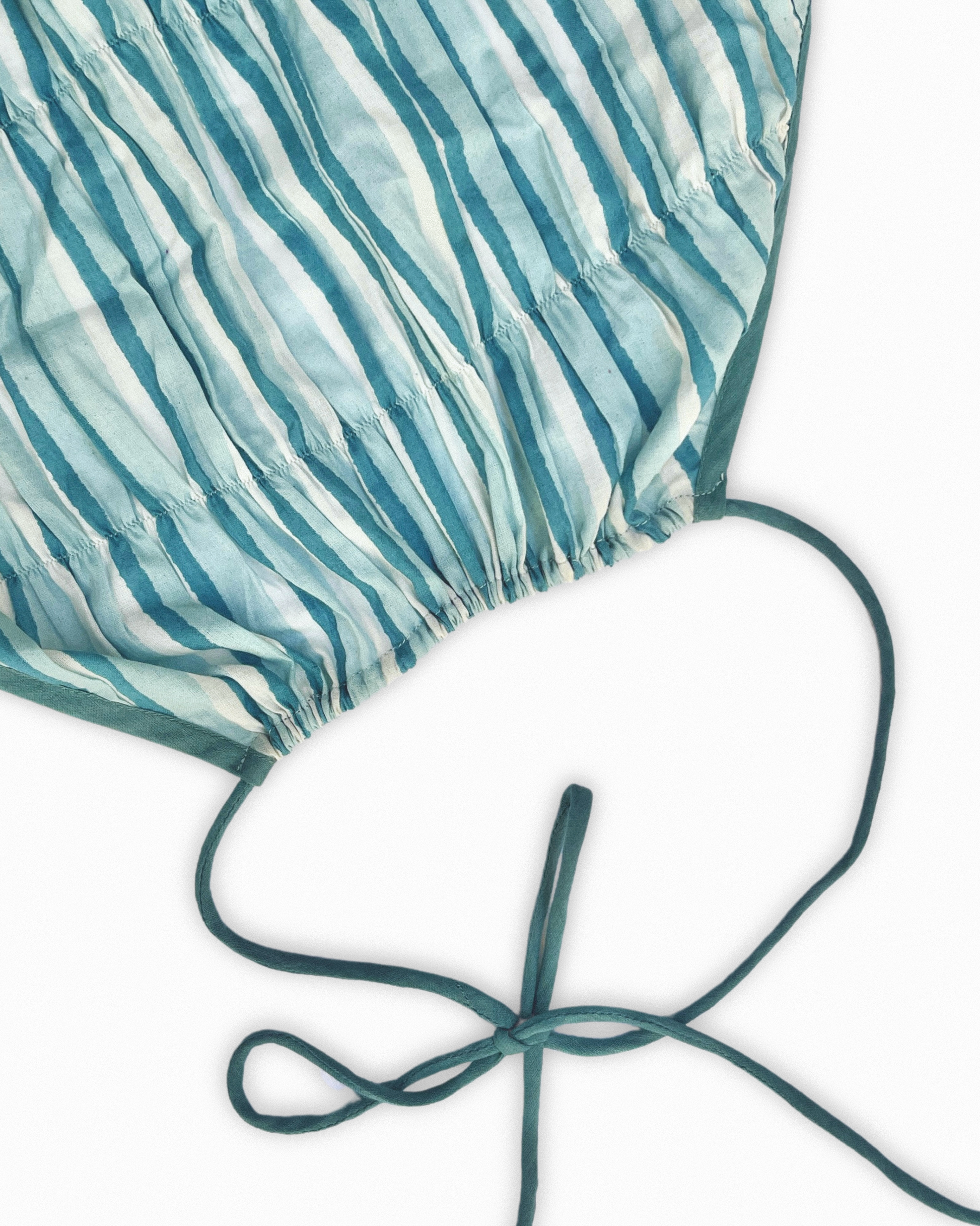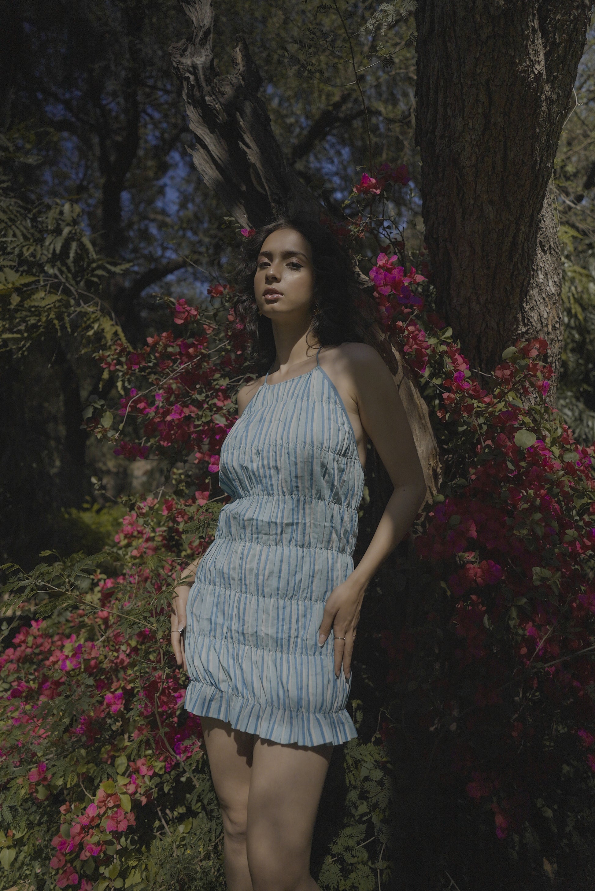 This halter-neck striped mini dress is defined by its shirring, creating a textured, form-fitting look that enhances movement while ensuring a comfortable fit. The open-back design adds an element of allure, elegantly showcasing the shoulders and upper back. Rendered in a soft blue hue with delicate vertical stripes, this dress embodies effortless charm crafted from lightweight an d breathable fabric.