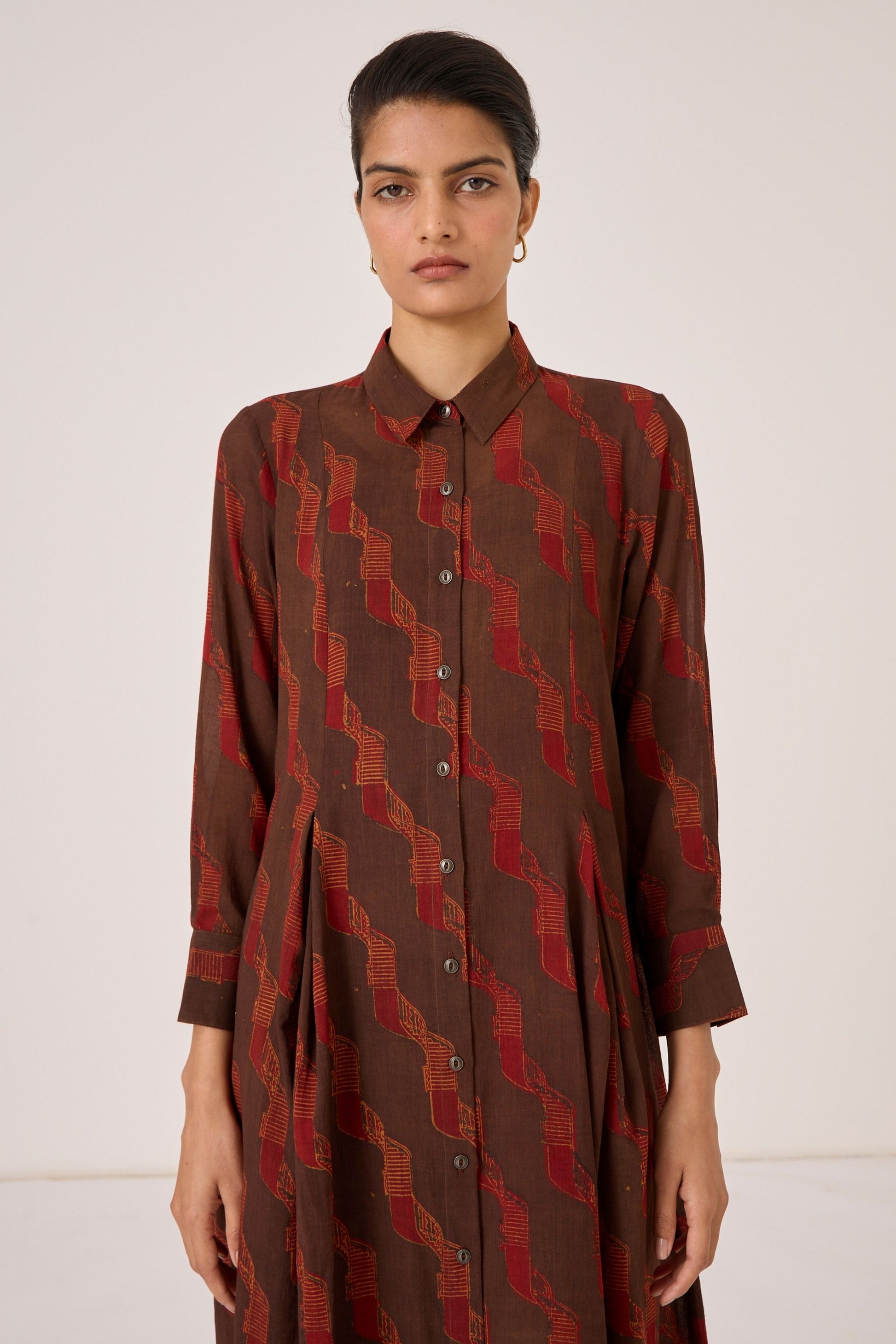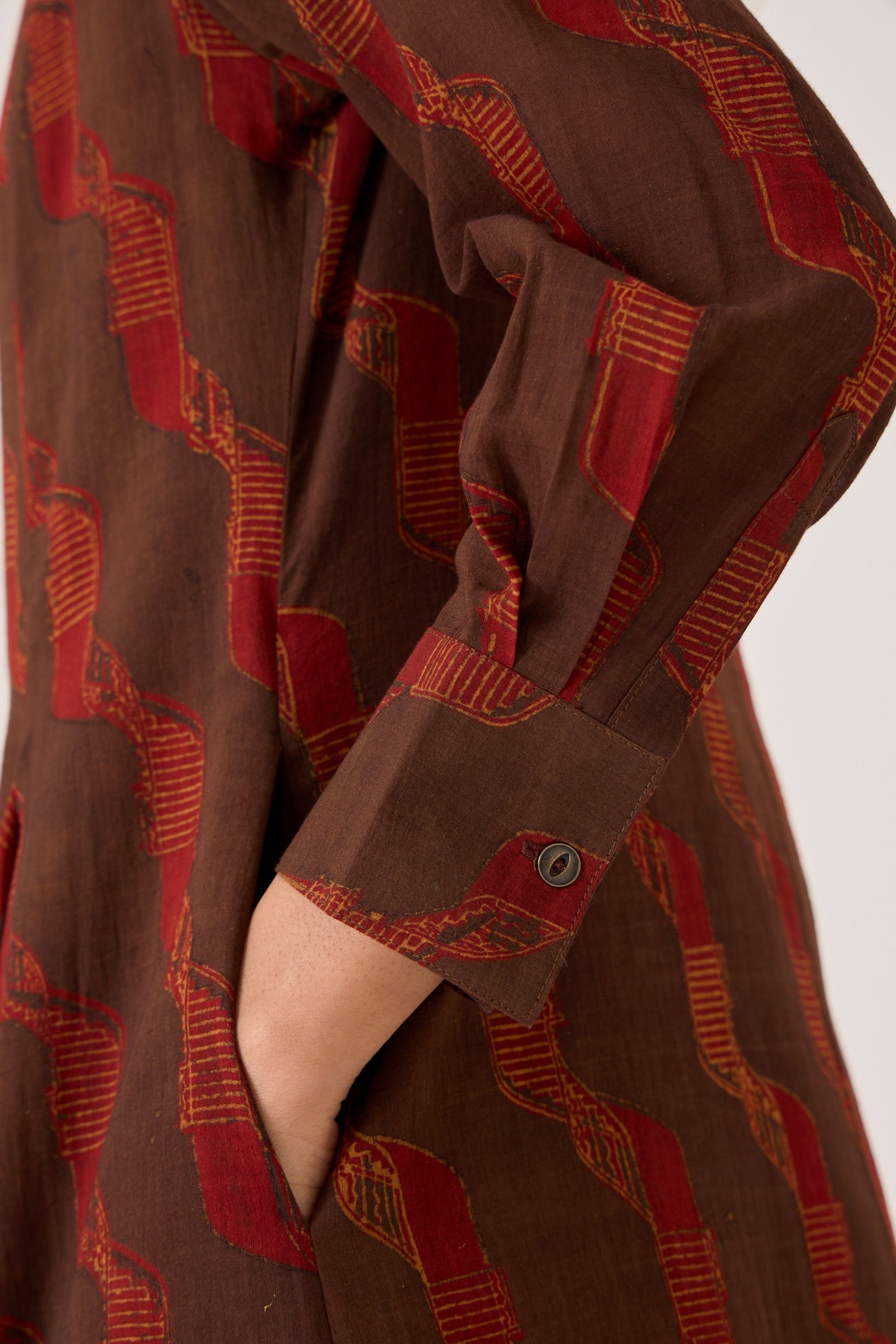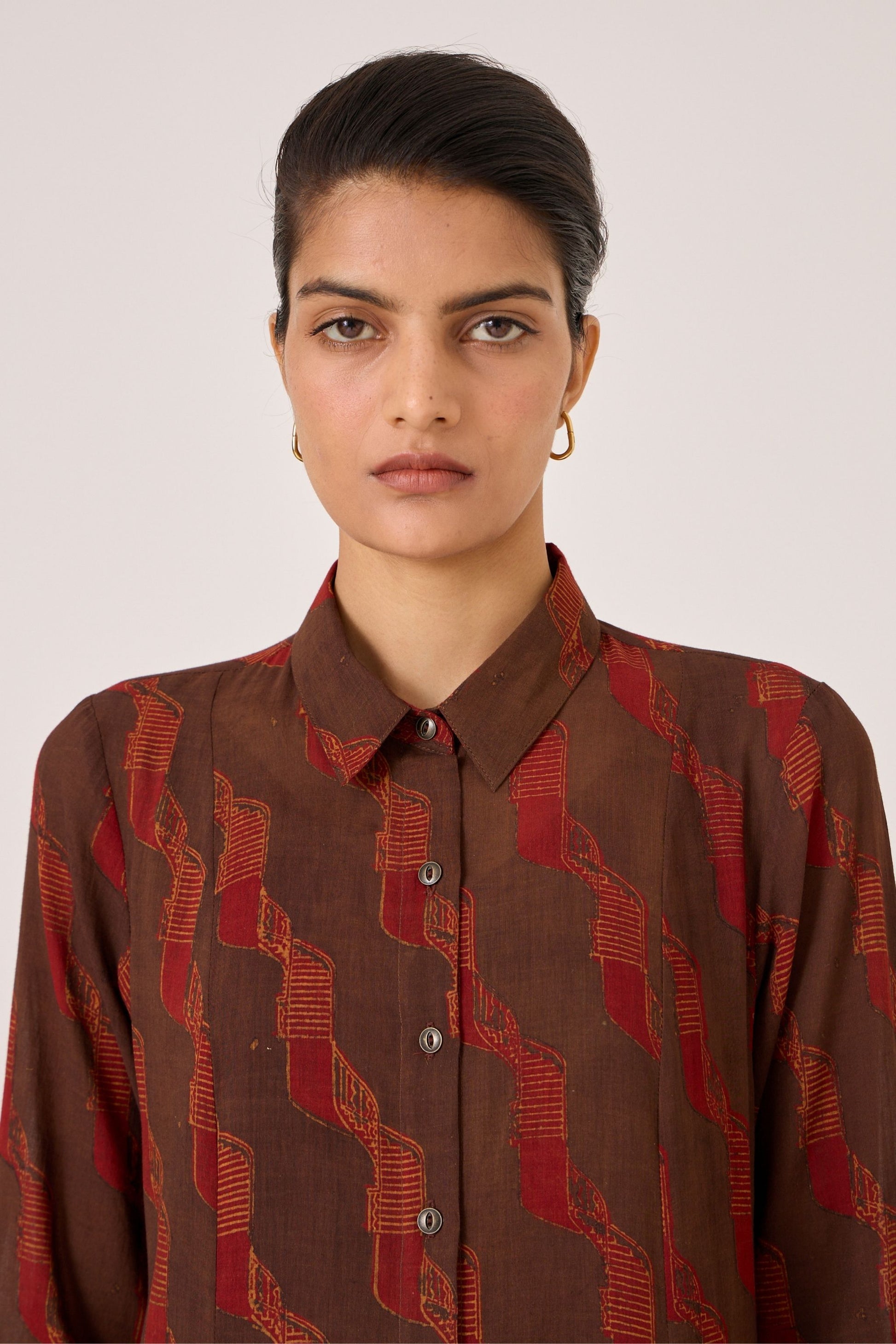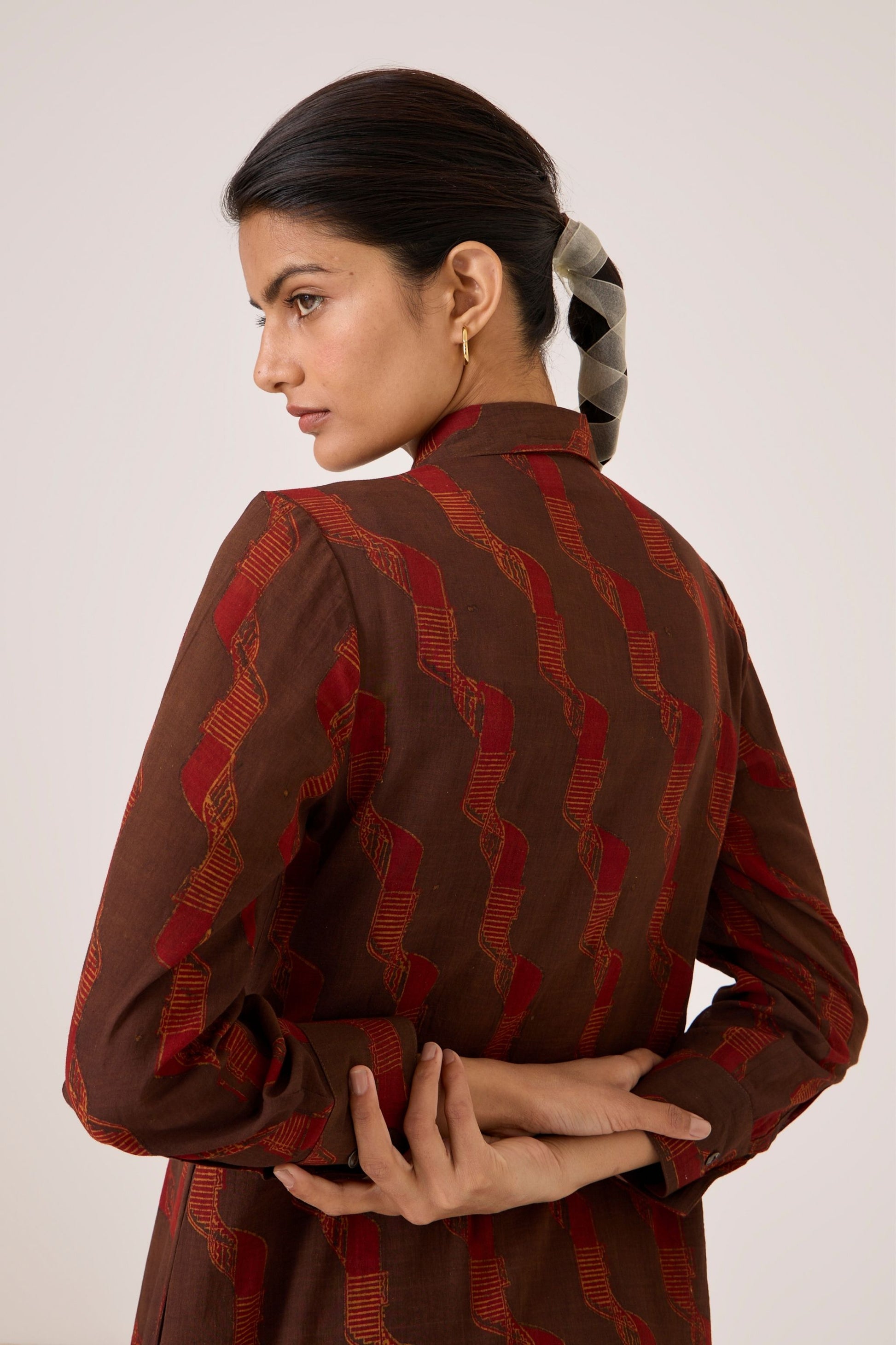 This signature ajrakh block print is designed in our studio and hand block printed by traditional artisans in Gujarat. Print placement may vary from garment to garment. Slight irregularities in print are common and speak to the hand processes involved.