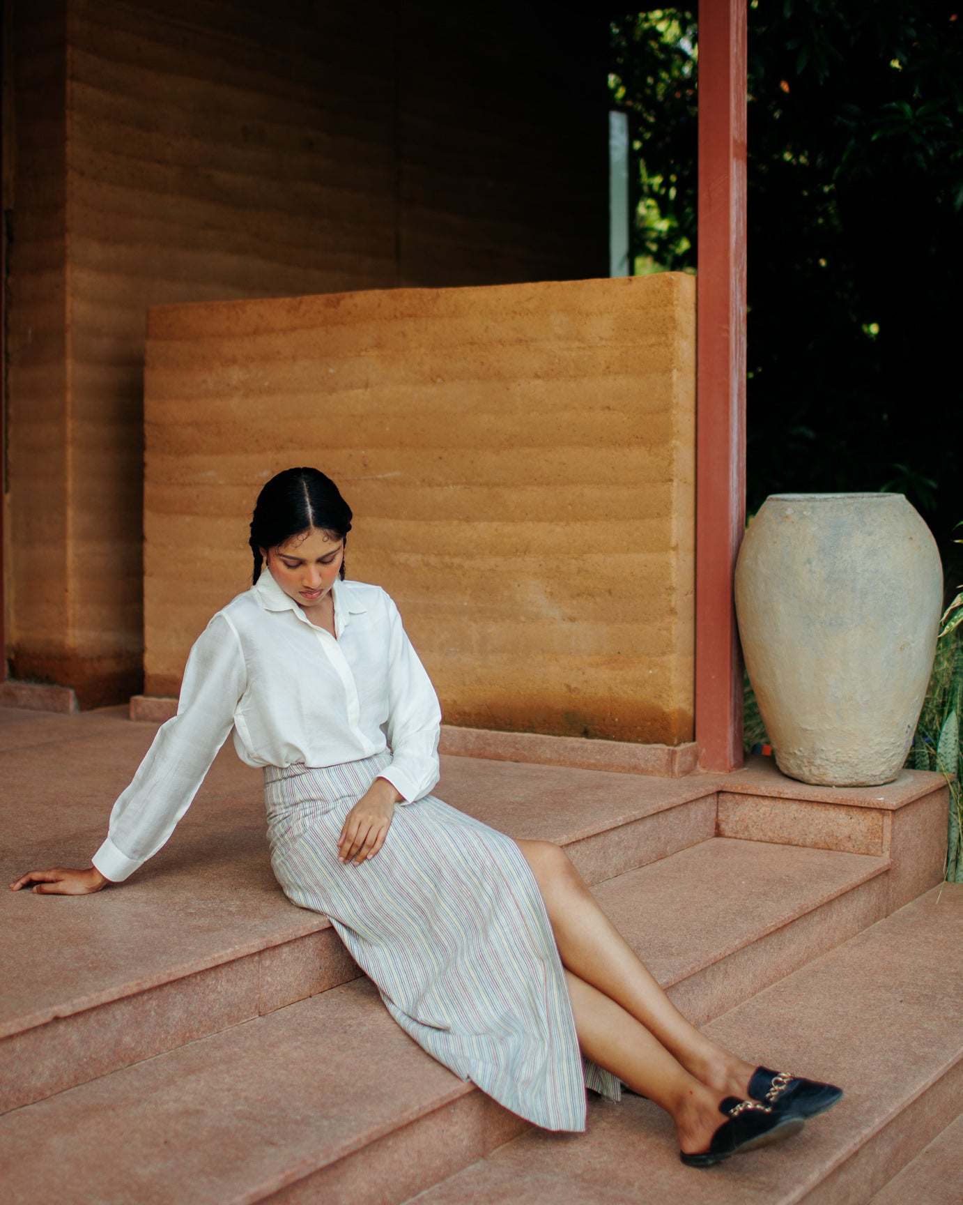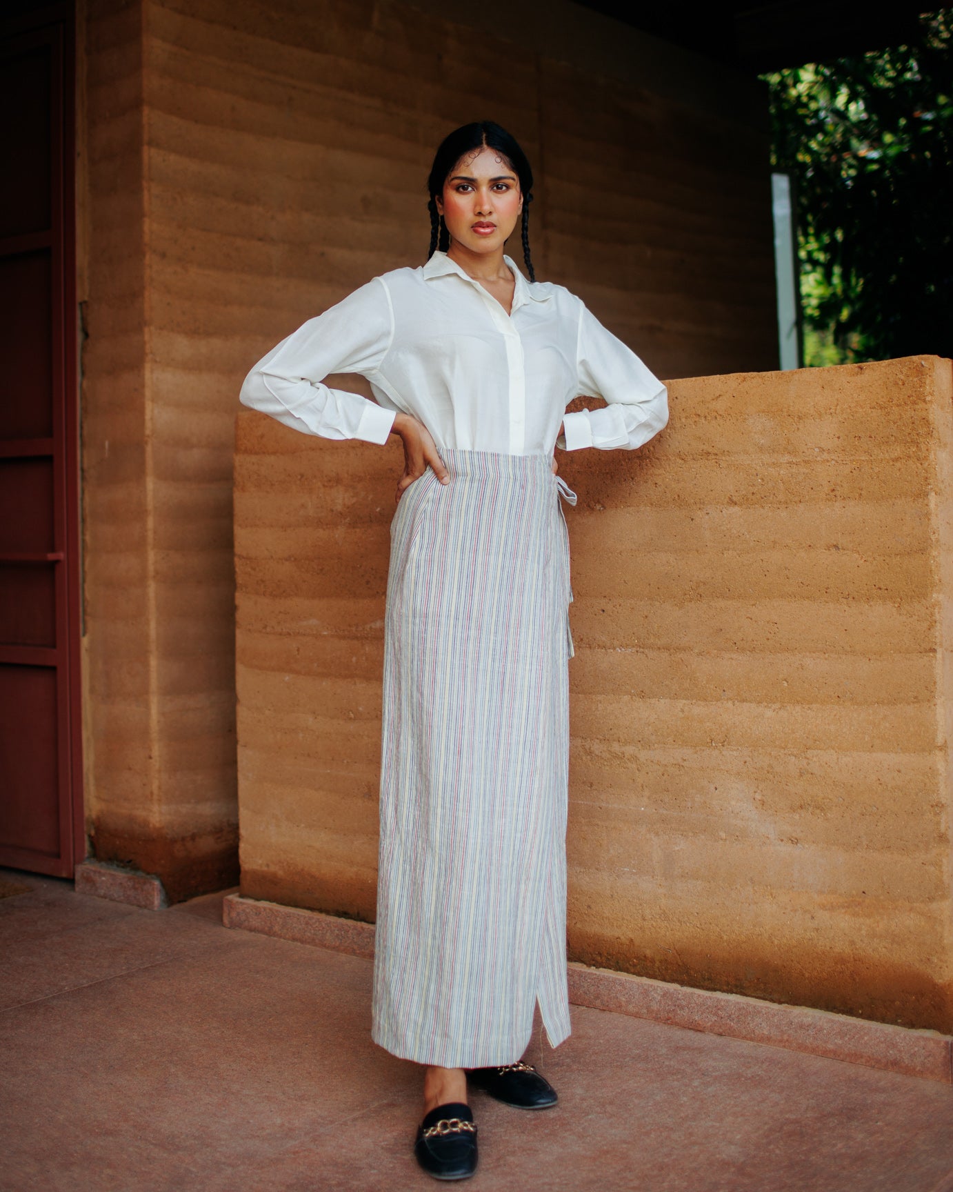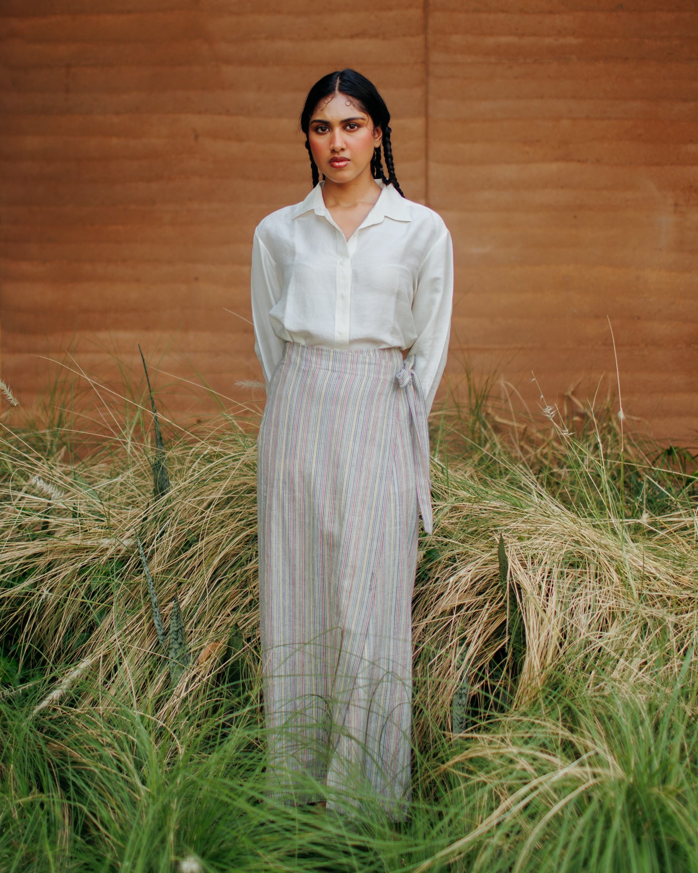 A striped wrap-around skirt made in Handwoven Khadi from Gujarat. Features an adjustable inner tie-up along with a belt tie-up in the front.