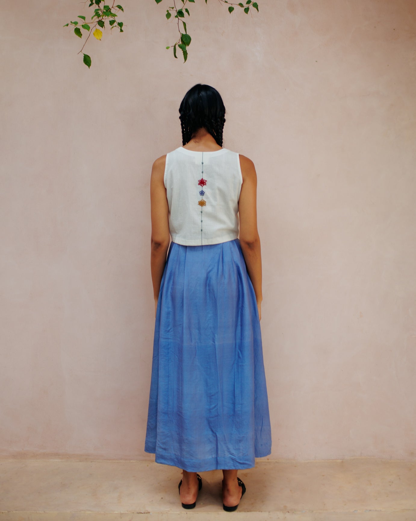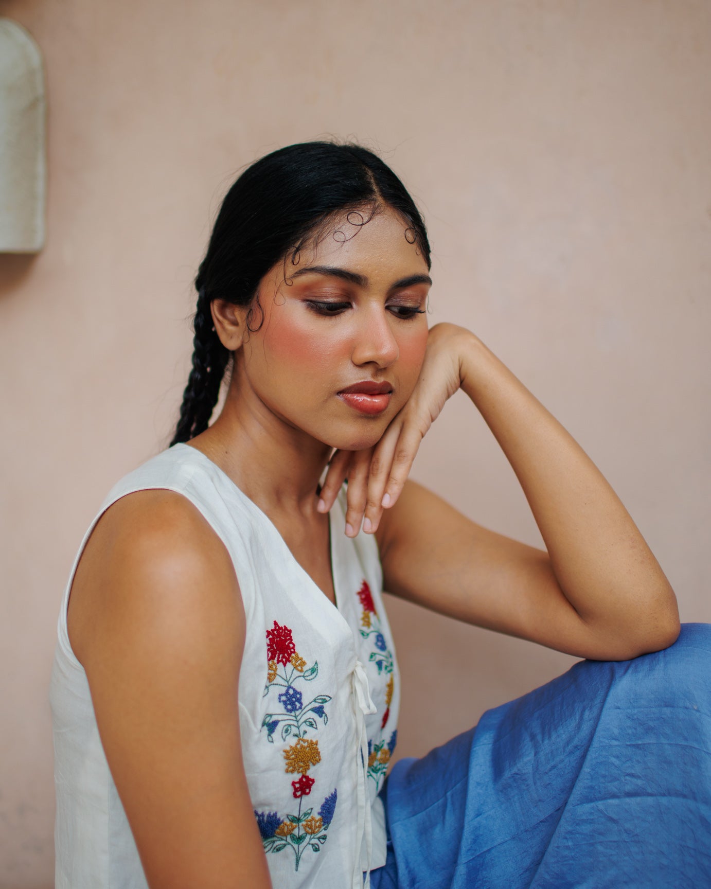 A relaxed fit tie-up vest made in hand spun handwoven Kora Cotton. It features Aari embroidered motifs on the front and back bodice.