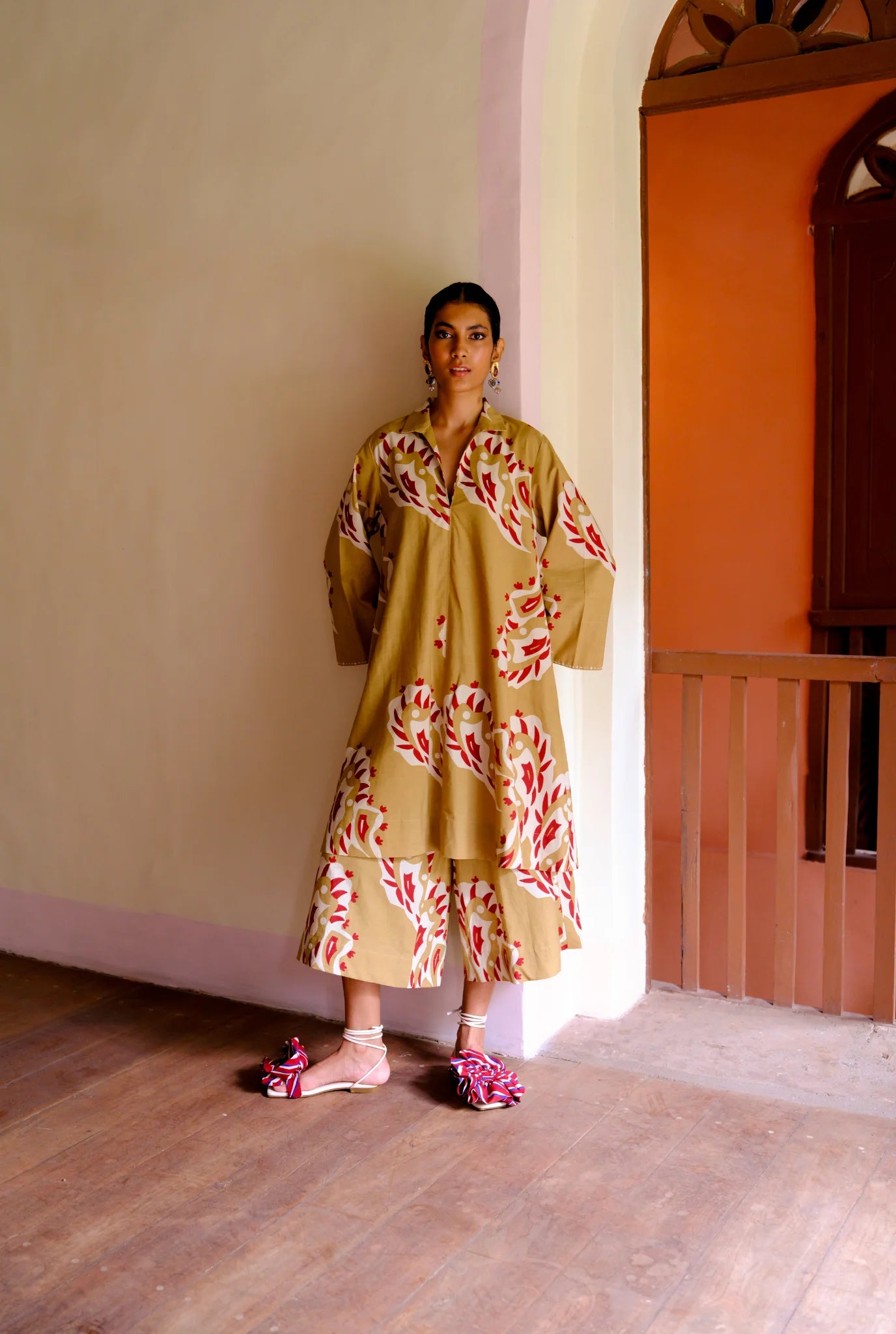She’s got the details! This semi-flared kurta with bell sleeves features a bold abstract print with hand-embroidered details on the sleeve. Made in super soft cotton, it’s roomy enough to lounge in all day long. The culottes, crafted in cotton, have a broad hem.